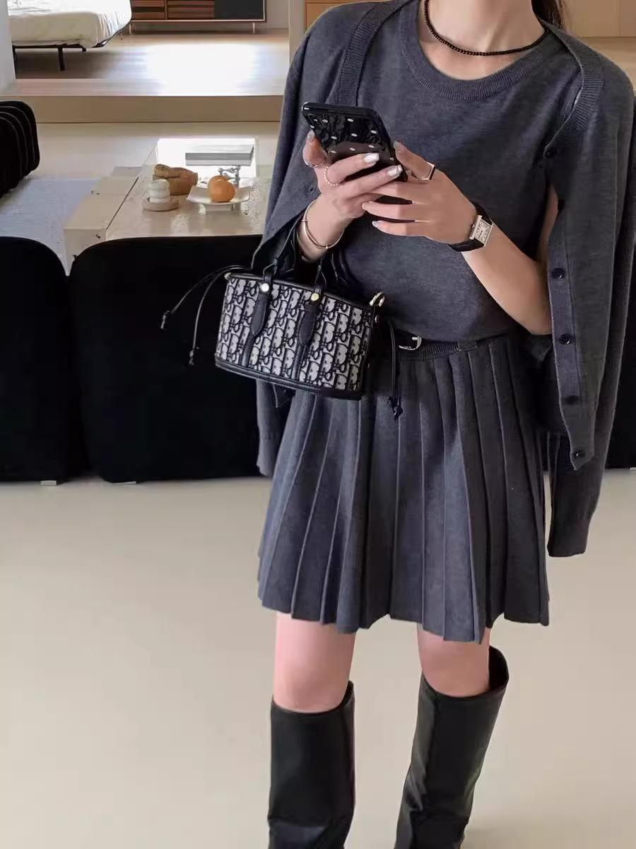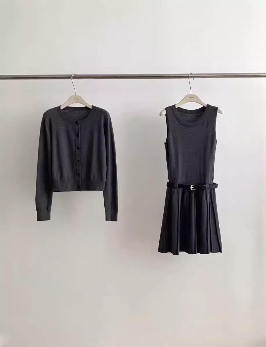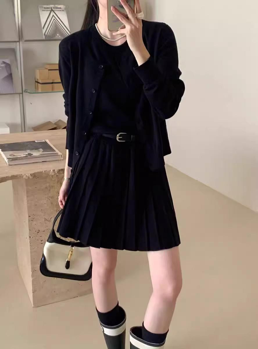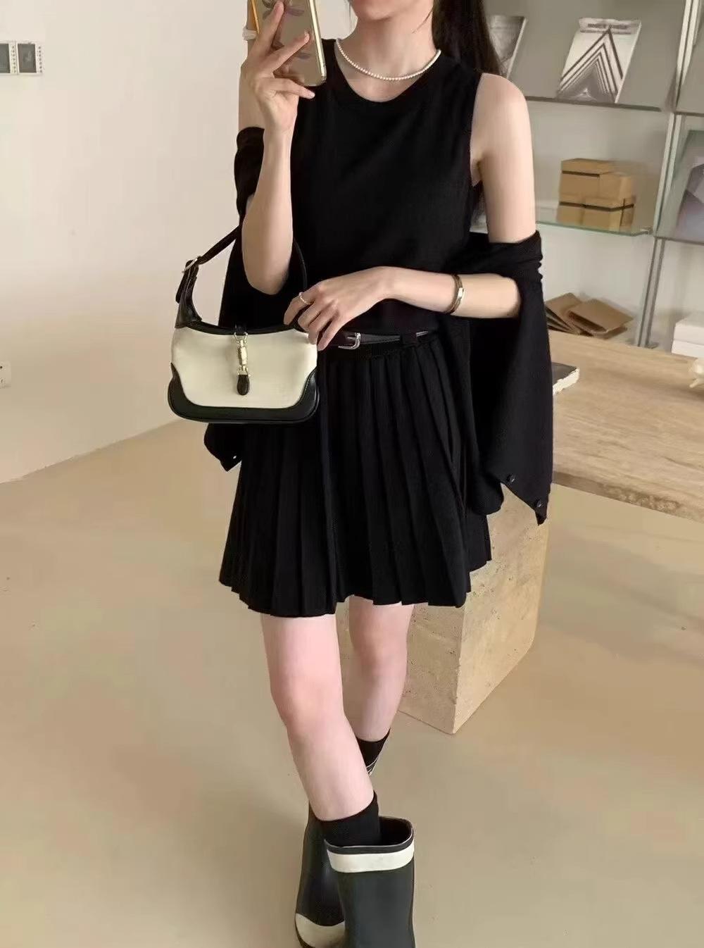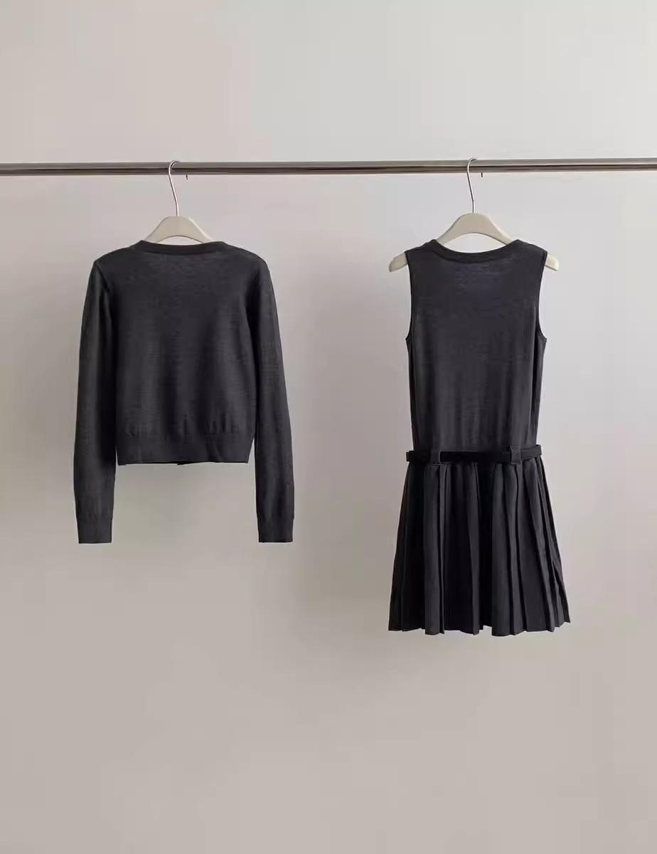 Vestido Corto sin Mangas Cárdigan de Punto Conjunto de Dos Piezas Moda Petite Estilo Coreano Abrigo Suéter Conjunto de Falda Plisada
