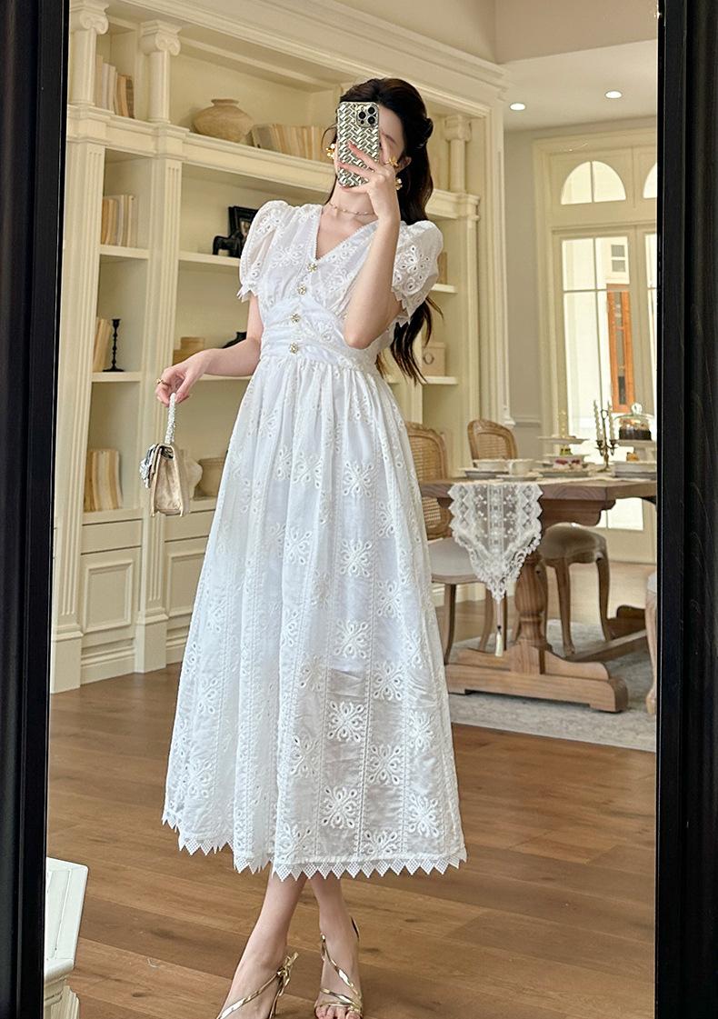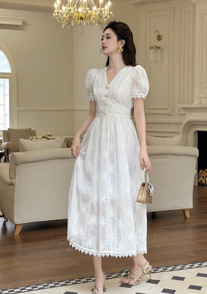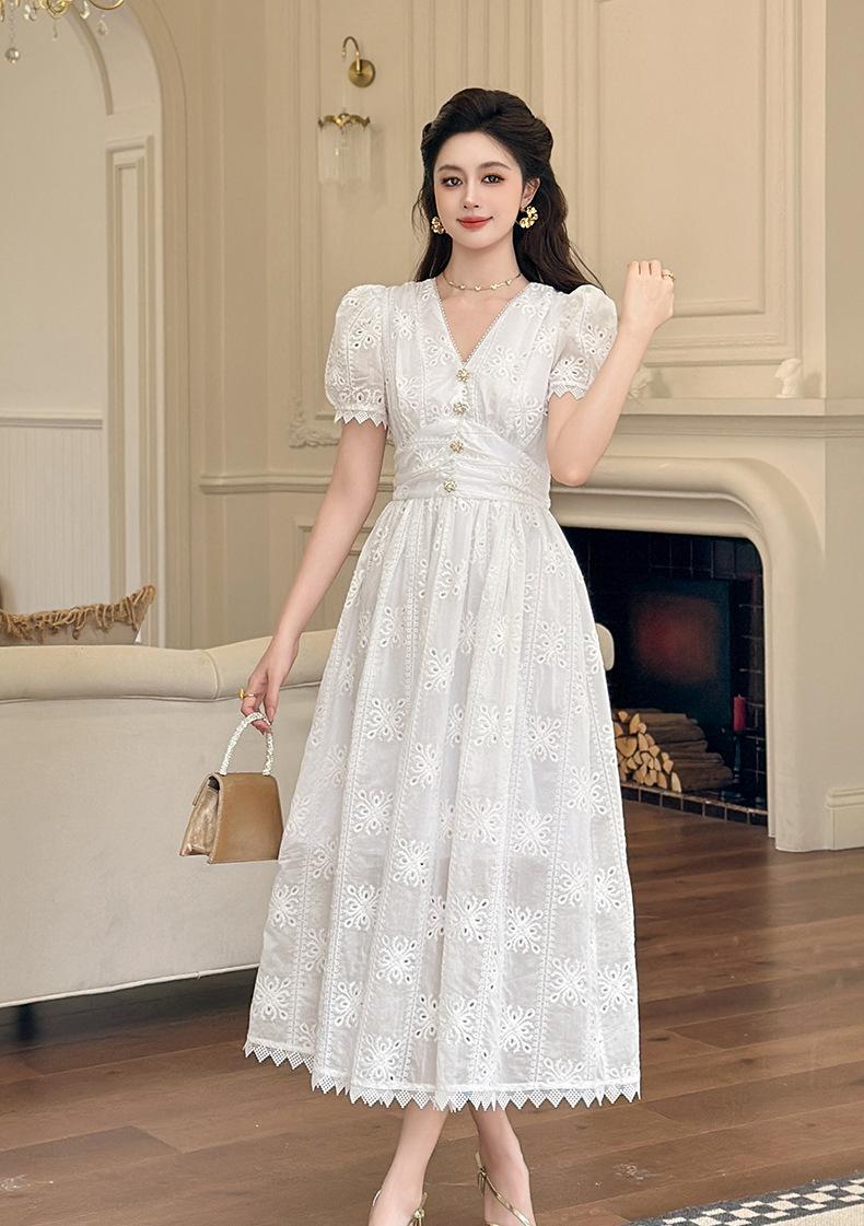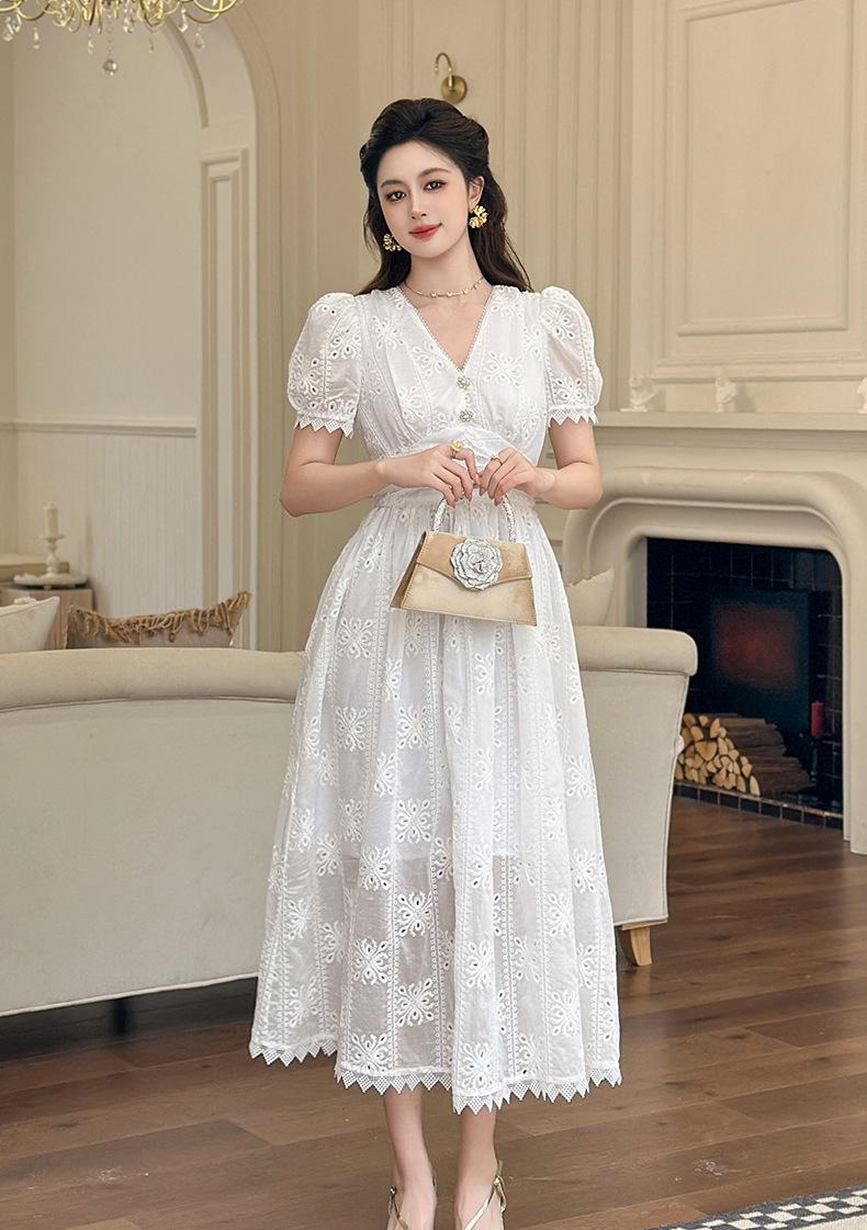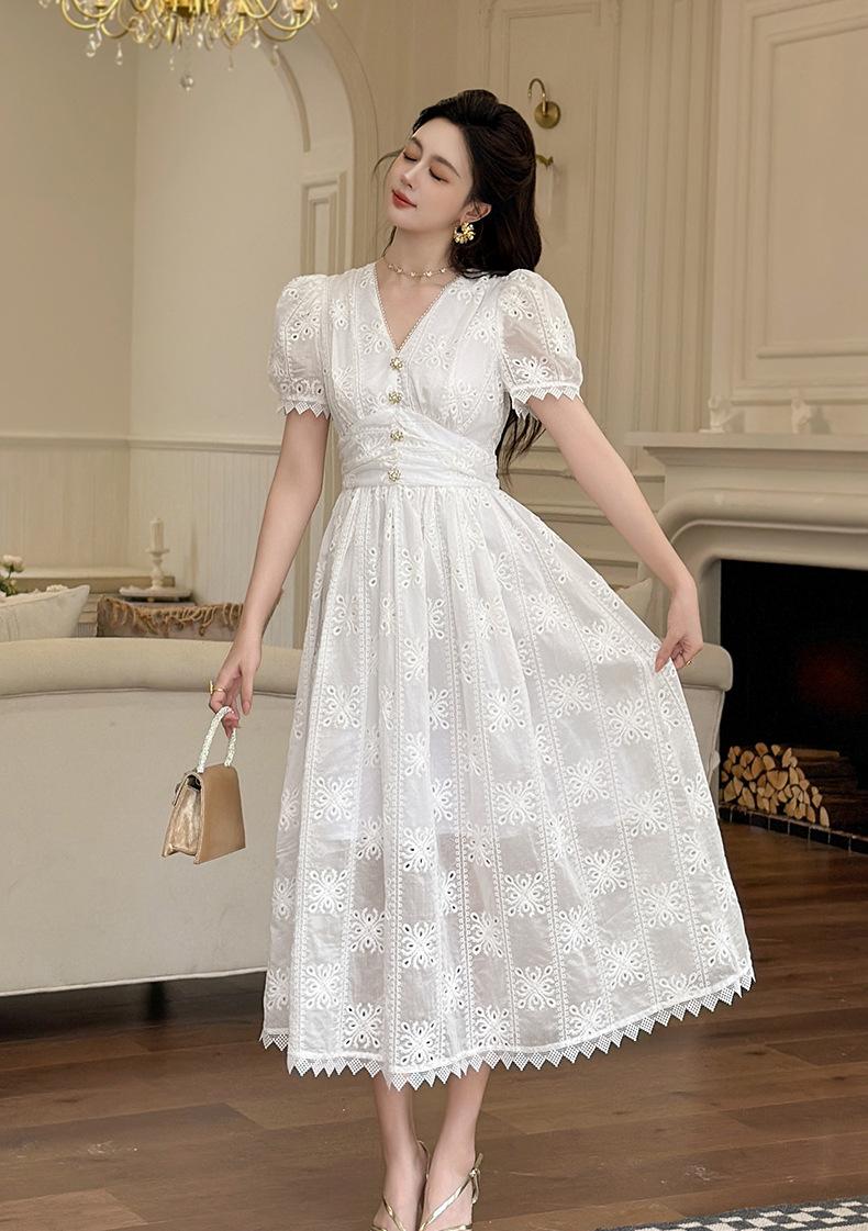 Verano Nuevo Temperamento Francés para Mujer Cuello en V Entallado Vestido de Encaje Blanco Estilo Gentil Vestido de Hada 45223