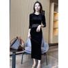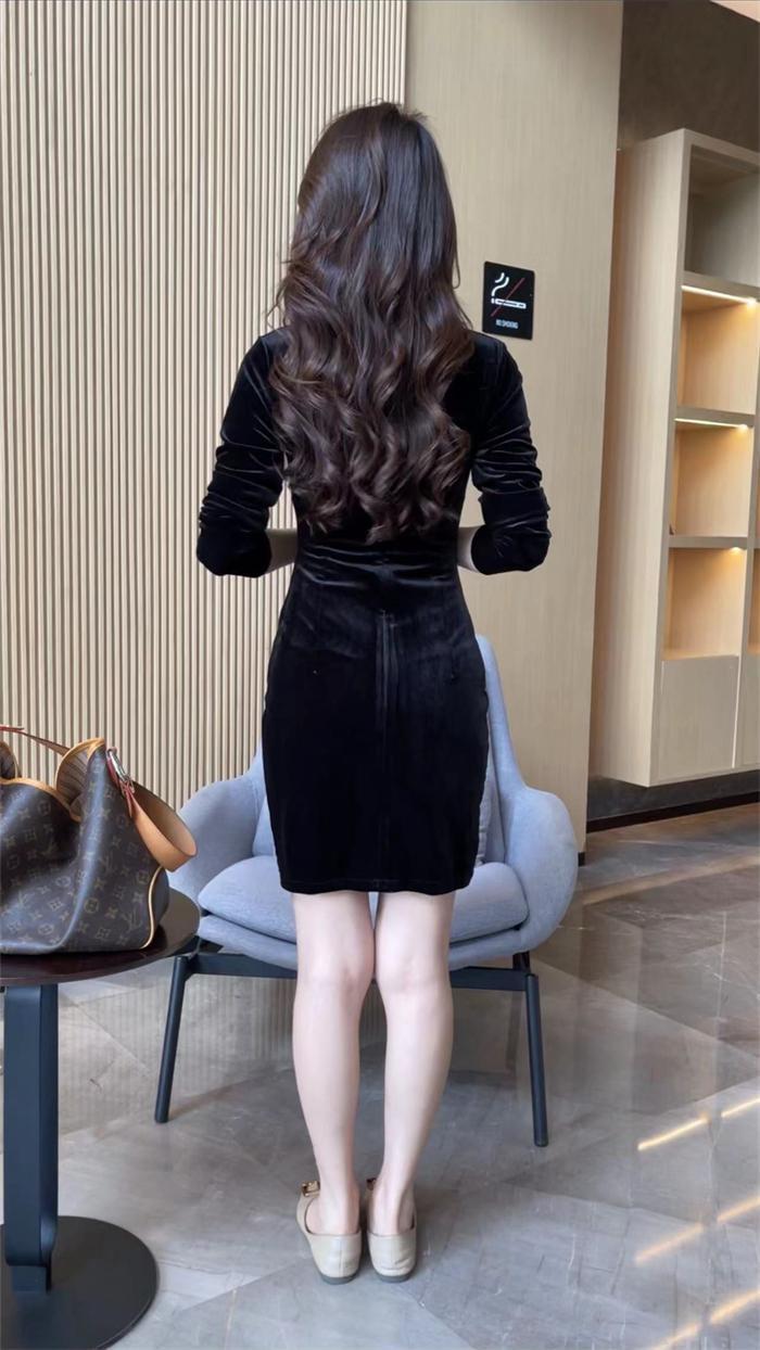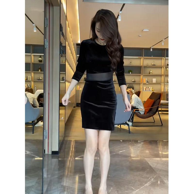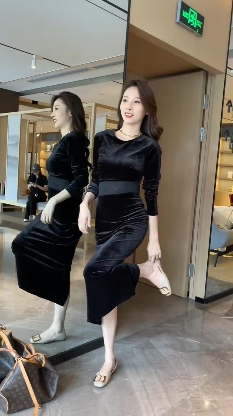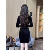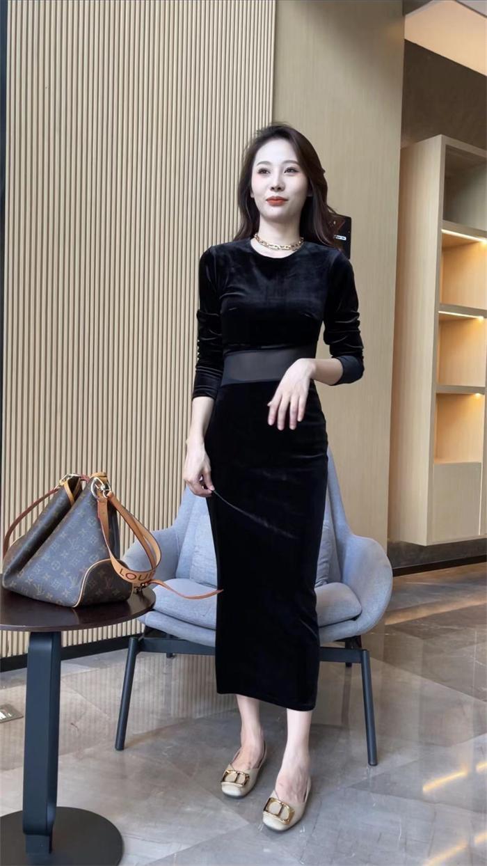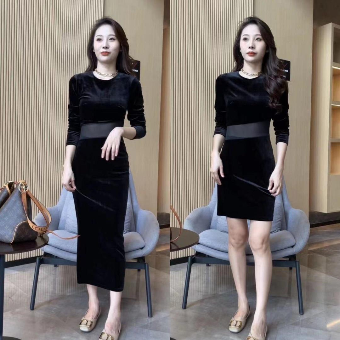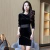 Otoño 2025 Nuevo Vestido de Manga Larga para Mujer Estilo Hepburn Francés Adelgazante Terciopelo y Malla Patchwork de Alta Gama