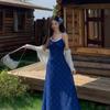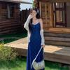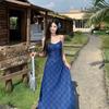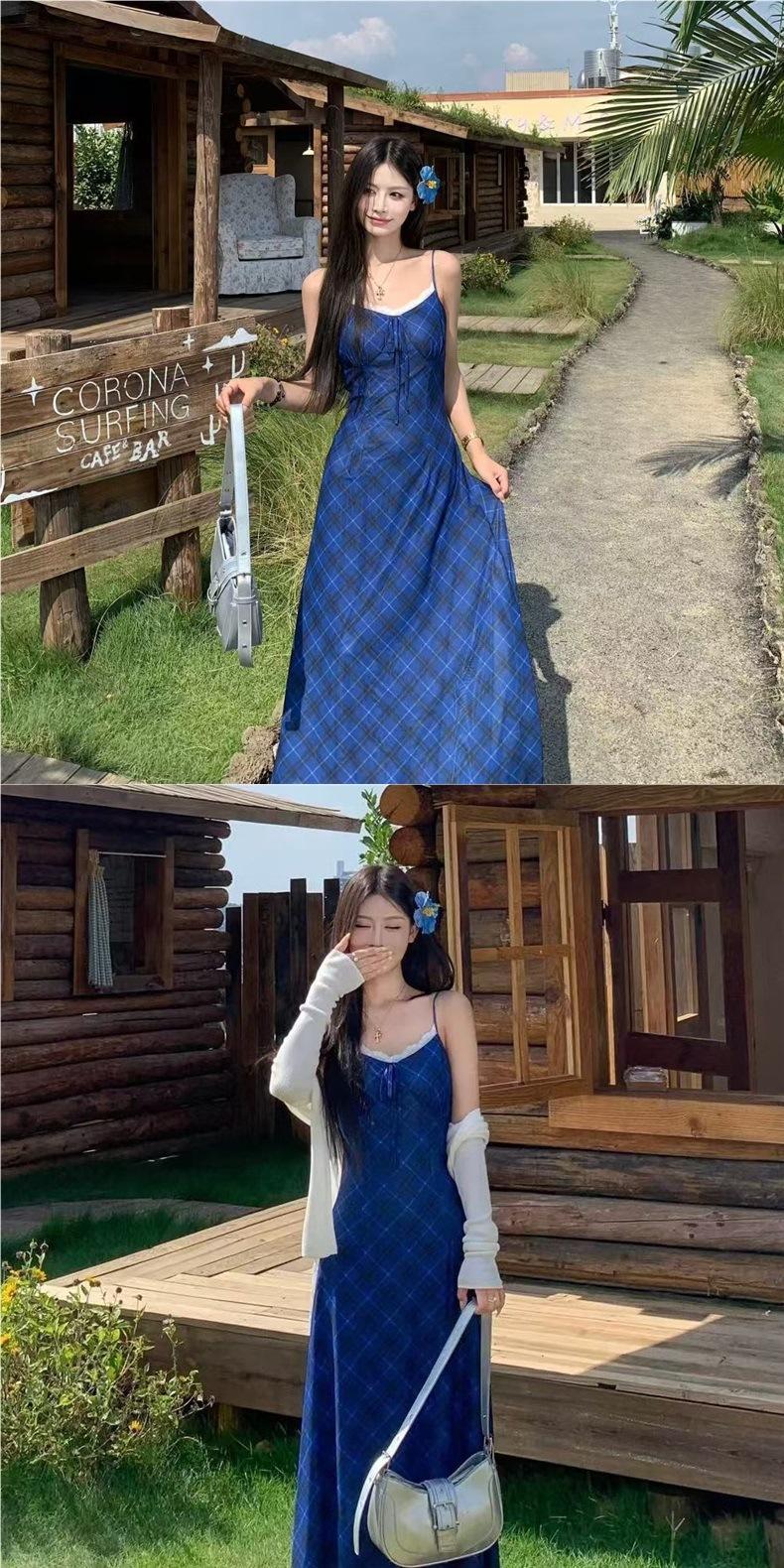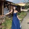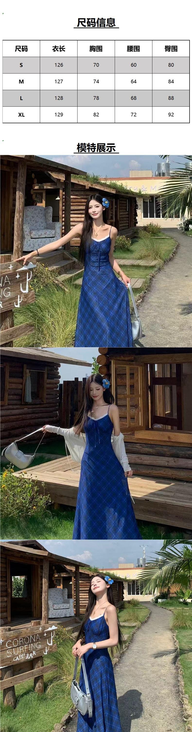 Nuevo Vestido de Verano Azul Retro Francés con Tirantes Adelgazante Cuadros Nuevo Temperamento Adelgazante Vestido Largo Súper Hada
