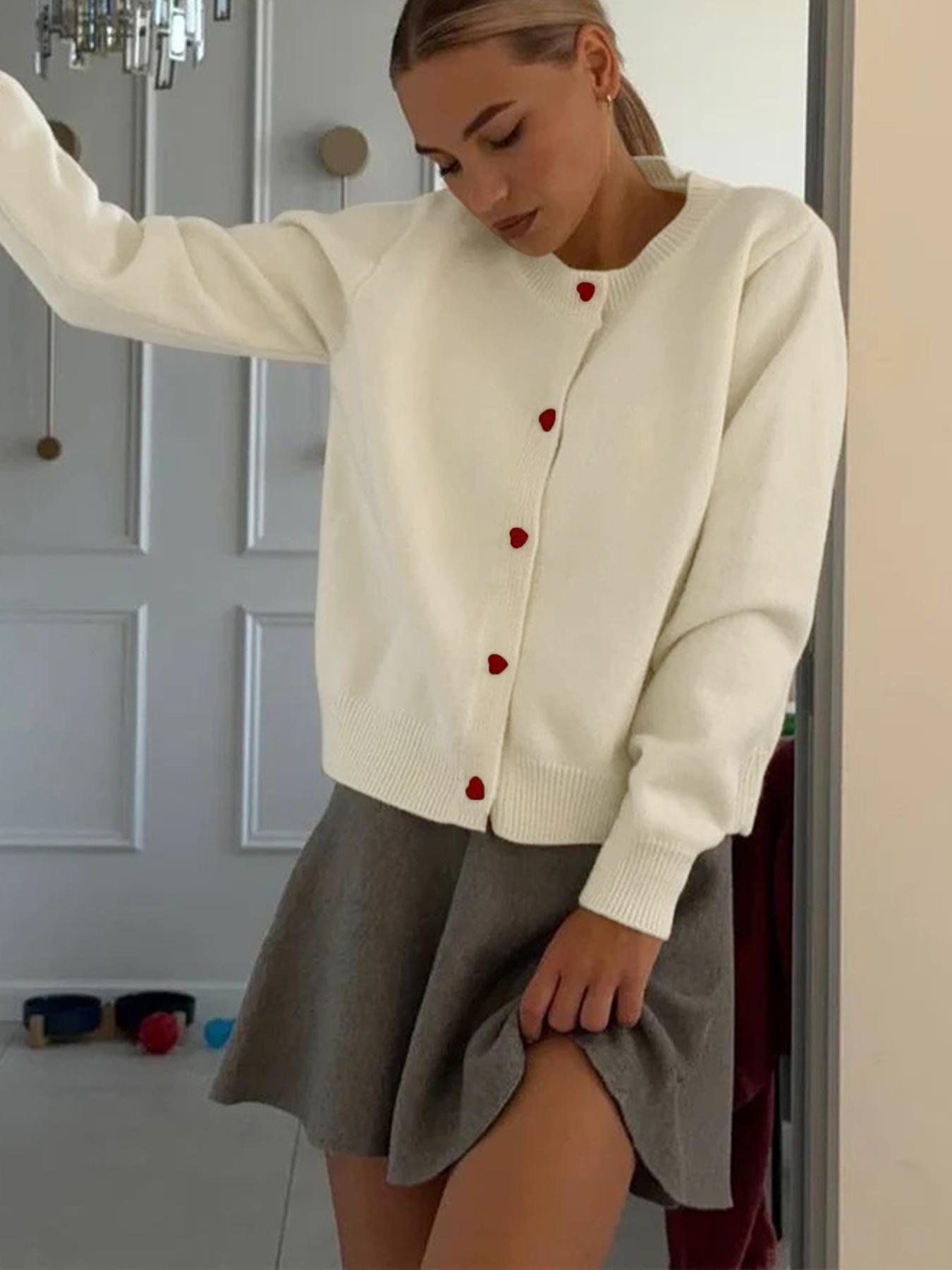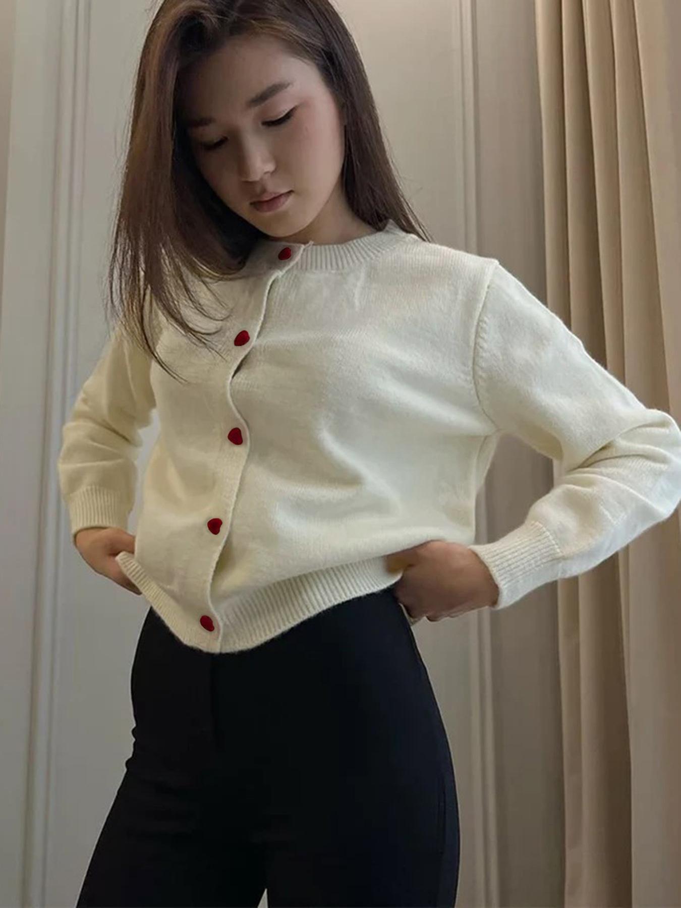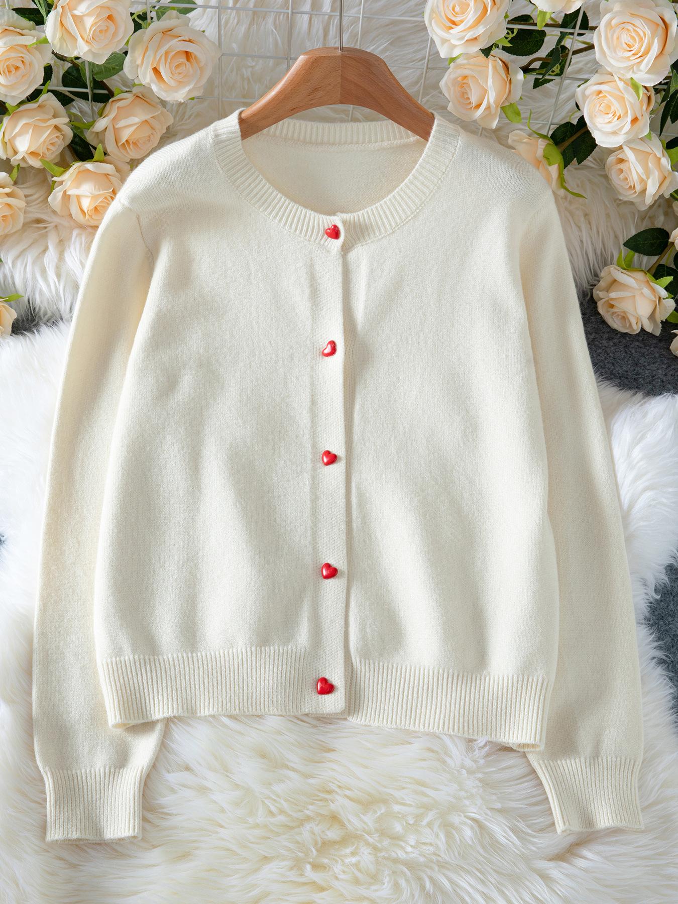 Cárdigan elegante de punto para mujer de otoño e invierno transfronterizo, suéter de color sólido con cuello redondo y botón en forma de corazón, cárdigan para mujer con bajo acanalado
