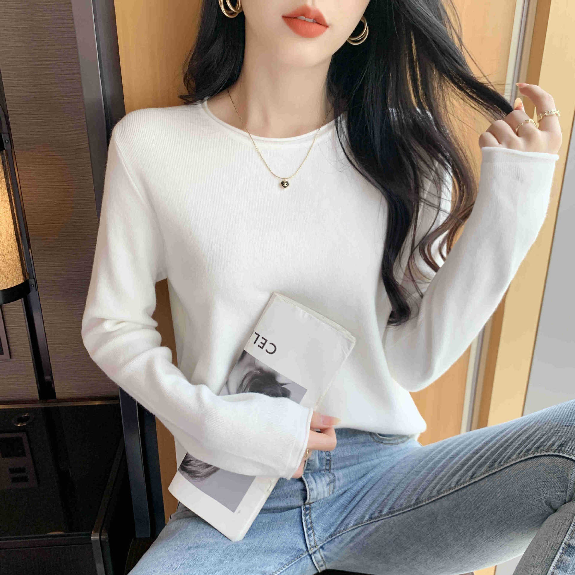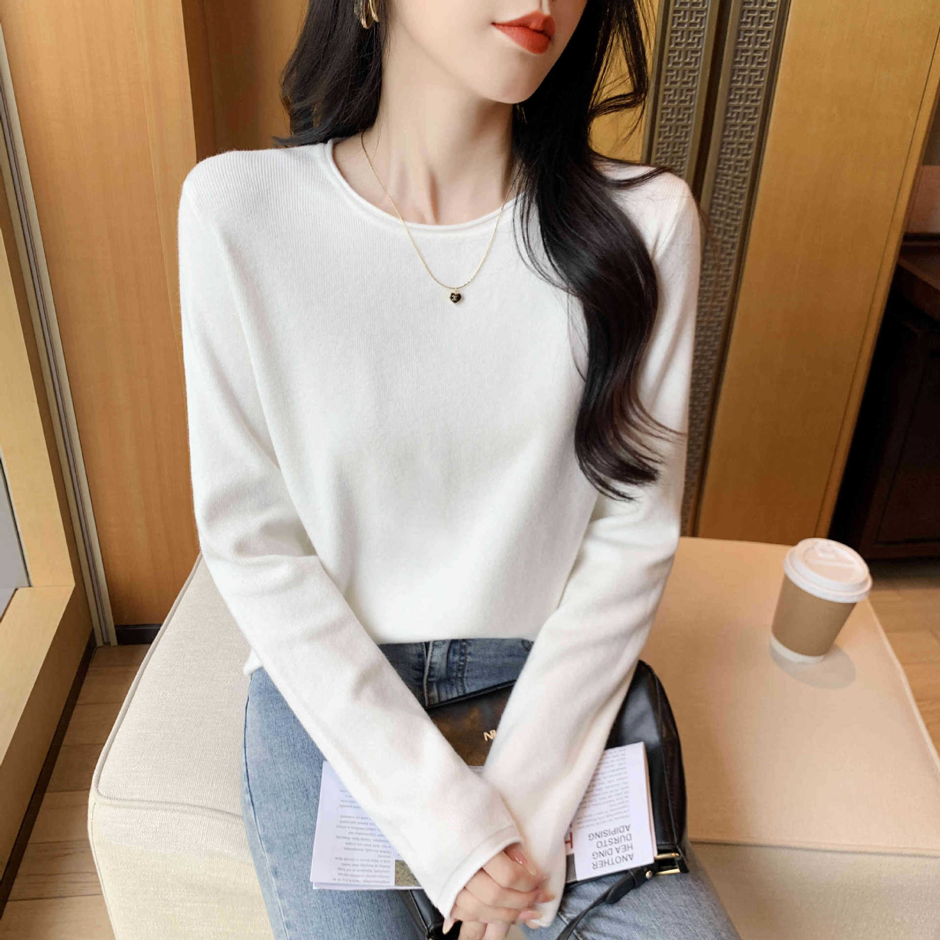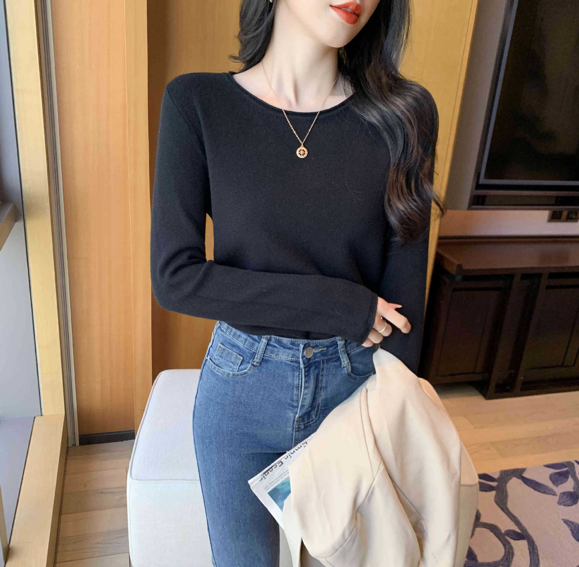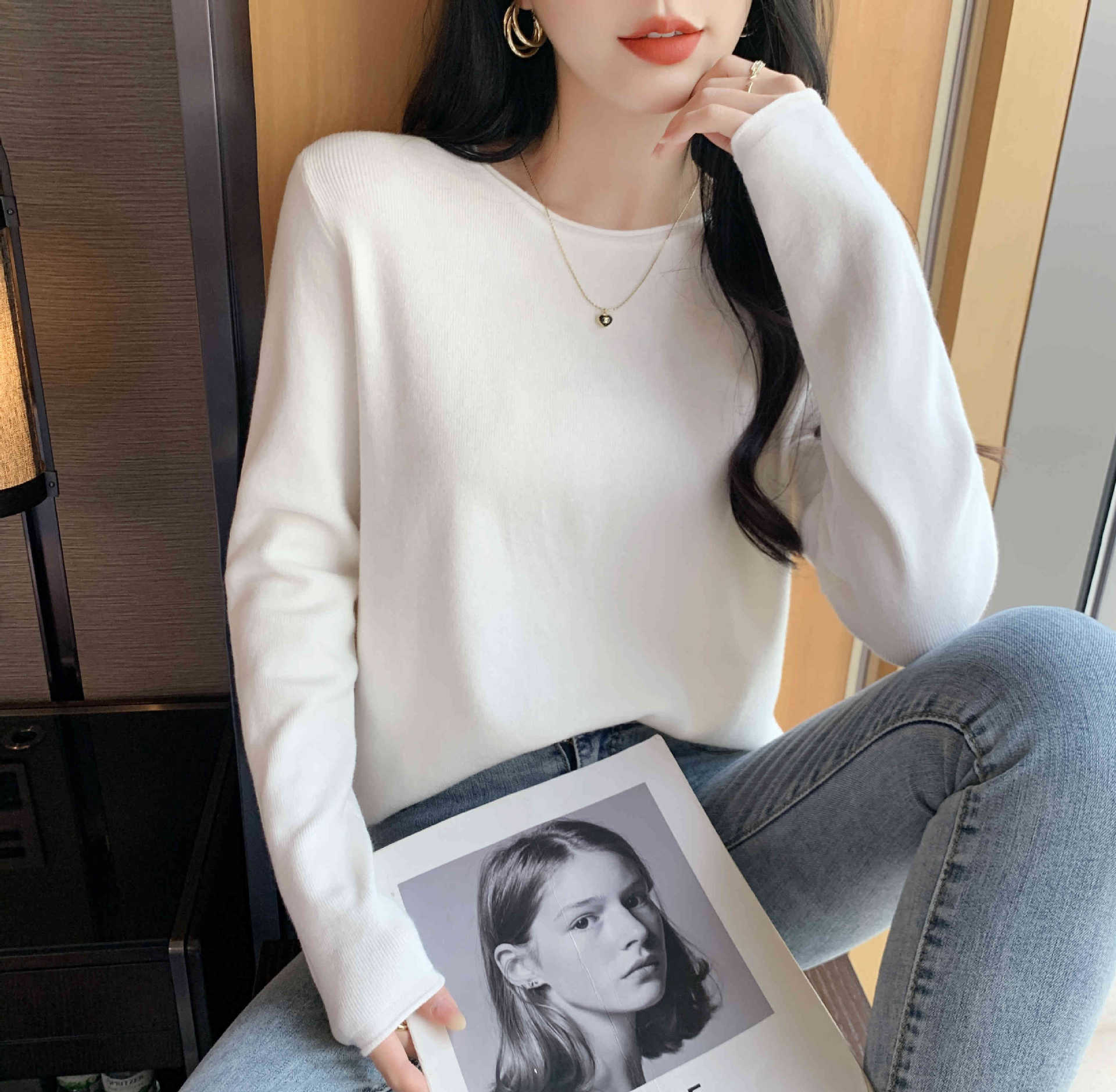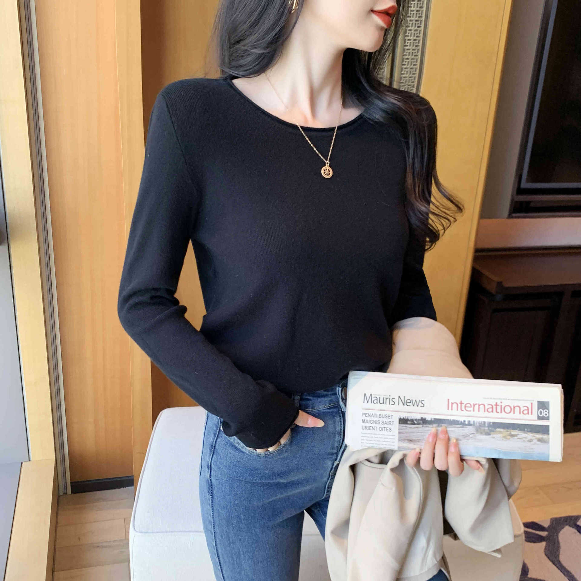 Suéter de punto suave y acogedor para mujer, Primavera 2025, Camisa básica casual sencilla de estilo coreano, Top interior de cuello redondo de color sólido