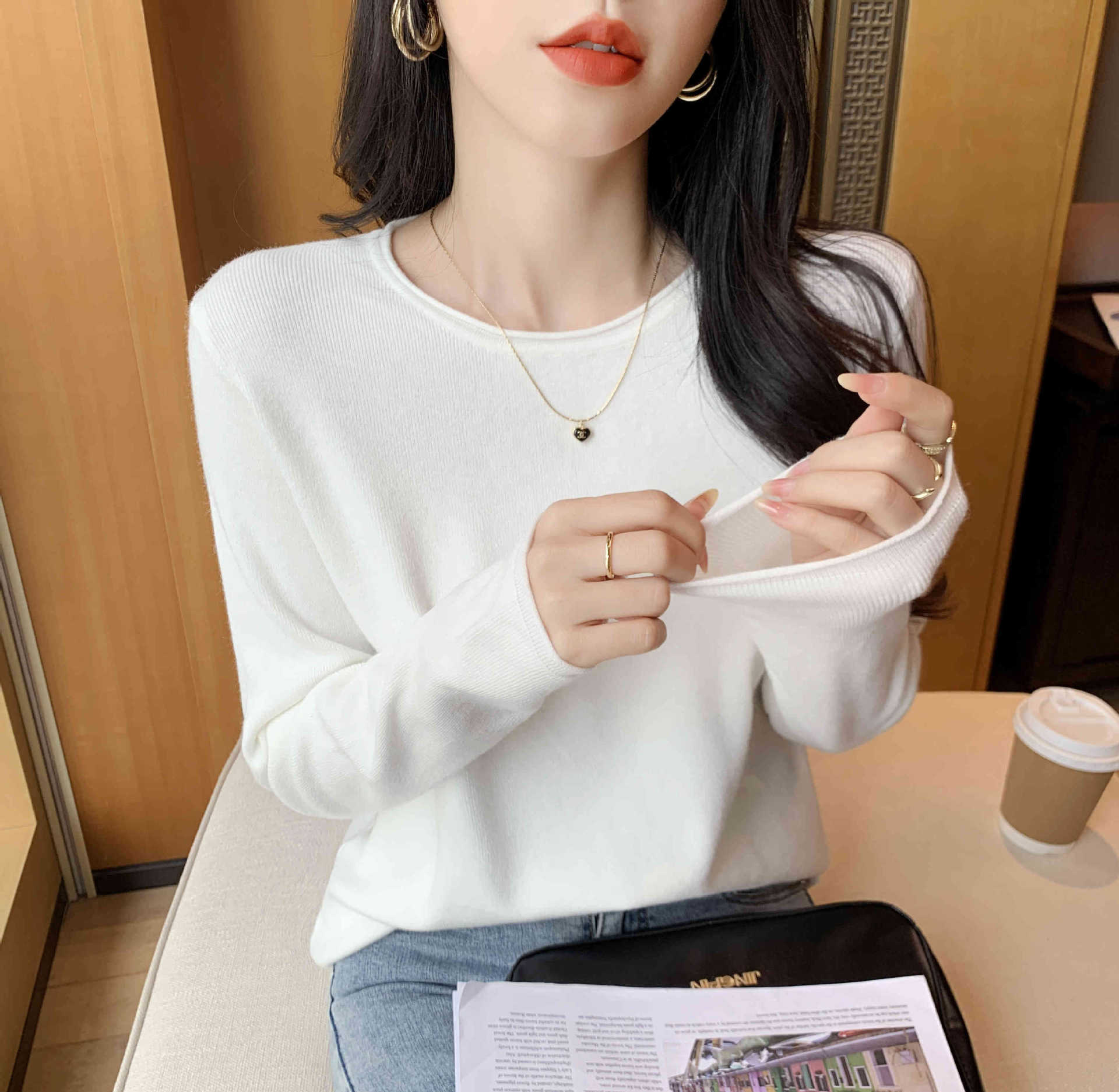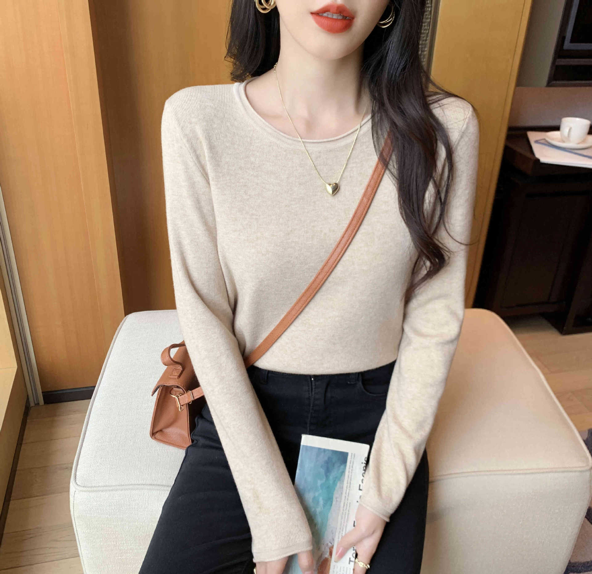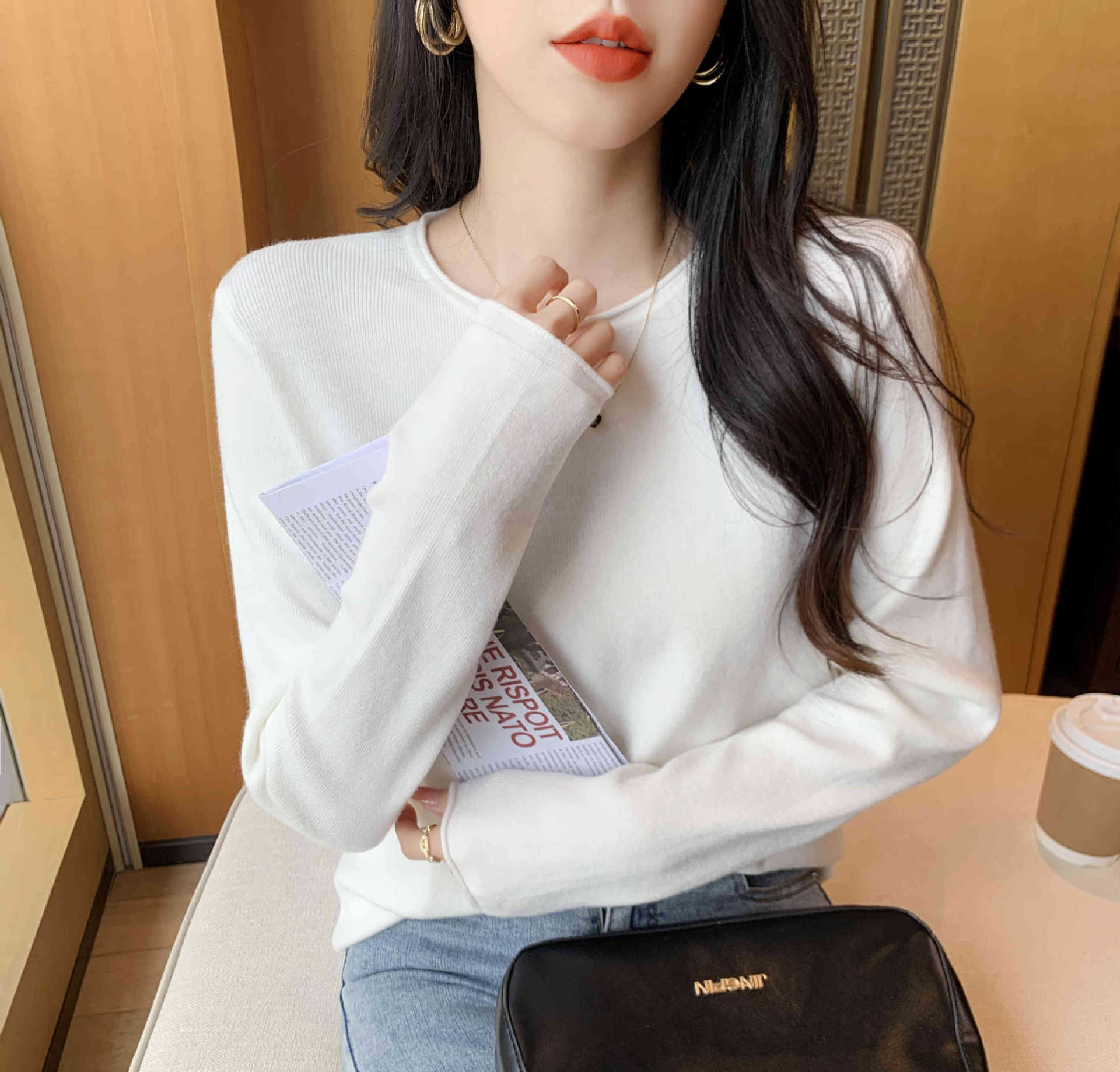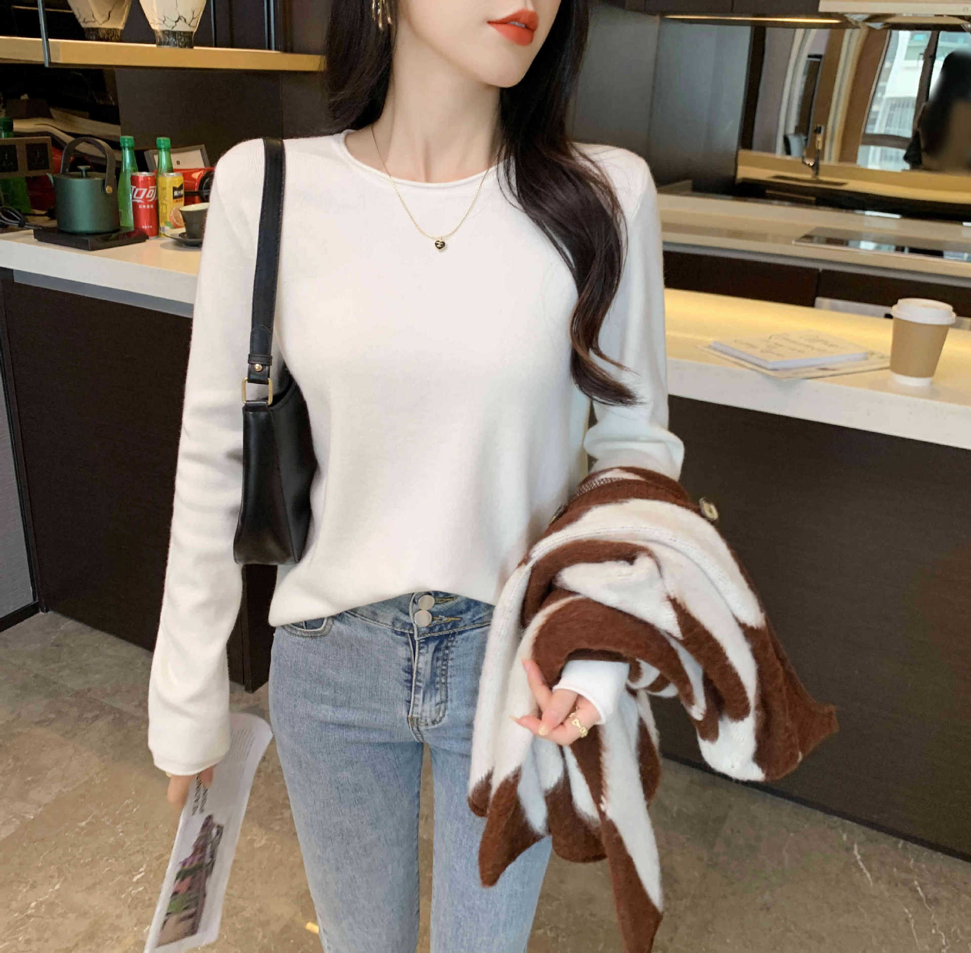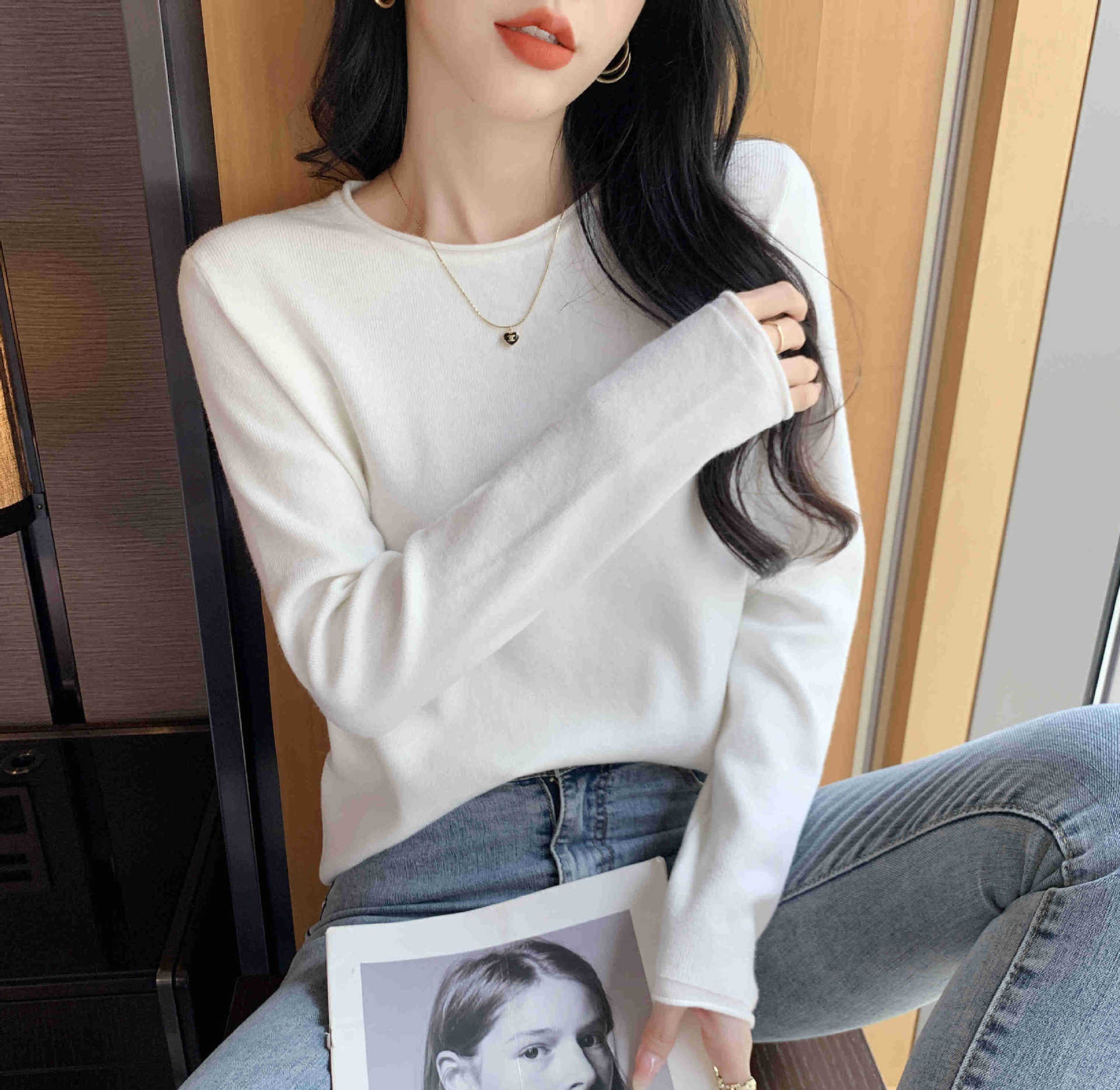 Suéter de punto suave y acogedor para mujer, Primavera 2025, Camisa básica casual sencilla de estilo coreano, Top interior de cuello redondo de color sólido