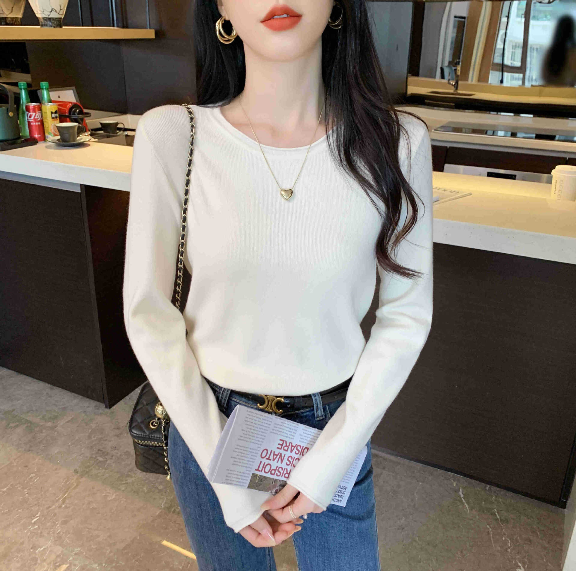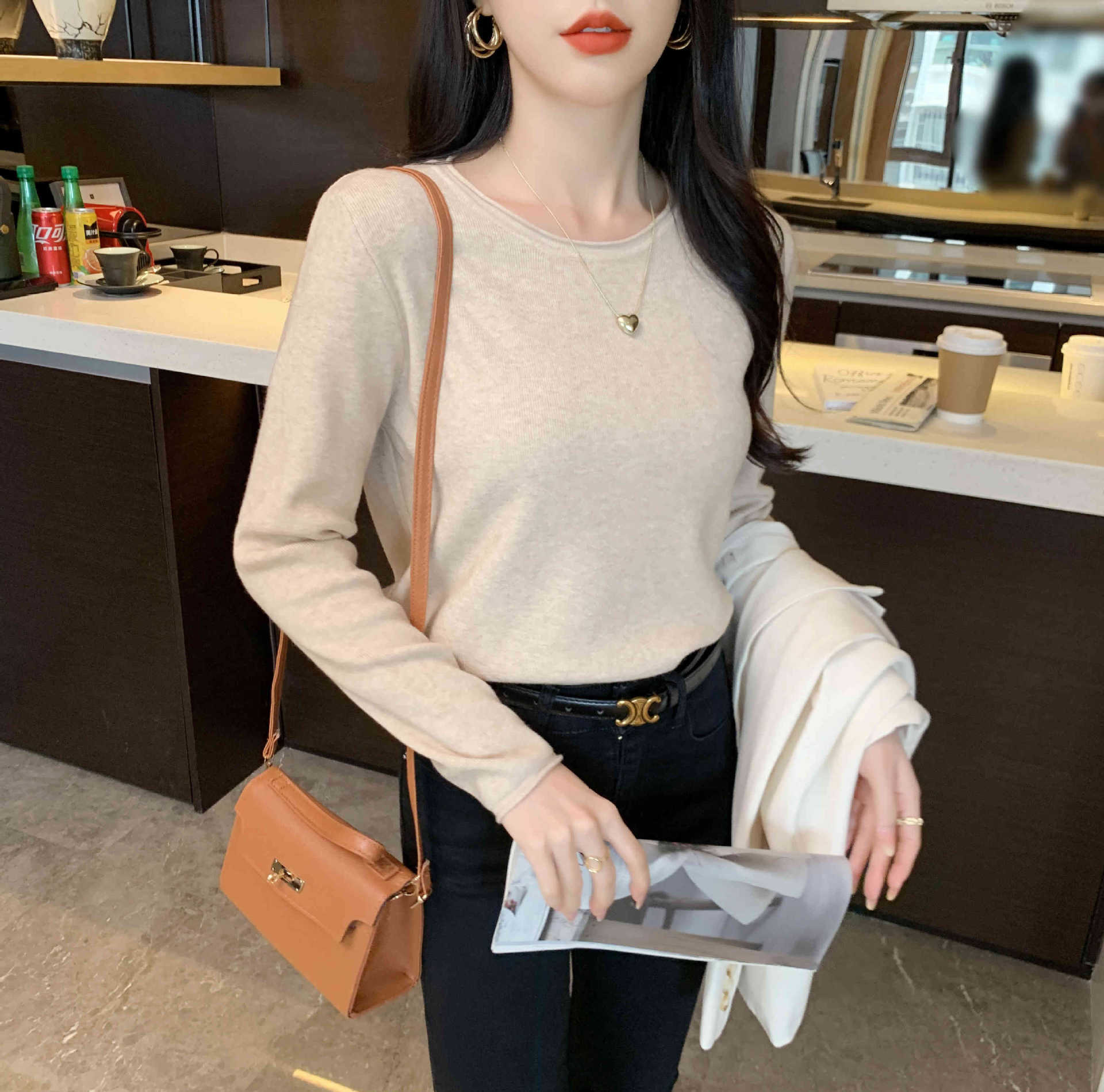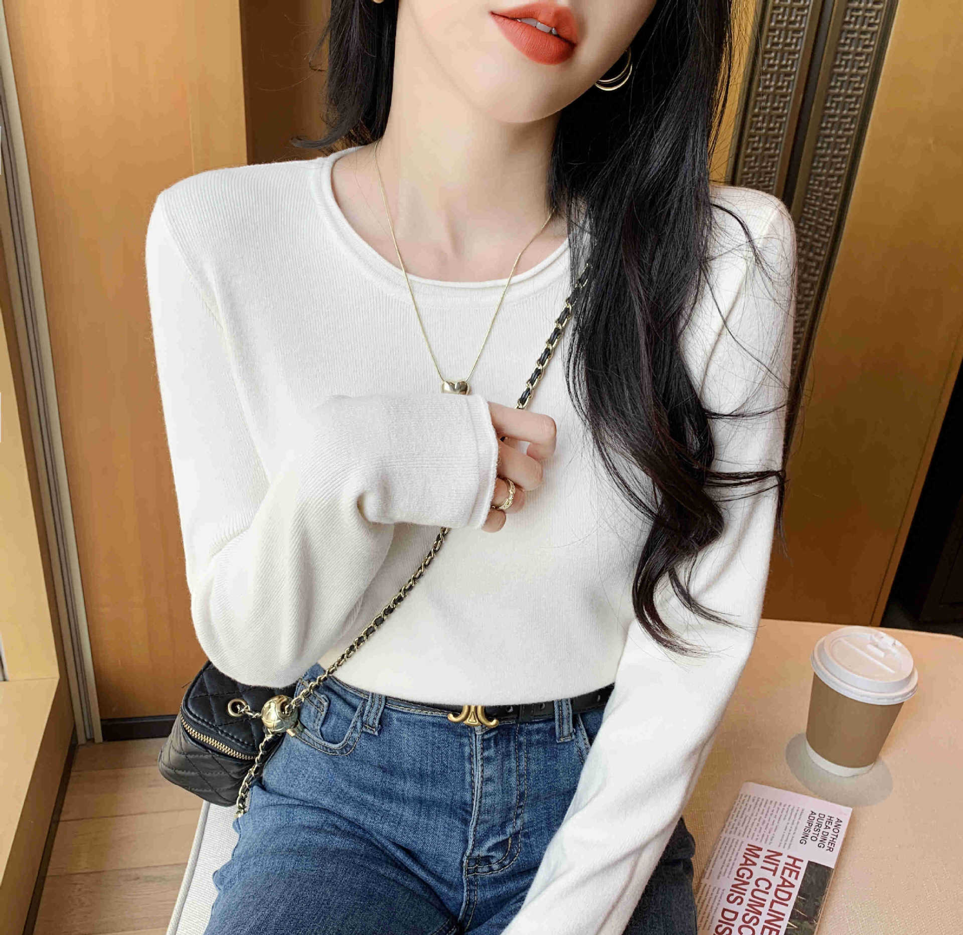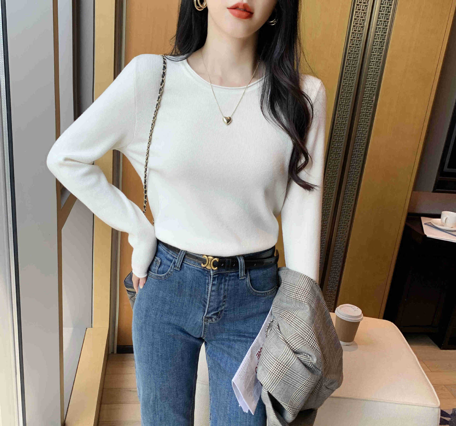 Suéter de punto suave y acogedor para mujer, Primavera 2025, Camisa básica casual sencilla de estilo coreano, Top interior de cuello redondo de color sólido
