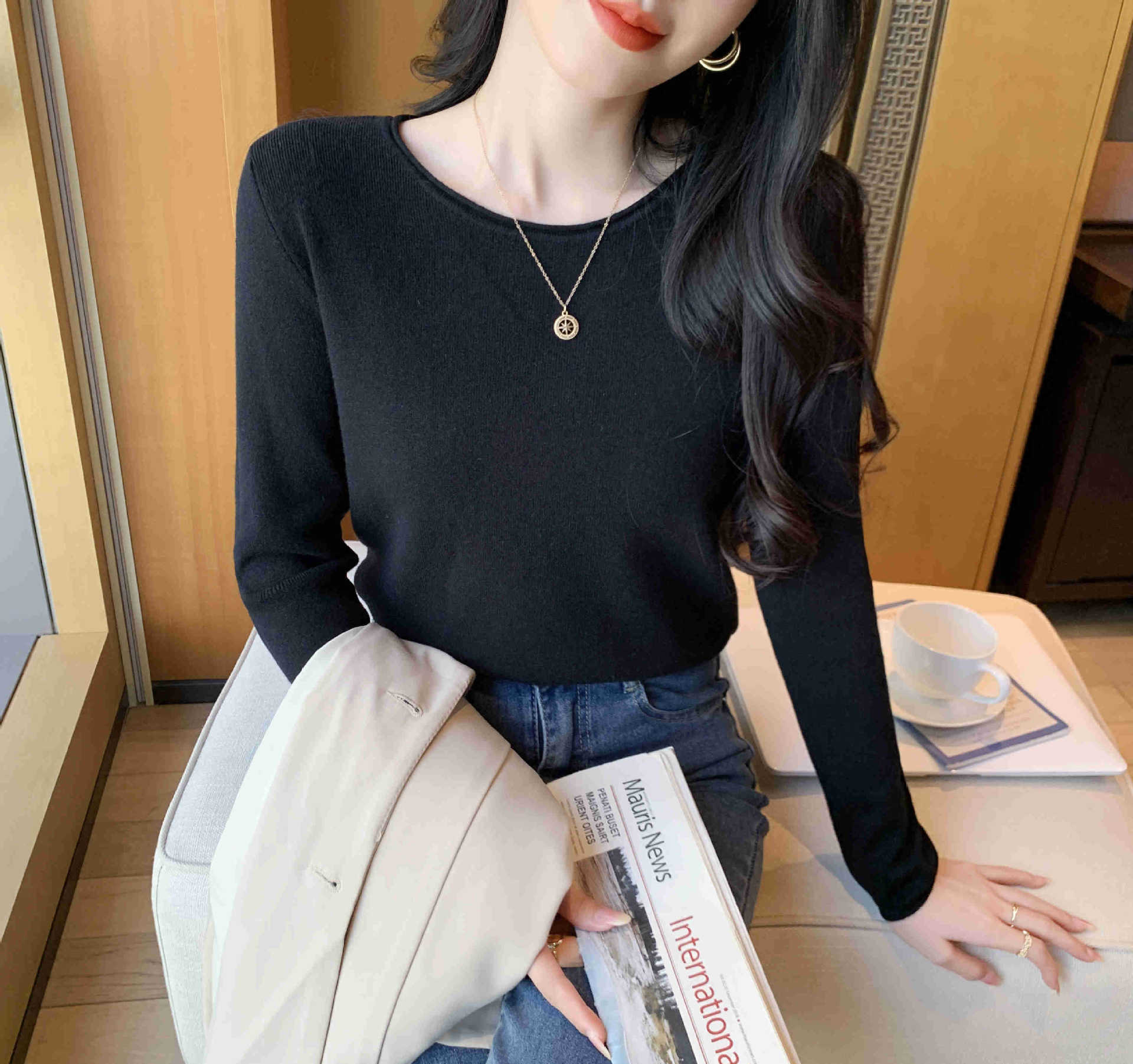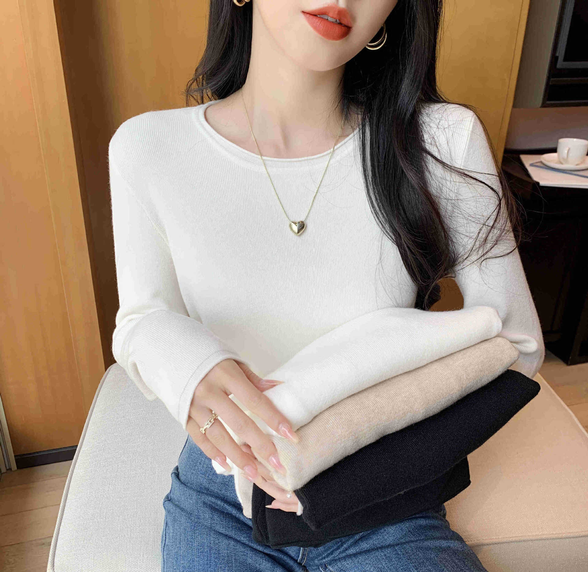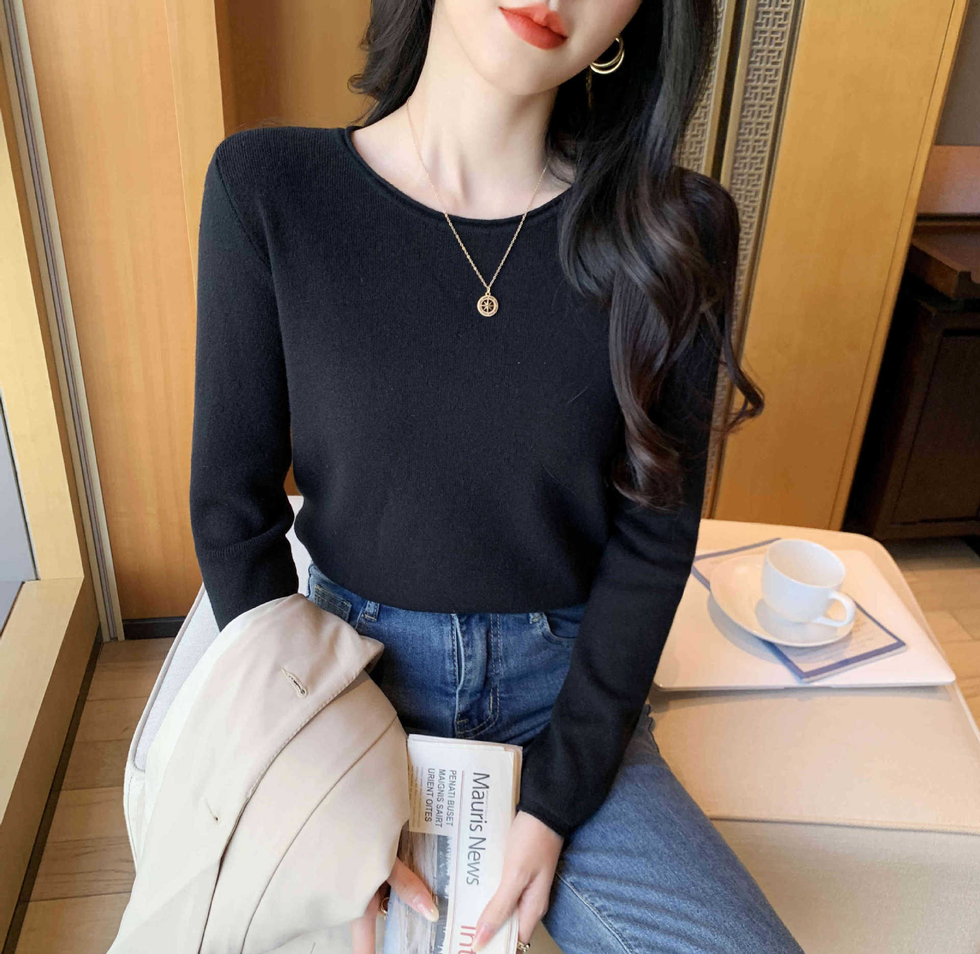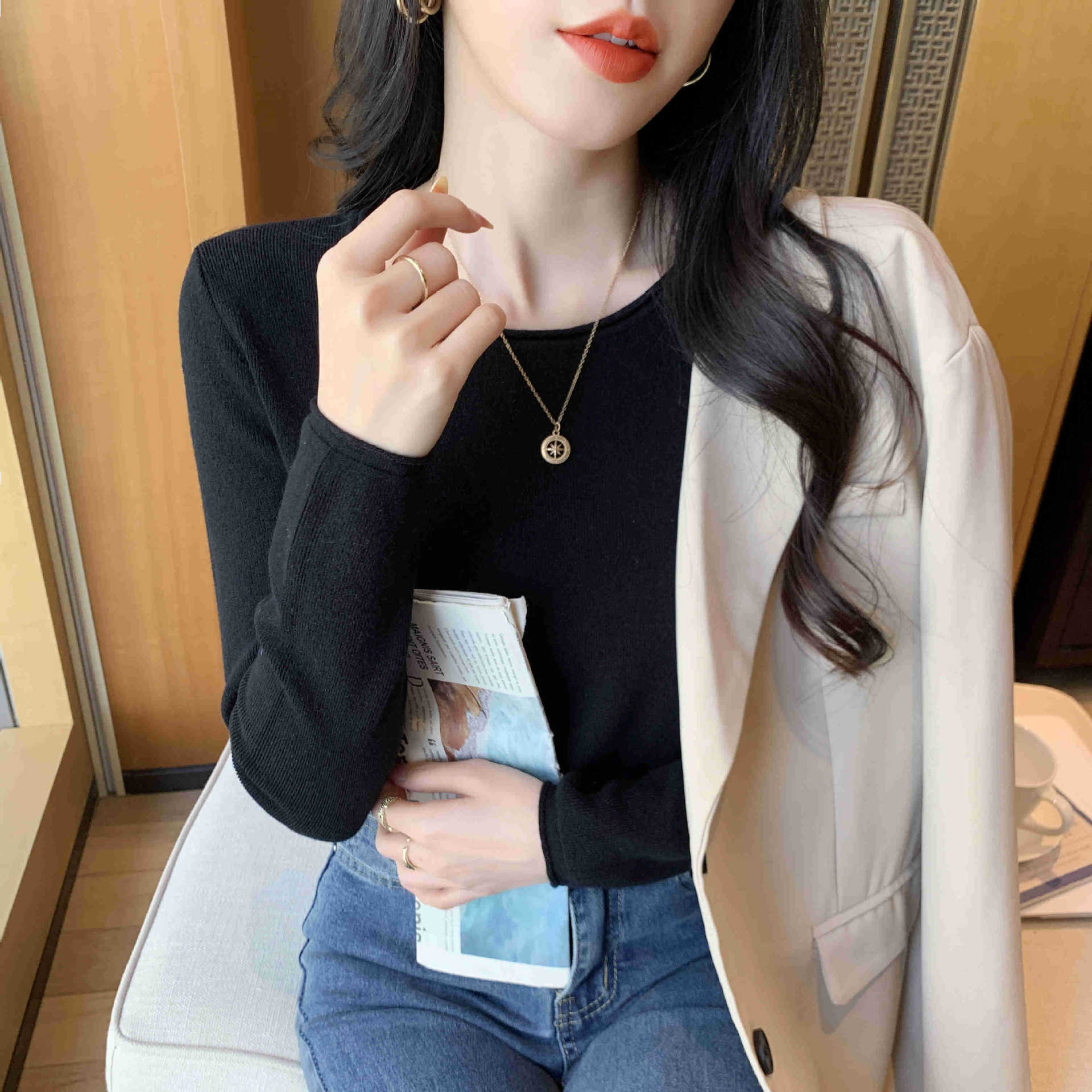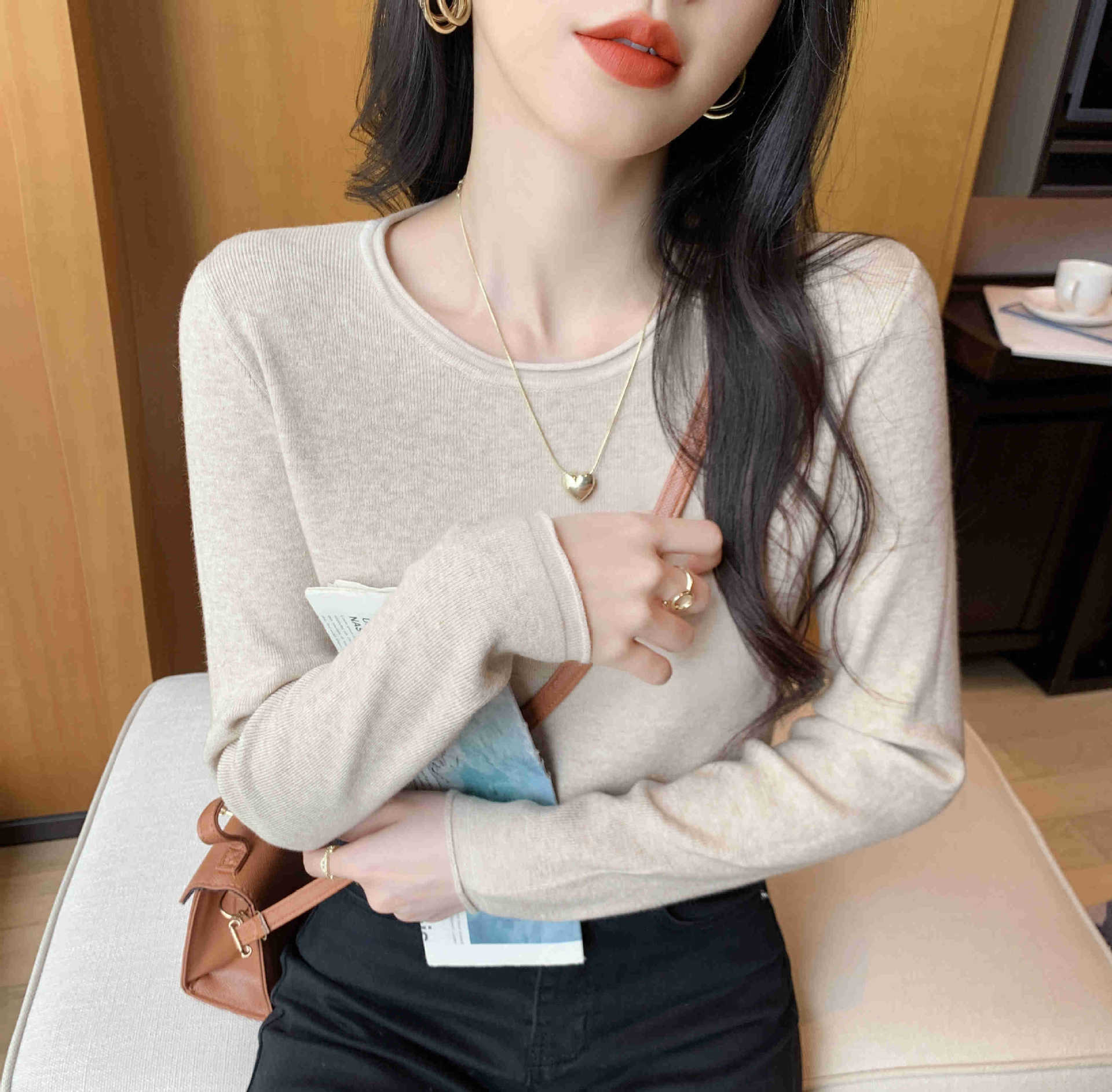 Suéter de punto suave y acogedor para mujer, Primavera 2025, Camisa básica casual sencilla de estilo coreano, Top interior de cuello redondo de color sólido
