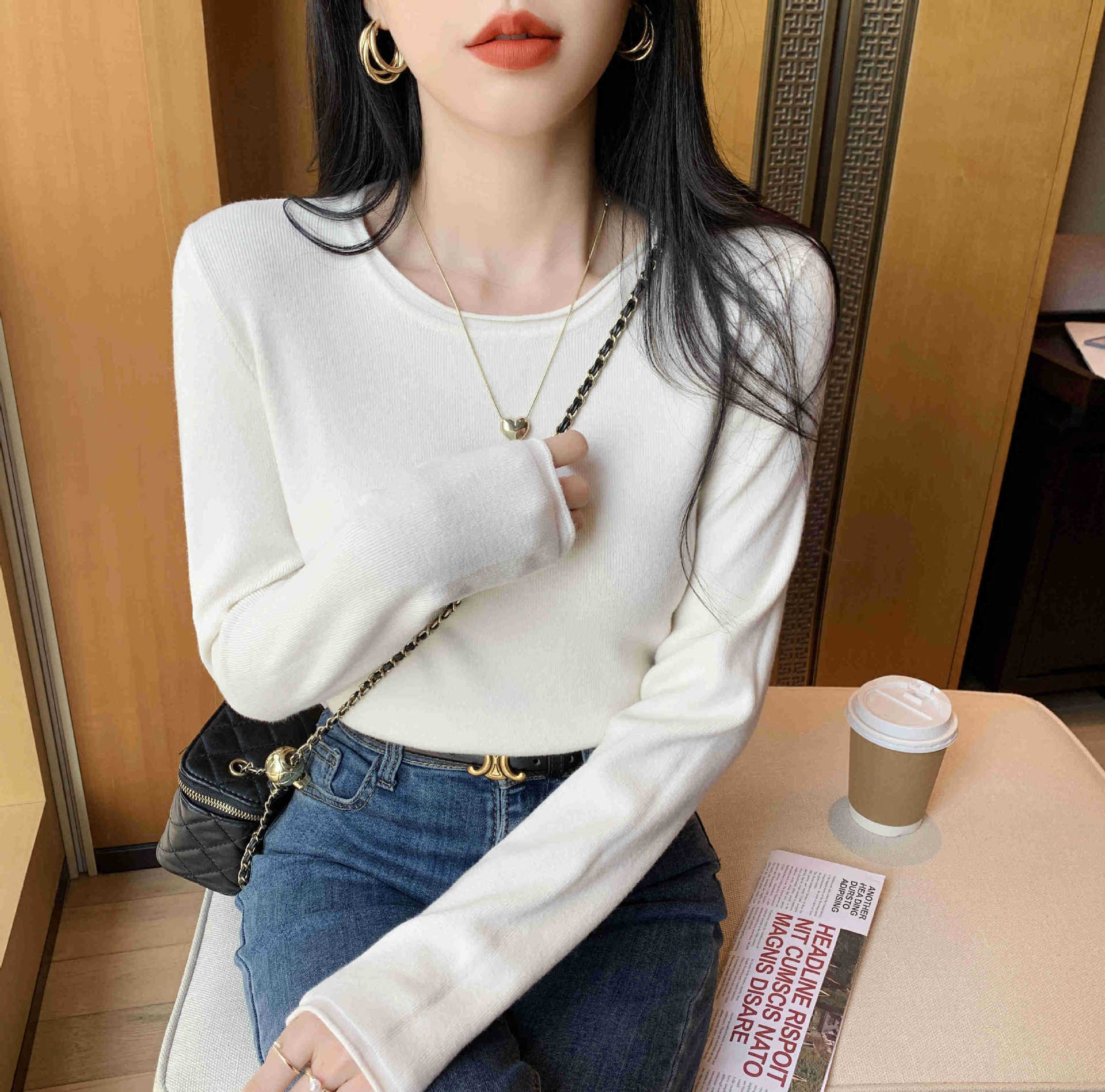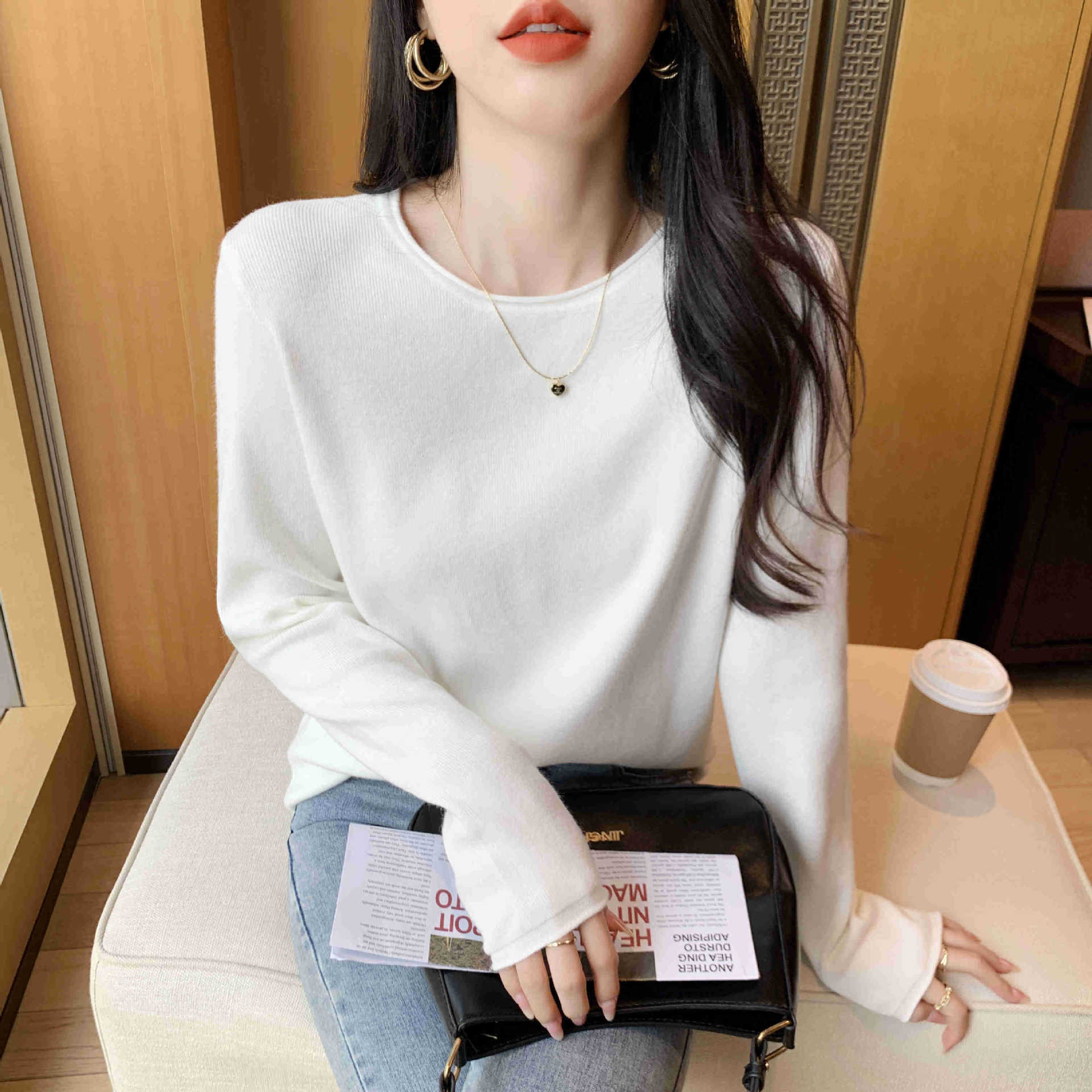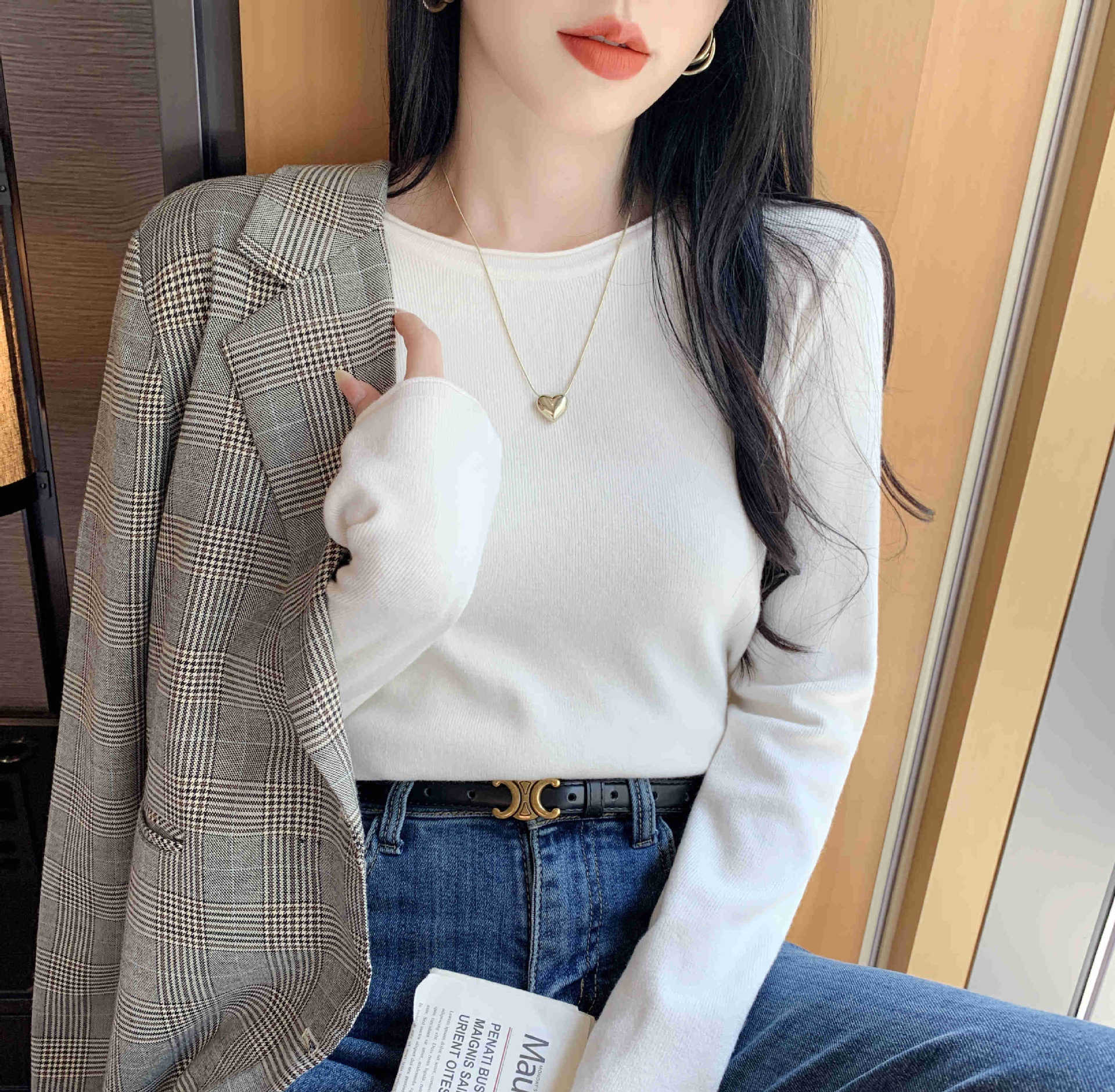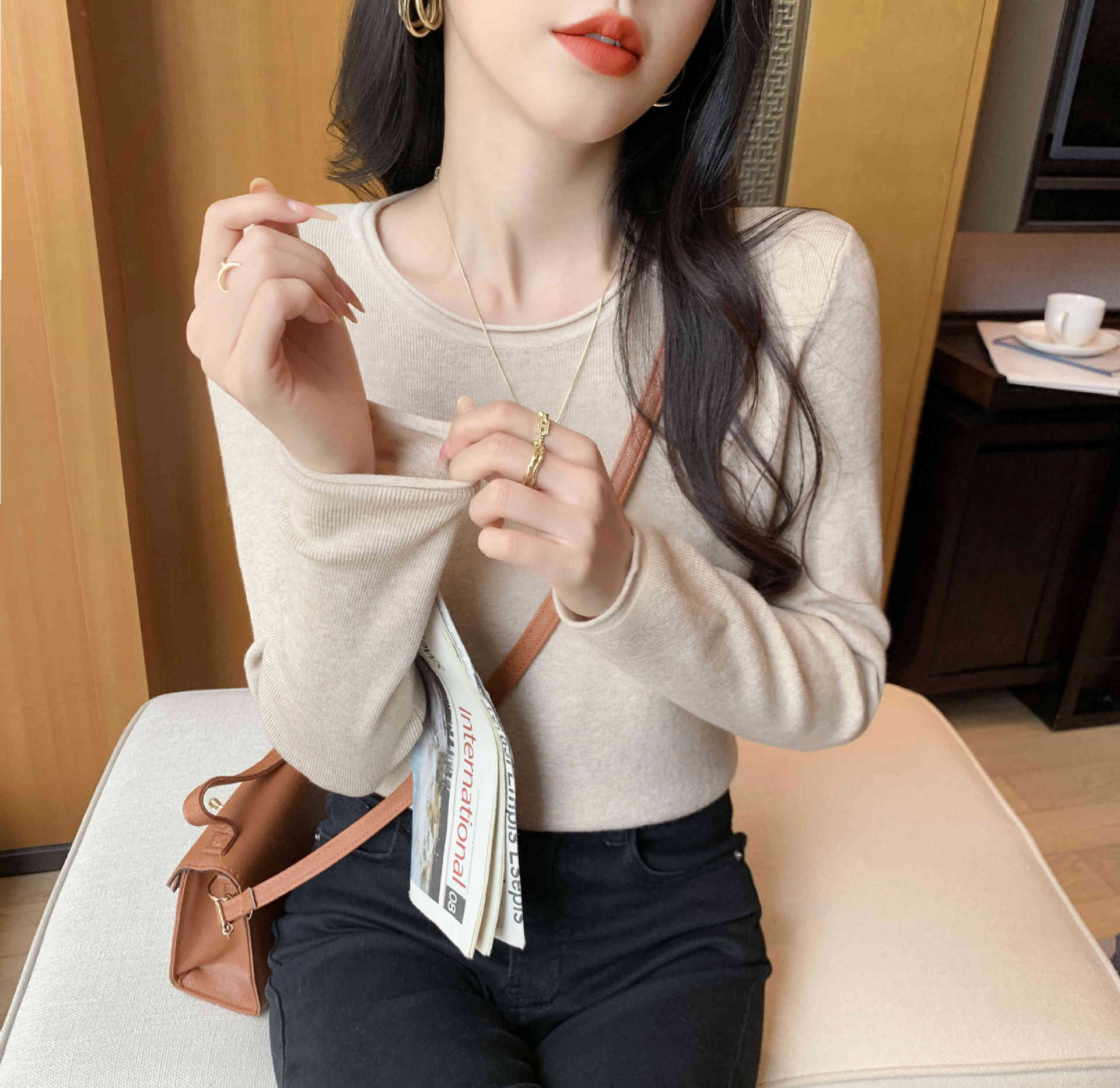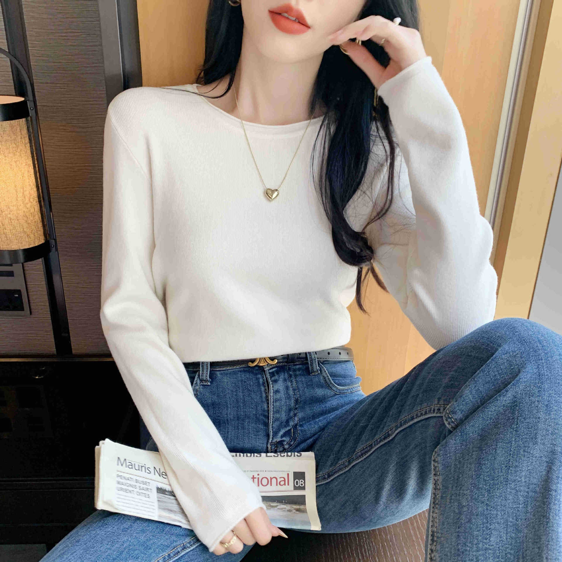 Suéter de punto suave y acogedor para mujer, Primavera 2025, Camisa básica casual sencilla de estilo coreano, Top interior de cuello redondo de color sólido