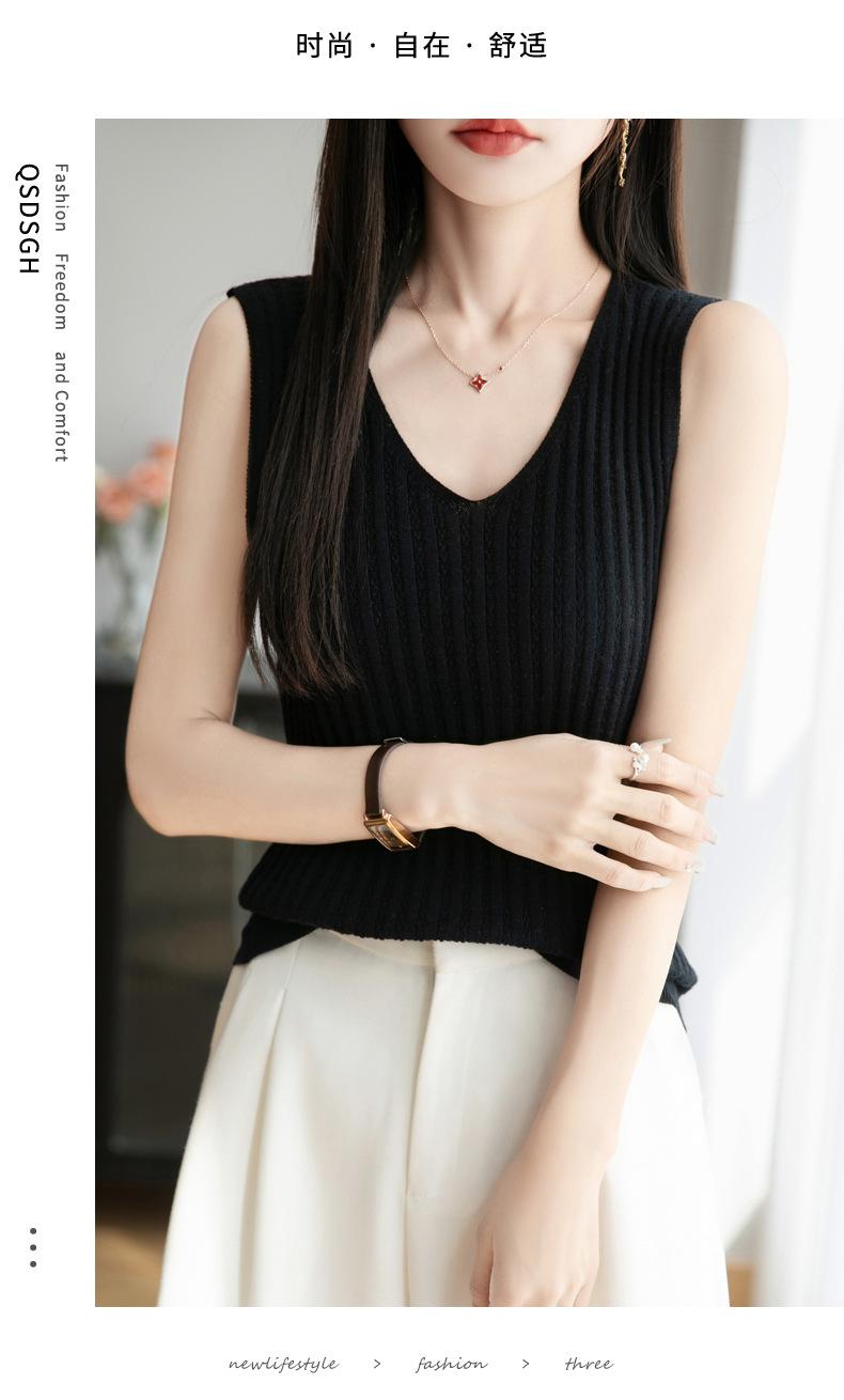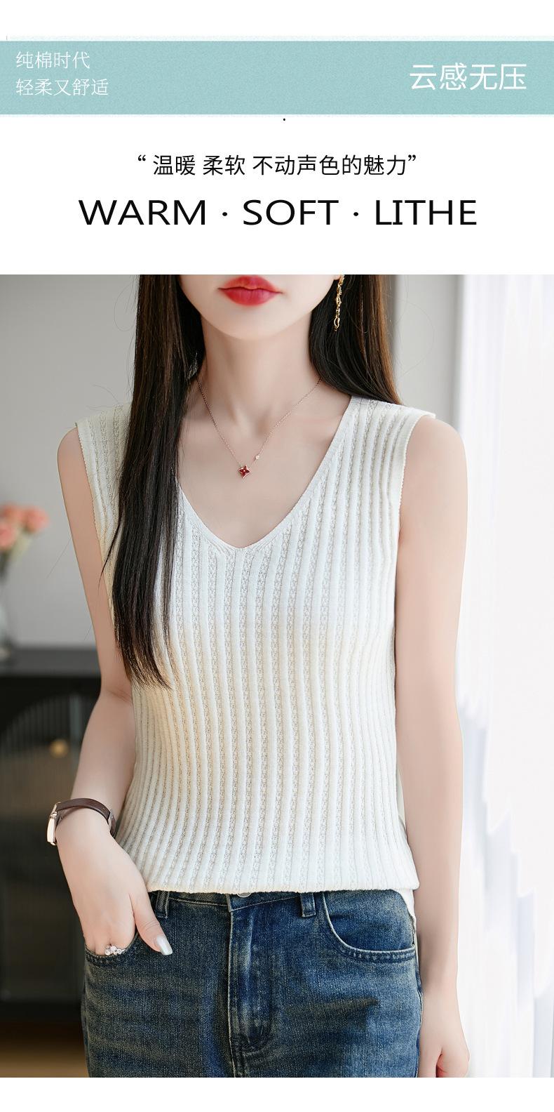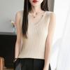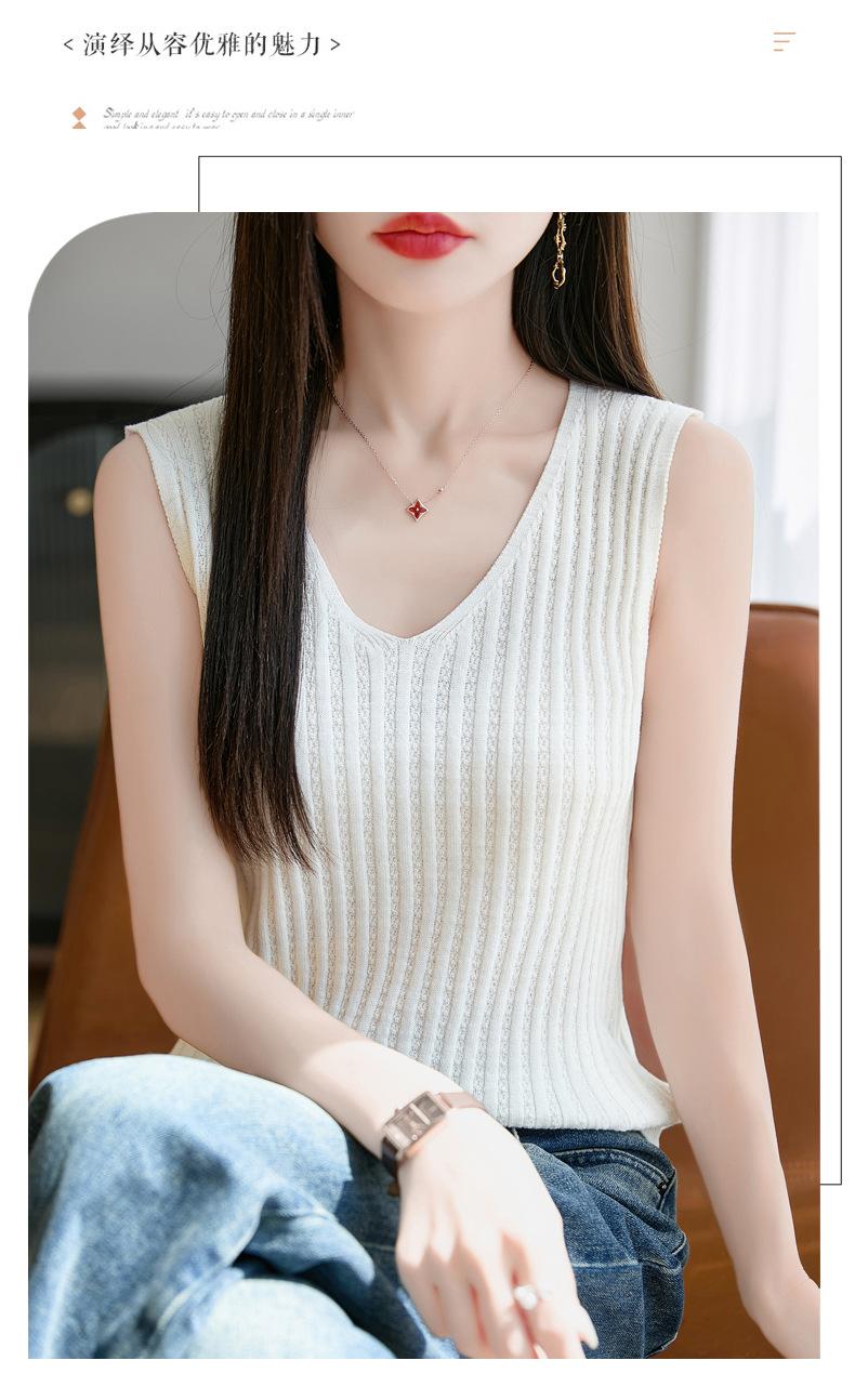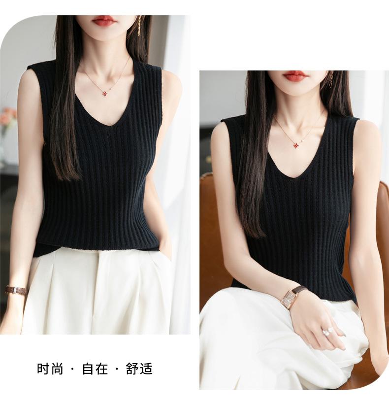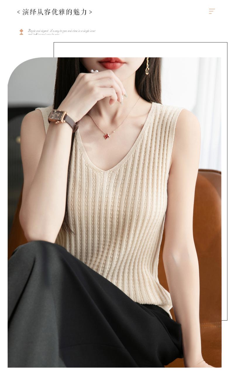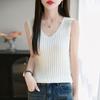 2025 Verano Nuevo Camisola de Punto de Algodón Puro con Cuello en V Color Sólido Canalé Interior Jersey Básico para Mujer