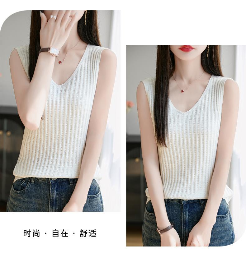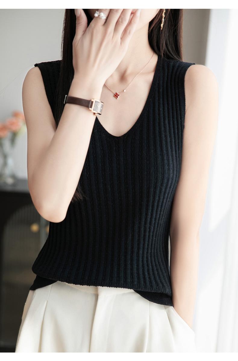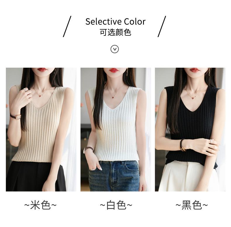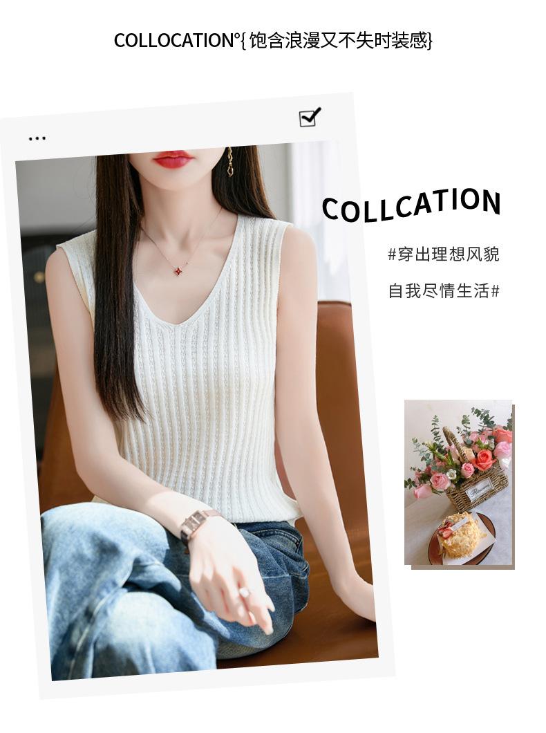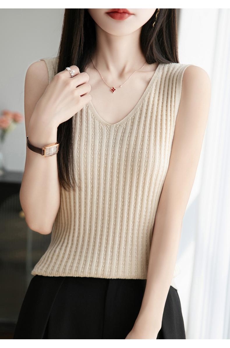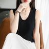 2025 Verano Nuevo Camisola de Punto de Algodón Puro con Cuello en V Color Sólido Canalé Interior Jersey Básico para Mujer