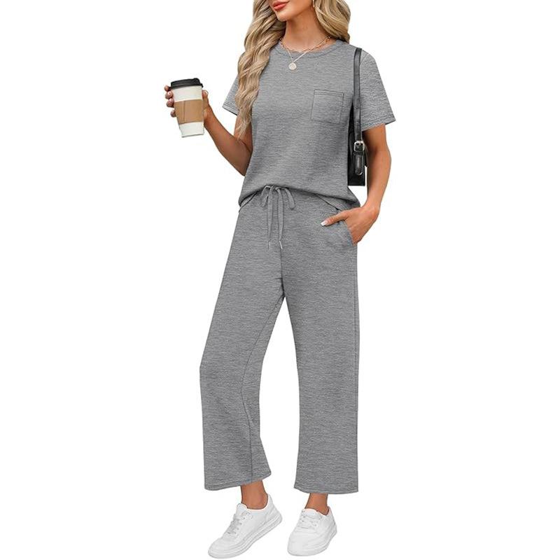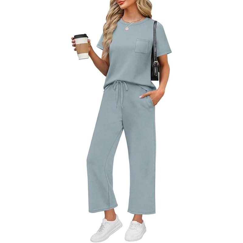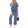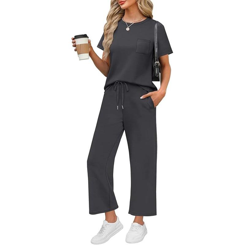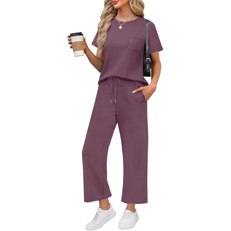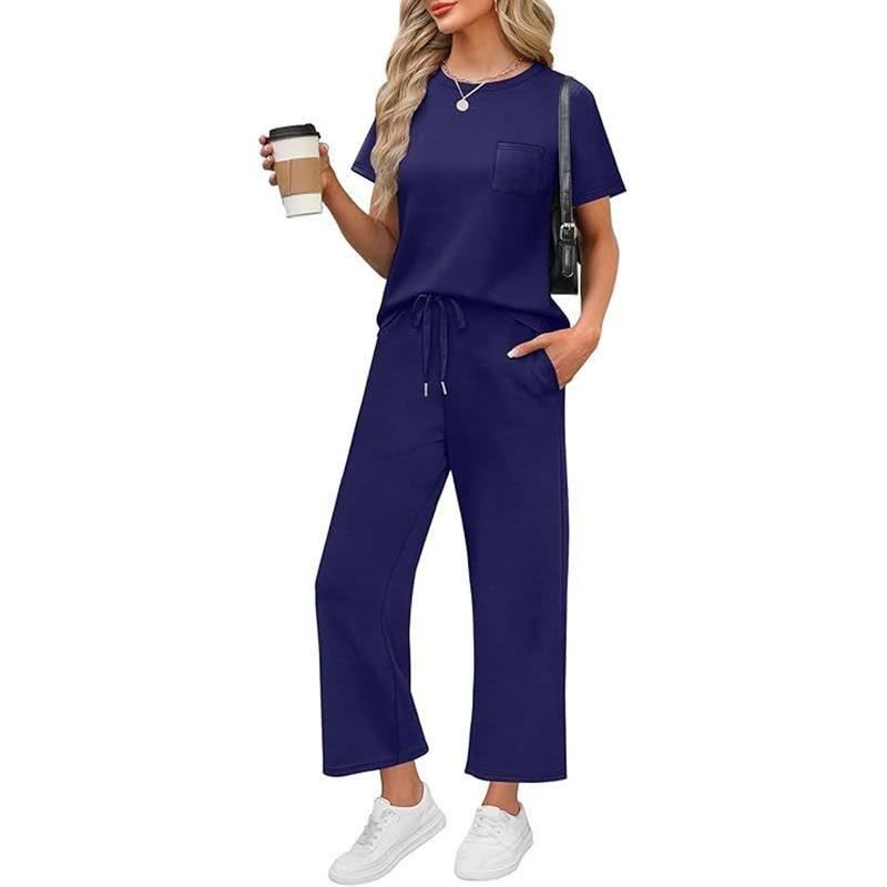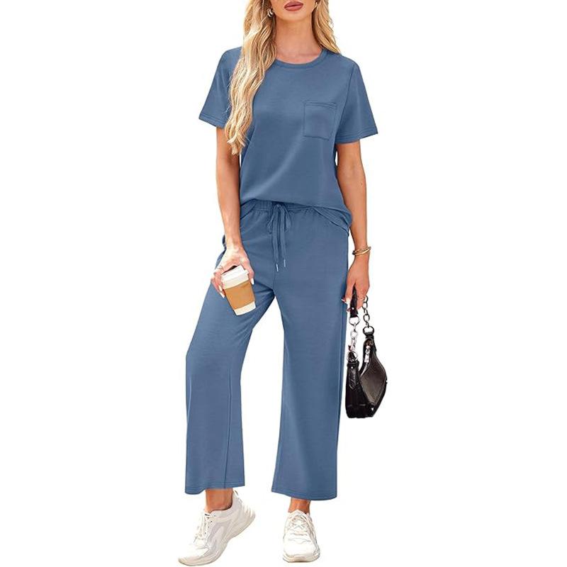 Europeo y Americano Transfronterizo 2 piezas Ropa Casual de Verano para Viajes y Vacaciones para Mujer Pantalones de Pierna Ancha de Manga Corta Traje Casual Color Sólido