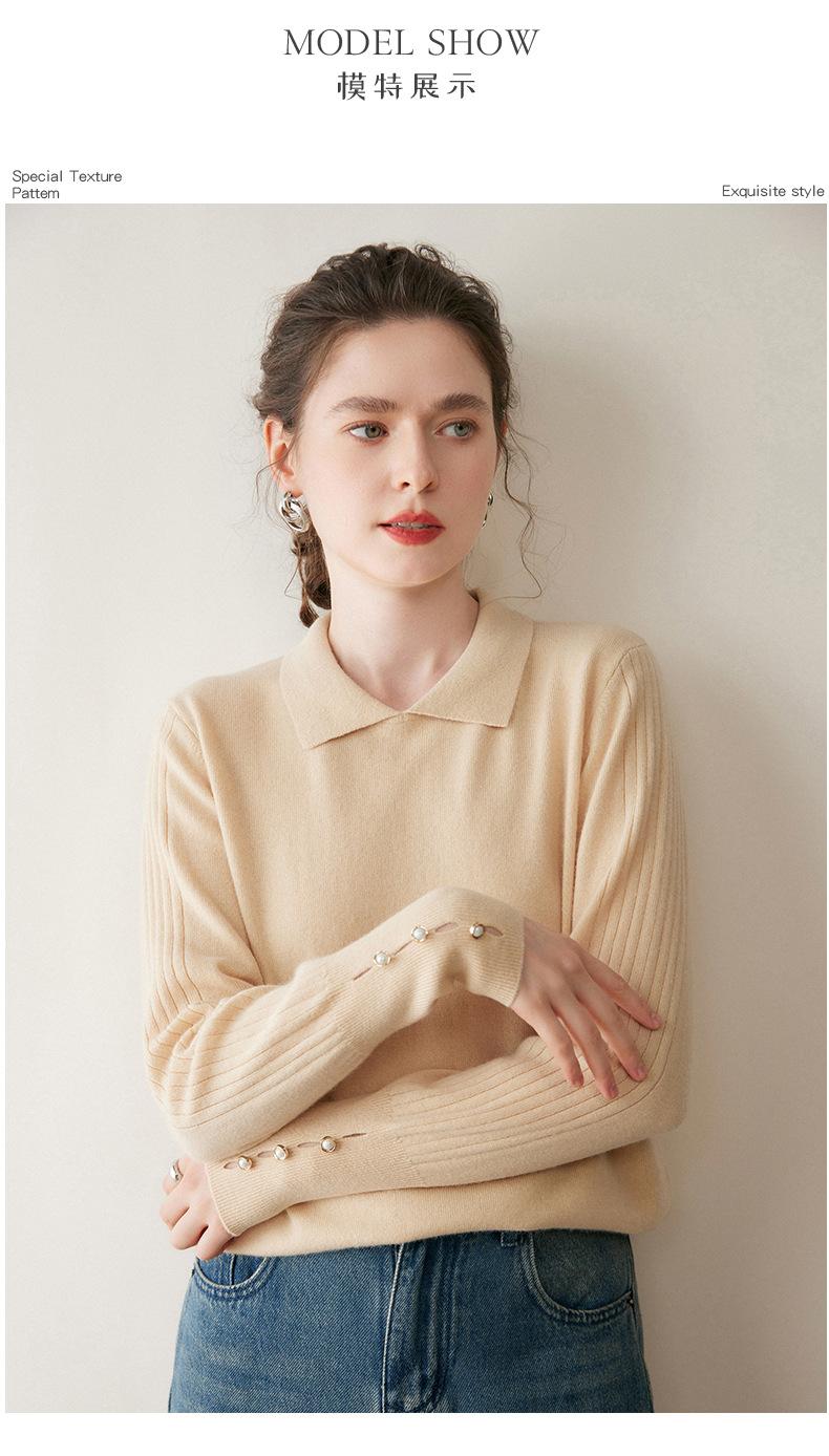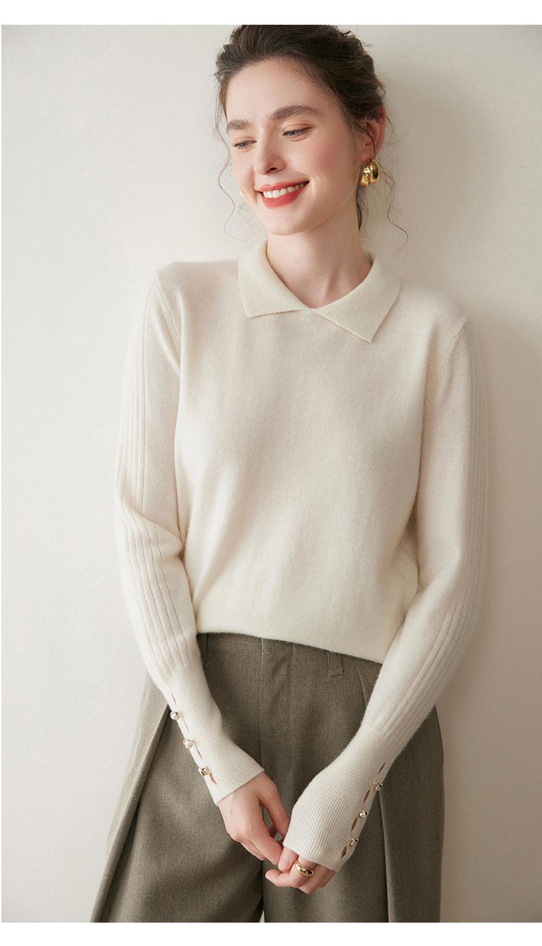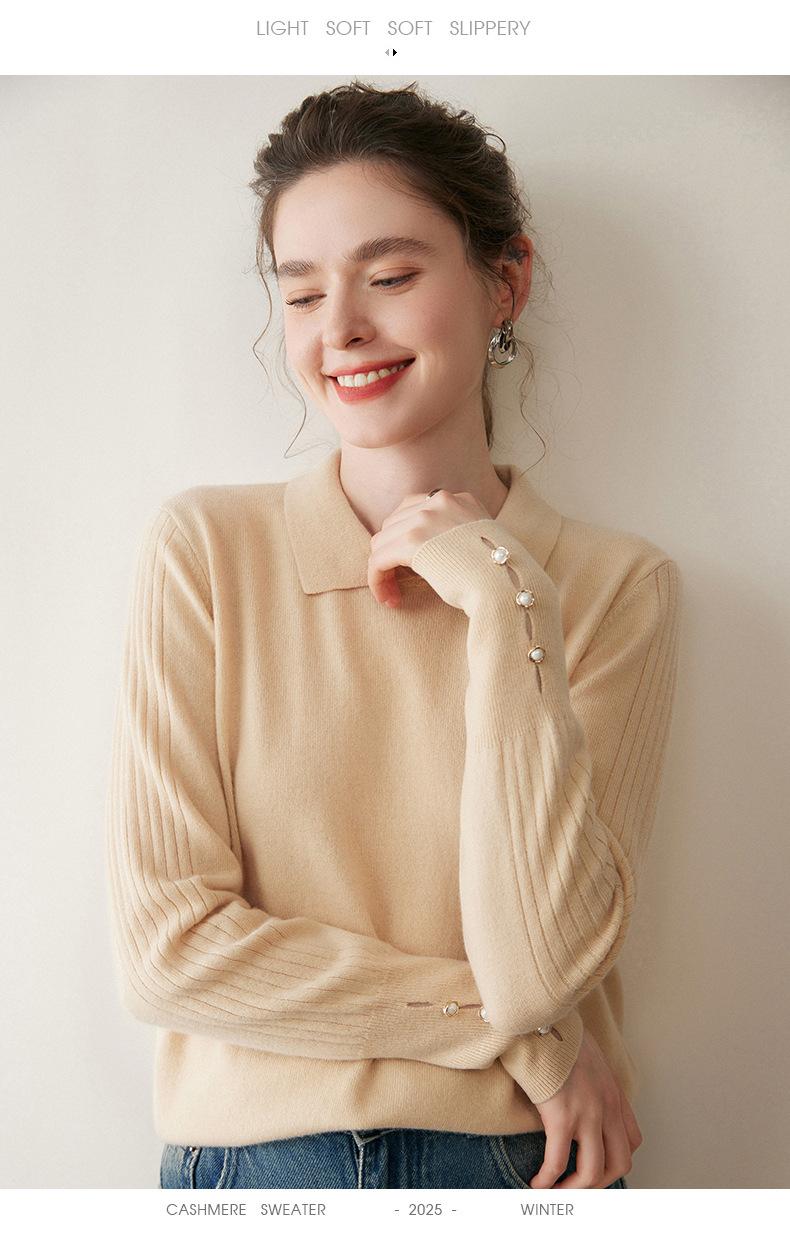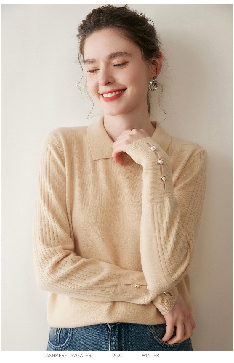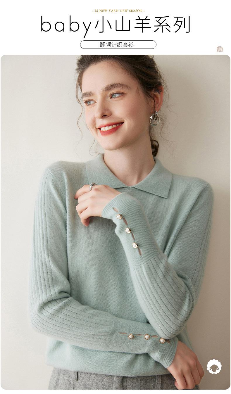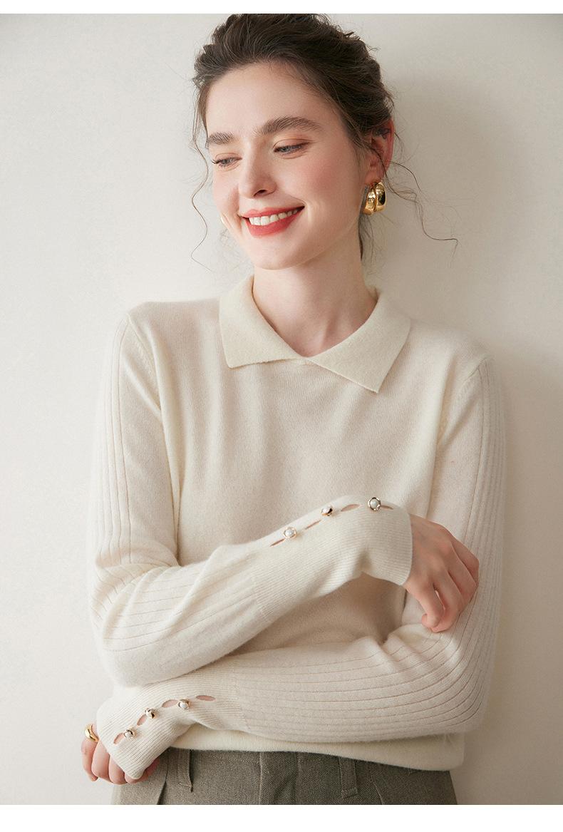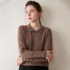 Polo de Mujer Manga con Hebilla Tejido Base Otoño e Invierno Nuevo Suéter de Cachemira Color Sólido Capa Interior Suéter Ligeramente Holgado