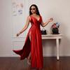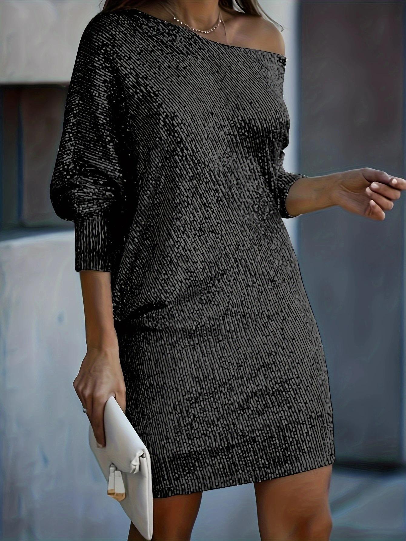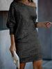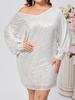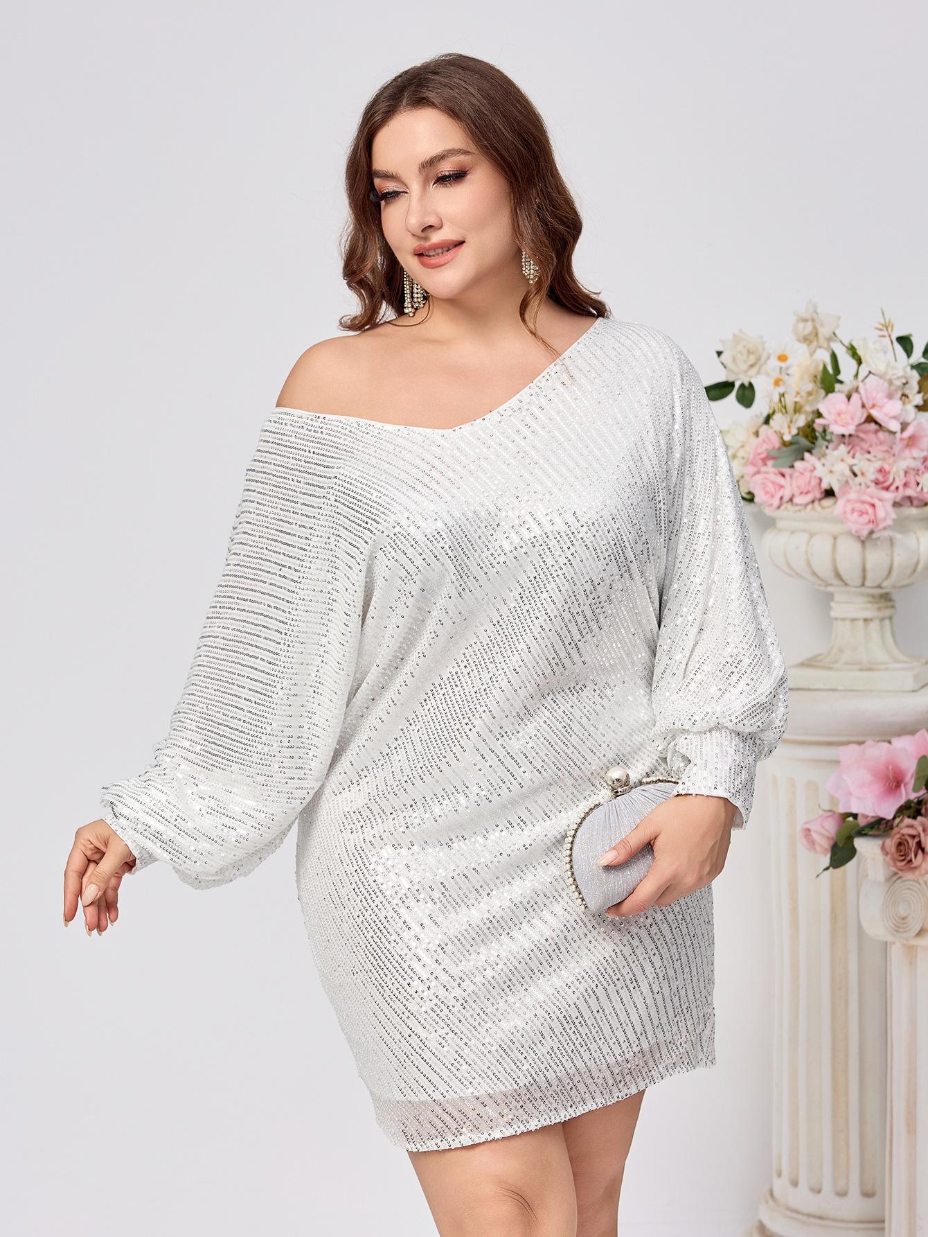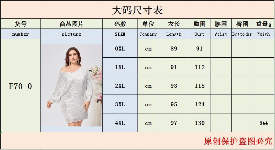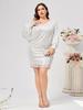 Nuevo Vestido Corto Elegante de Moda para Mujer de Talla Grande con Cuello en V Europeo y Americano de Color Puro con Lentejuelas Transfronterizo Amazon de Manga Larga