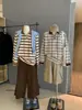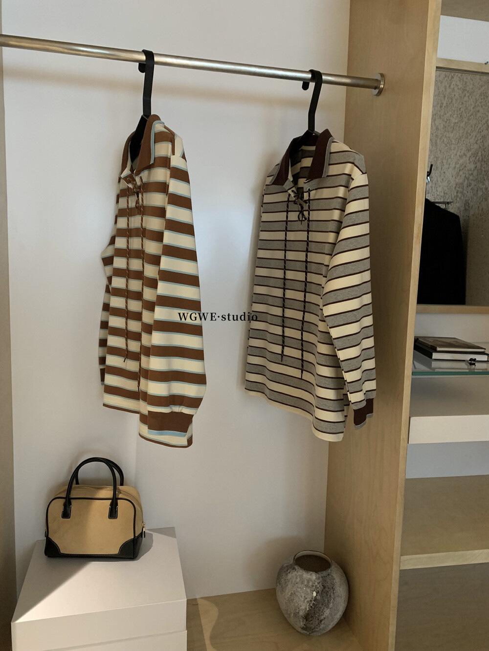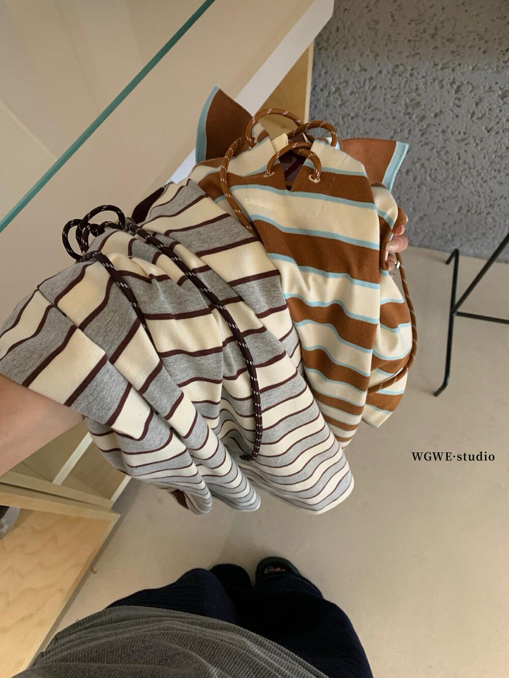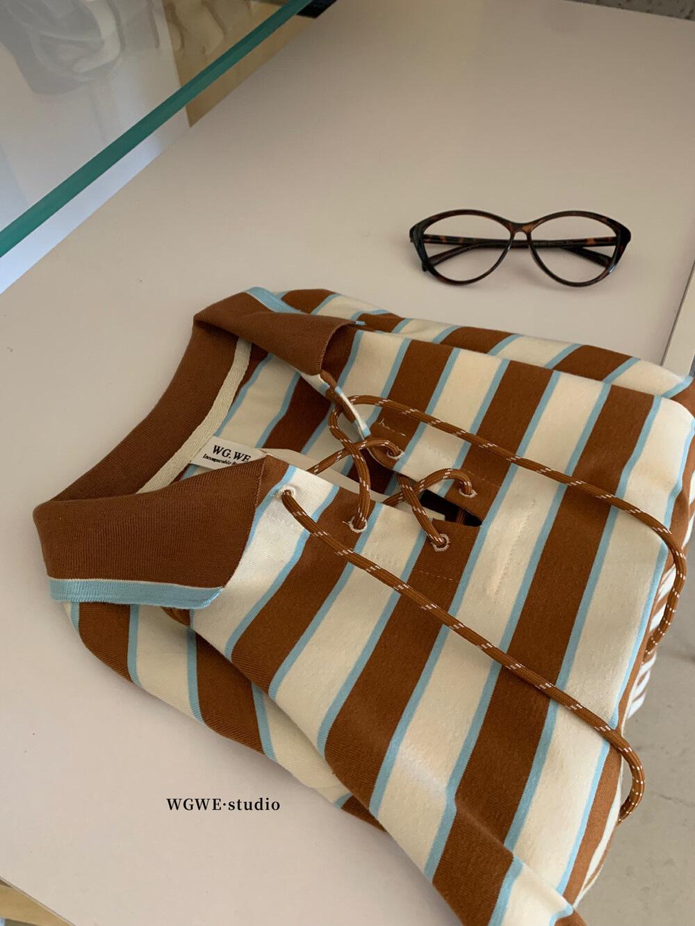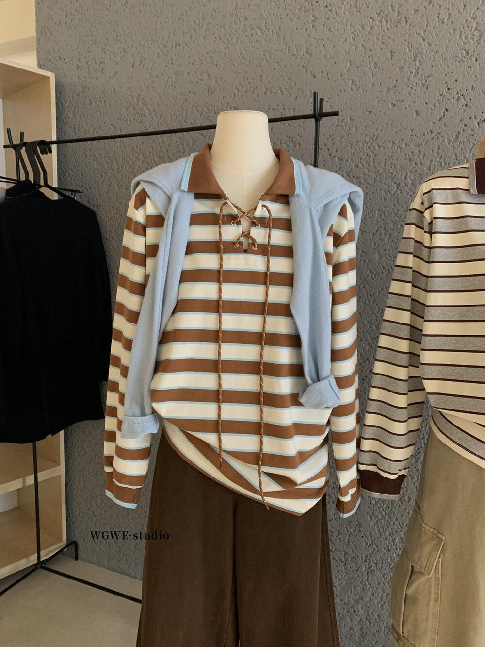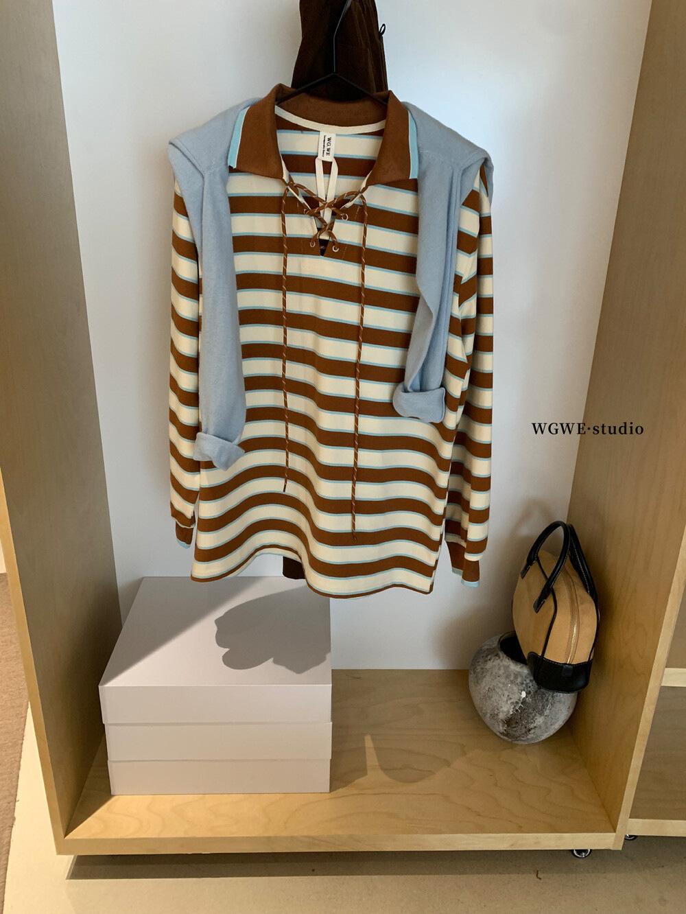 WGWE Estilo Coreano Bloque de Color Diseño Rayado Sentido Lazo Versátil Suelto Adelgazante Largo Medio Solapa Manga Larga Camiseta W7095