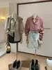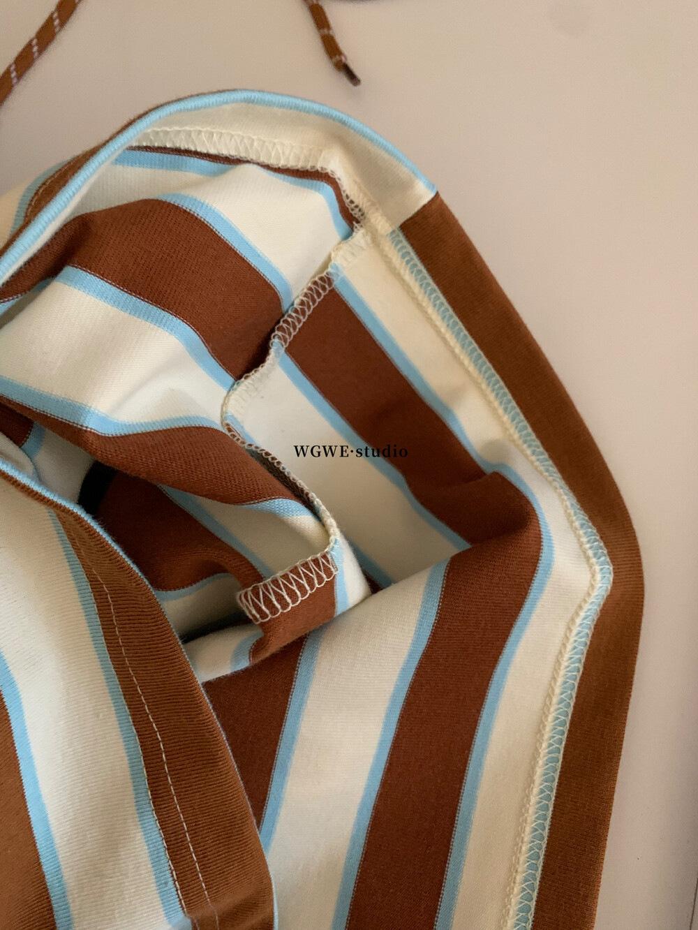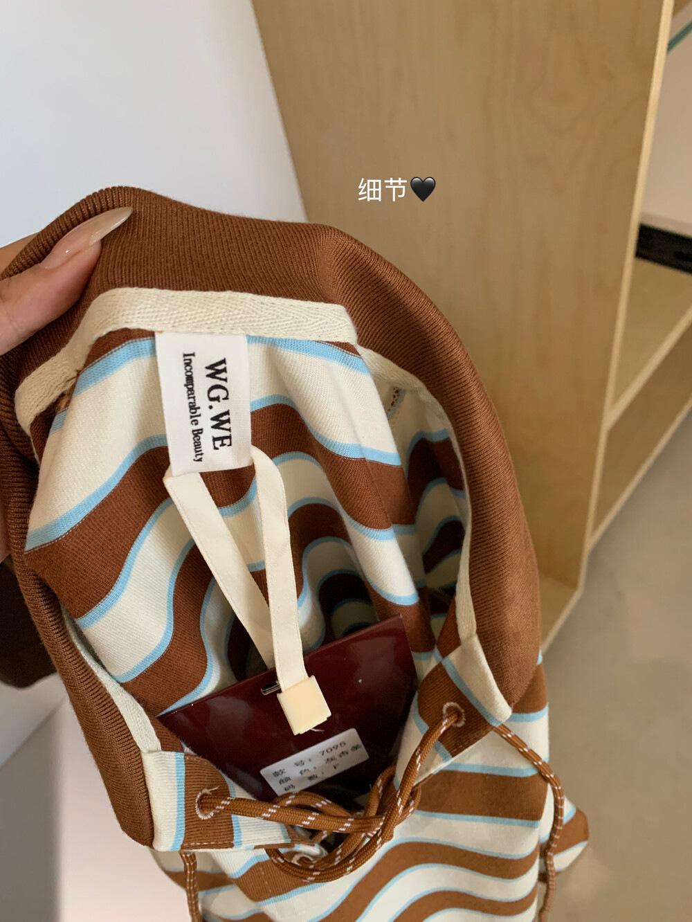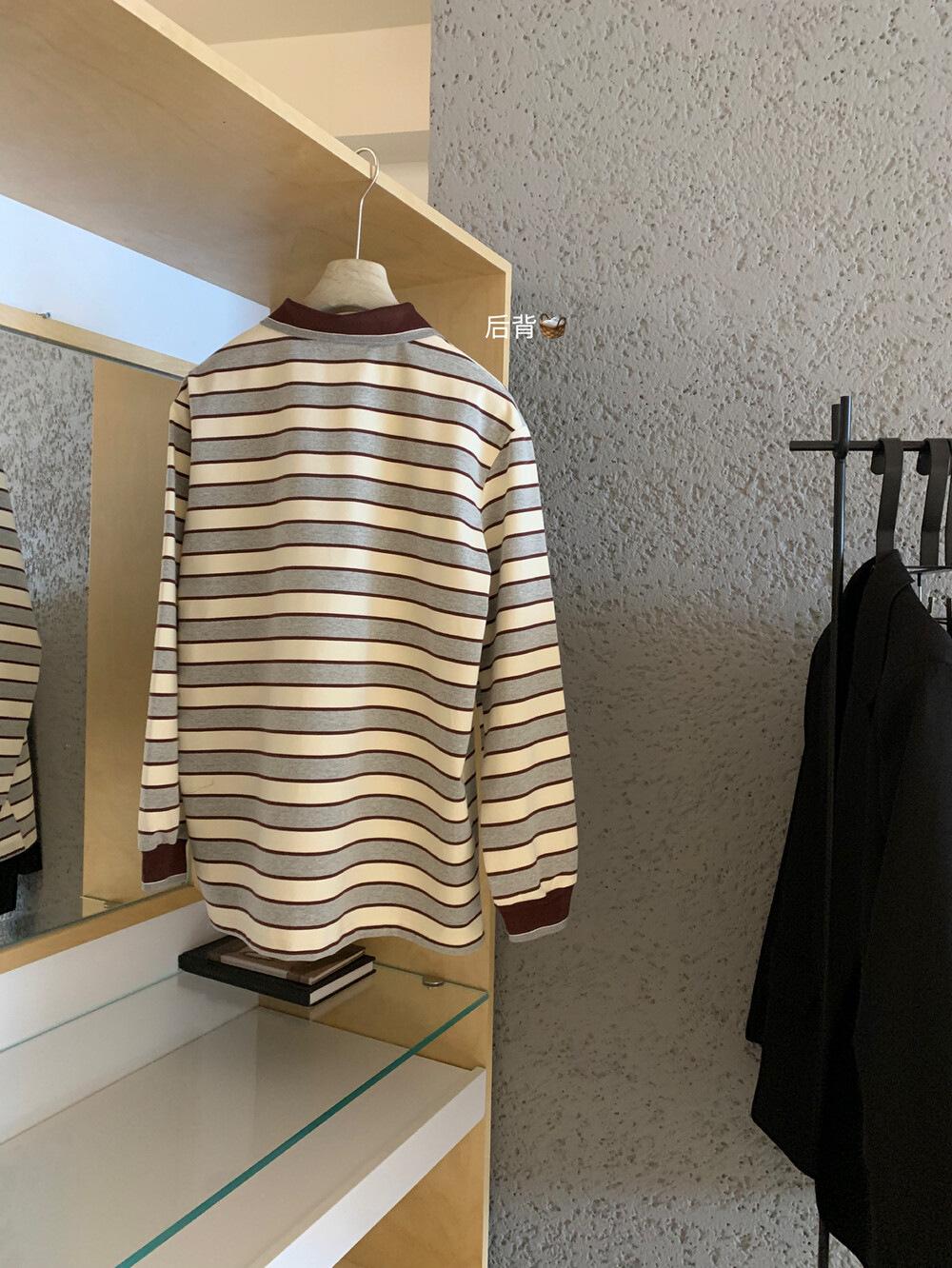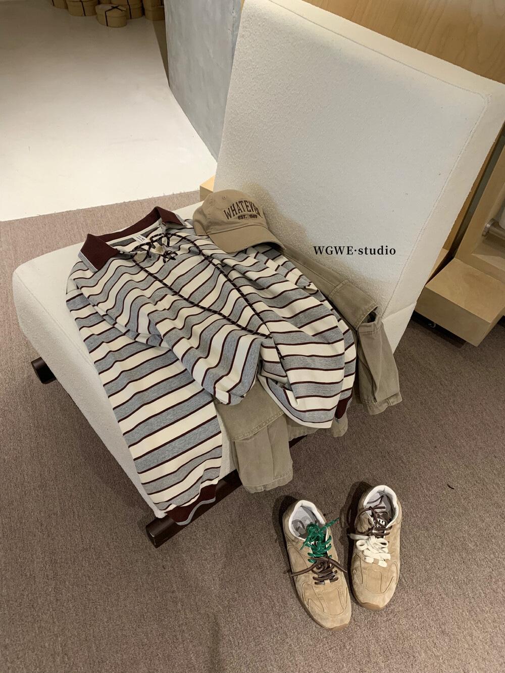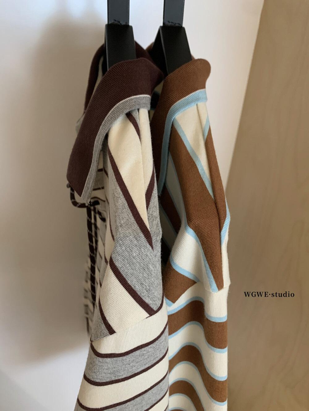 WGWE Estilo Coreano Bloque de Color Diseño Rayado Sentido Lazo Versátil Suelto Adelgazante Largo Medio Solapa Manga Larga Camiseta W7095