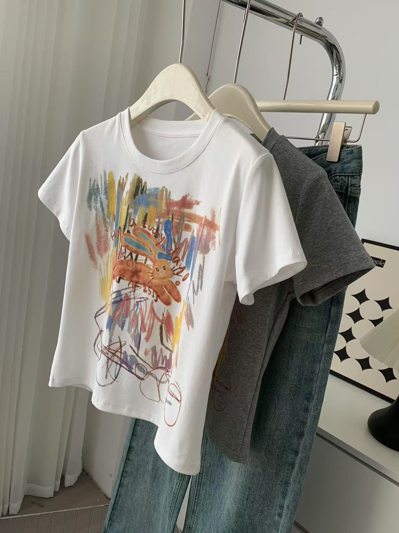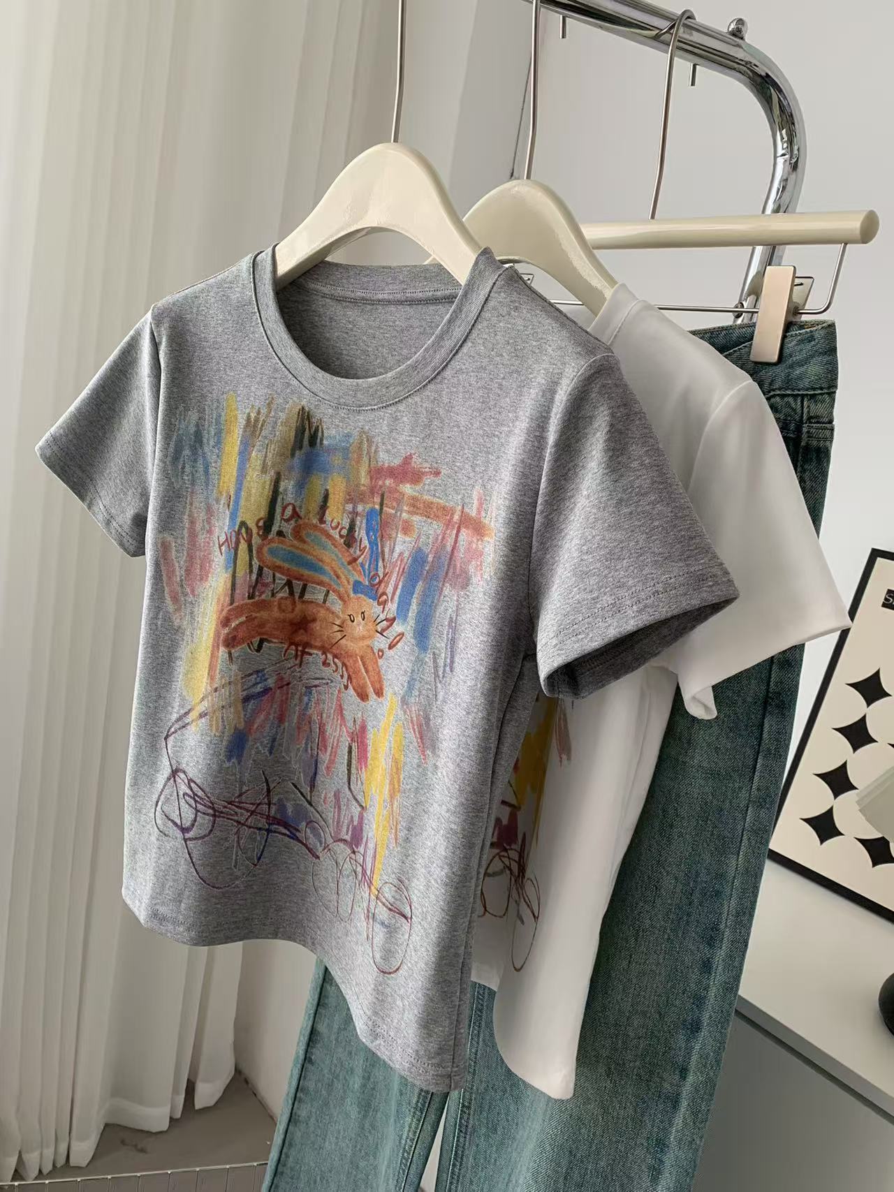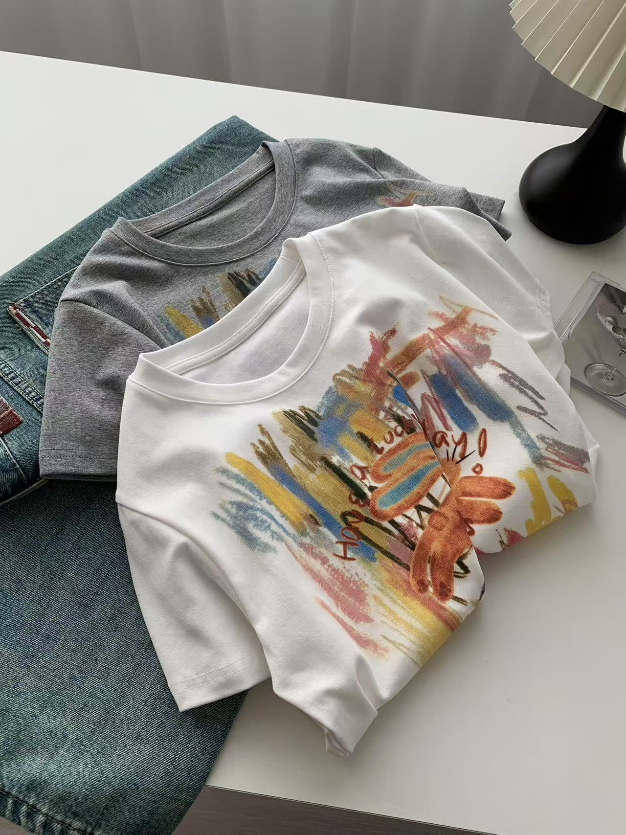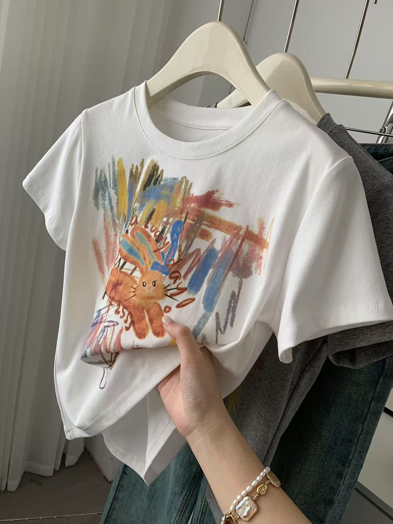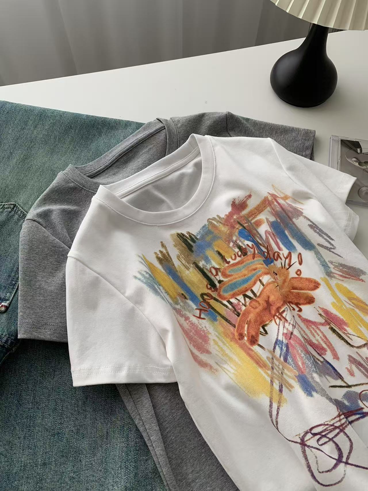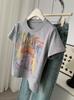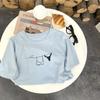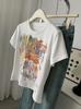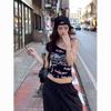 Camiseta de Manga Corta con Estampado de Tinta Blanca de Dibujos Animados Graffiti de Color para Mujer, Verano, Sentido del Diseño, Moda, Estilo Occidental, Top de Hombro Delgado