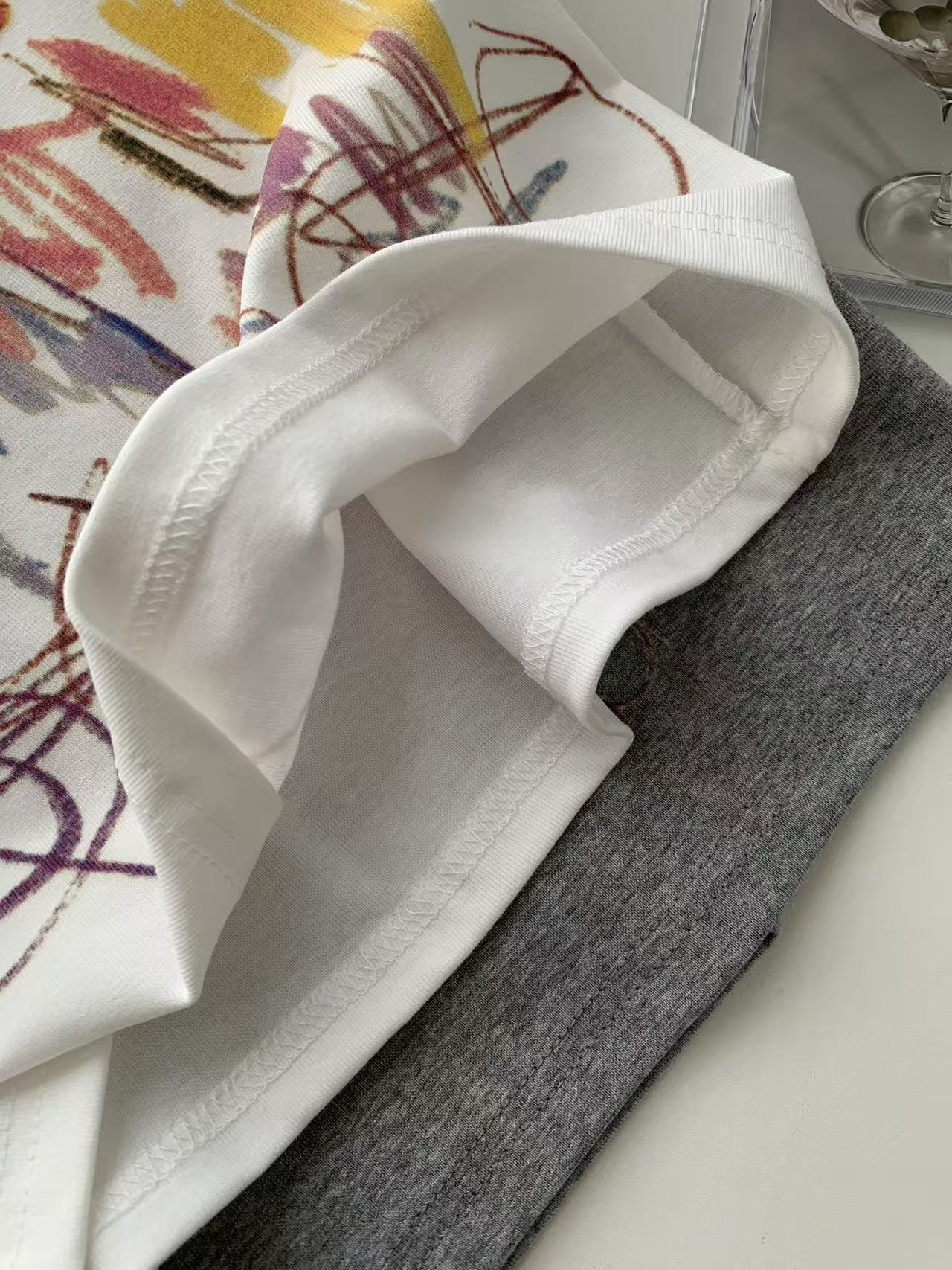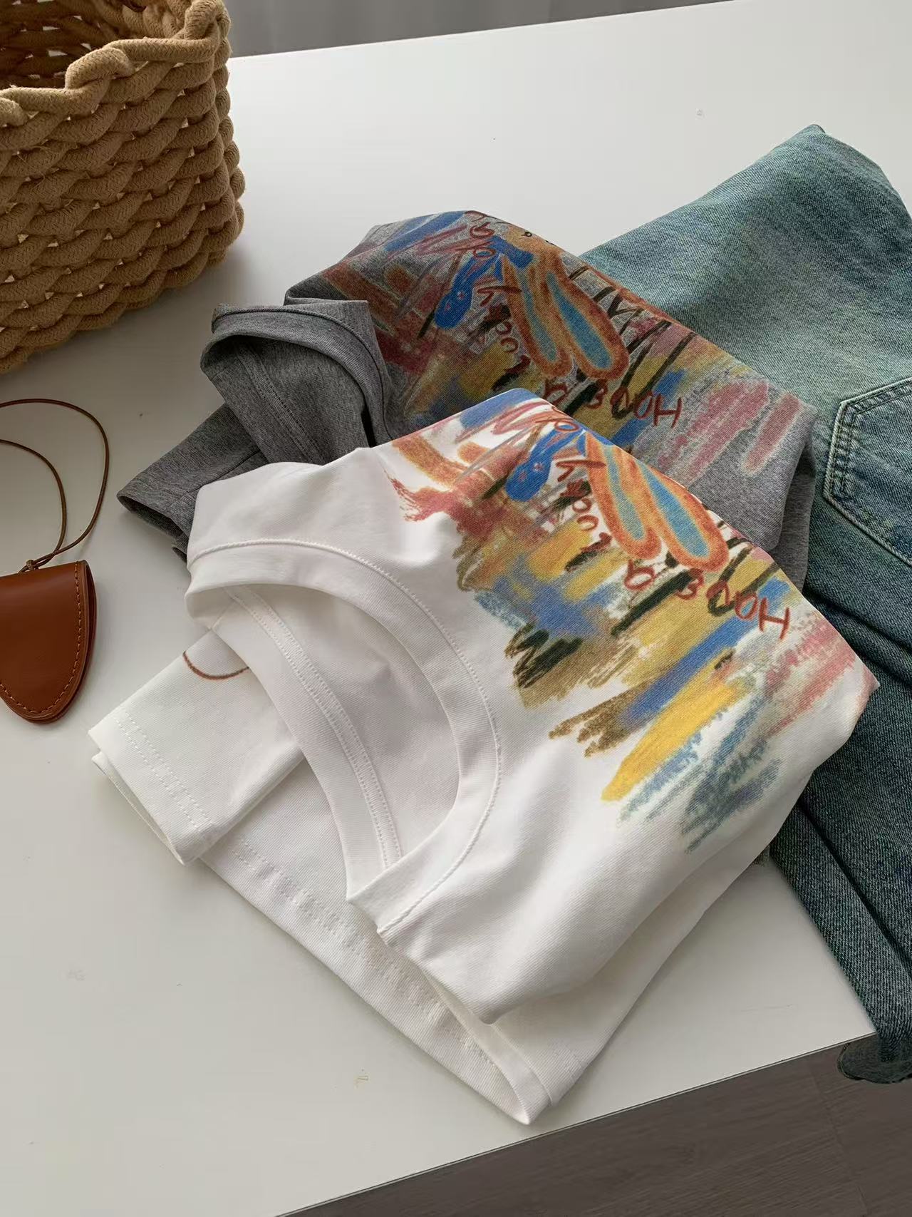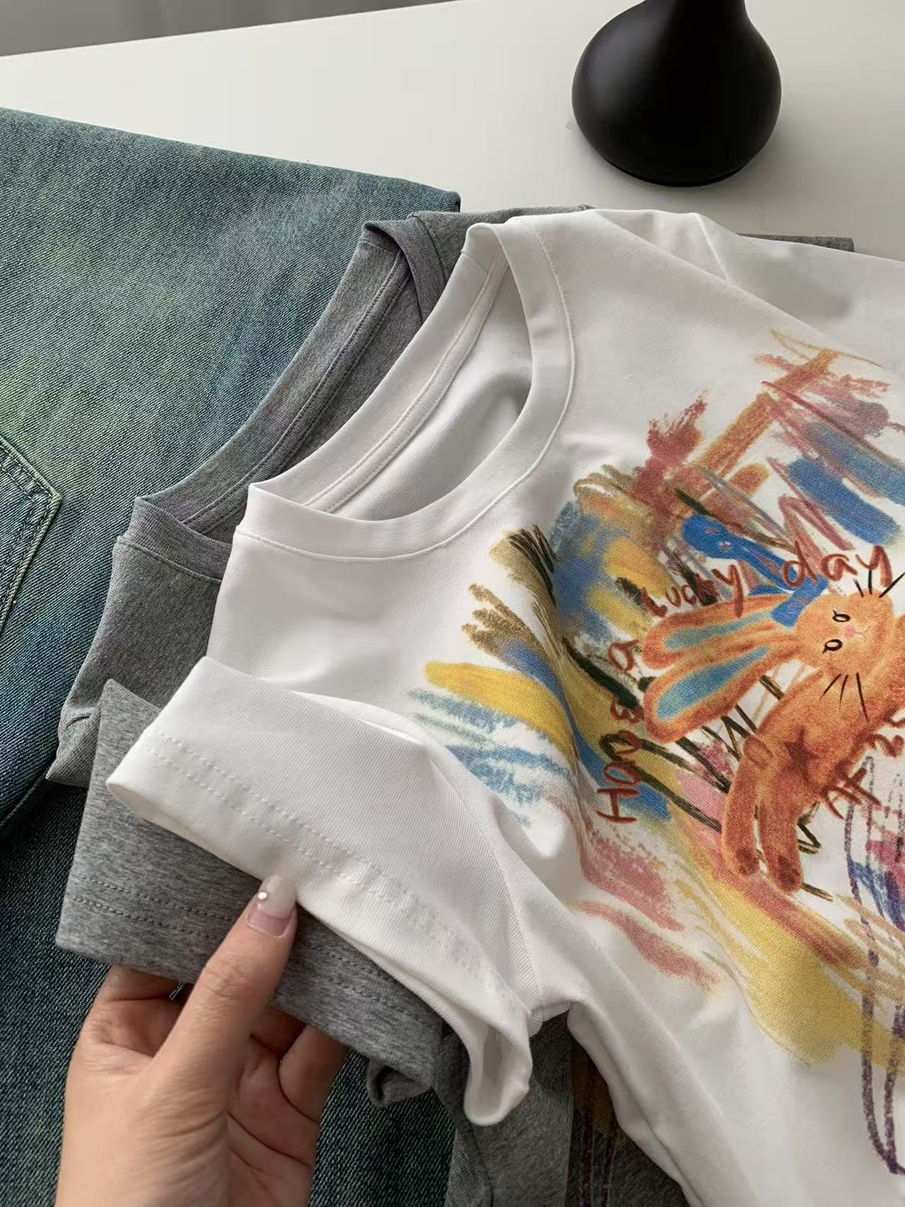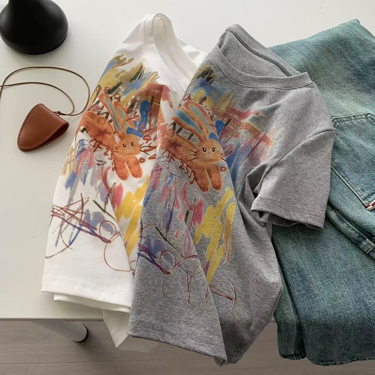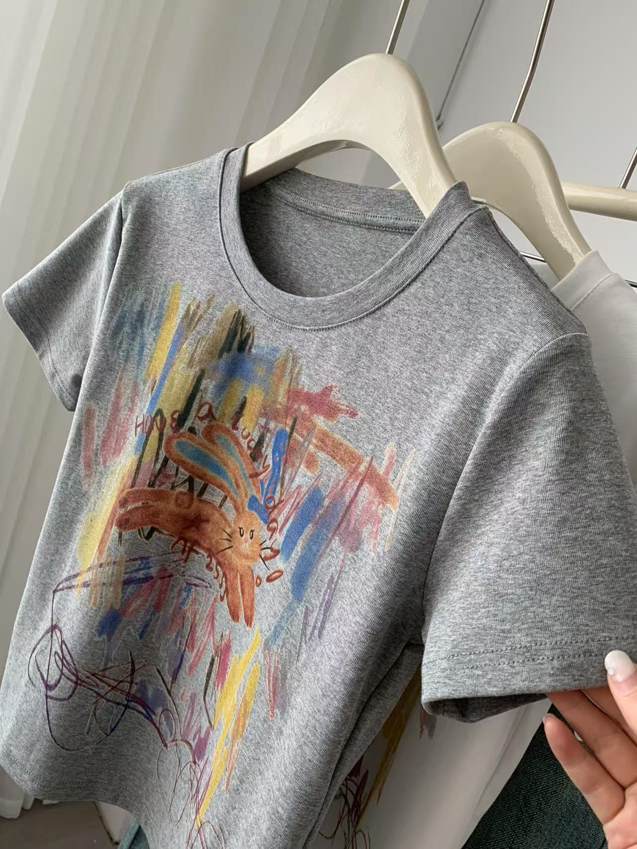 Camiseta de Manga Corta con Estampado de Tinta Blanca de Dibujos Animados Graffiti de Color para Mujer, Verano, Sentido del Diseño, Moda, Estilo Occidental, Top de Hombro Delgado