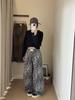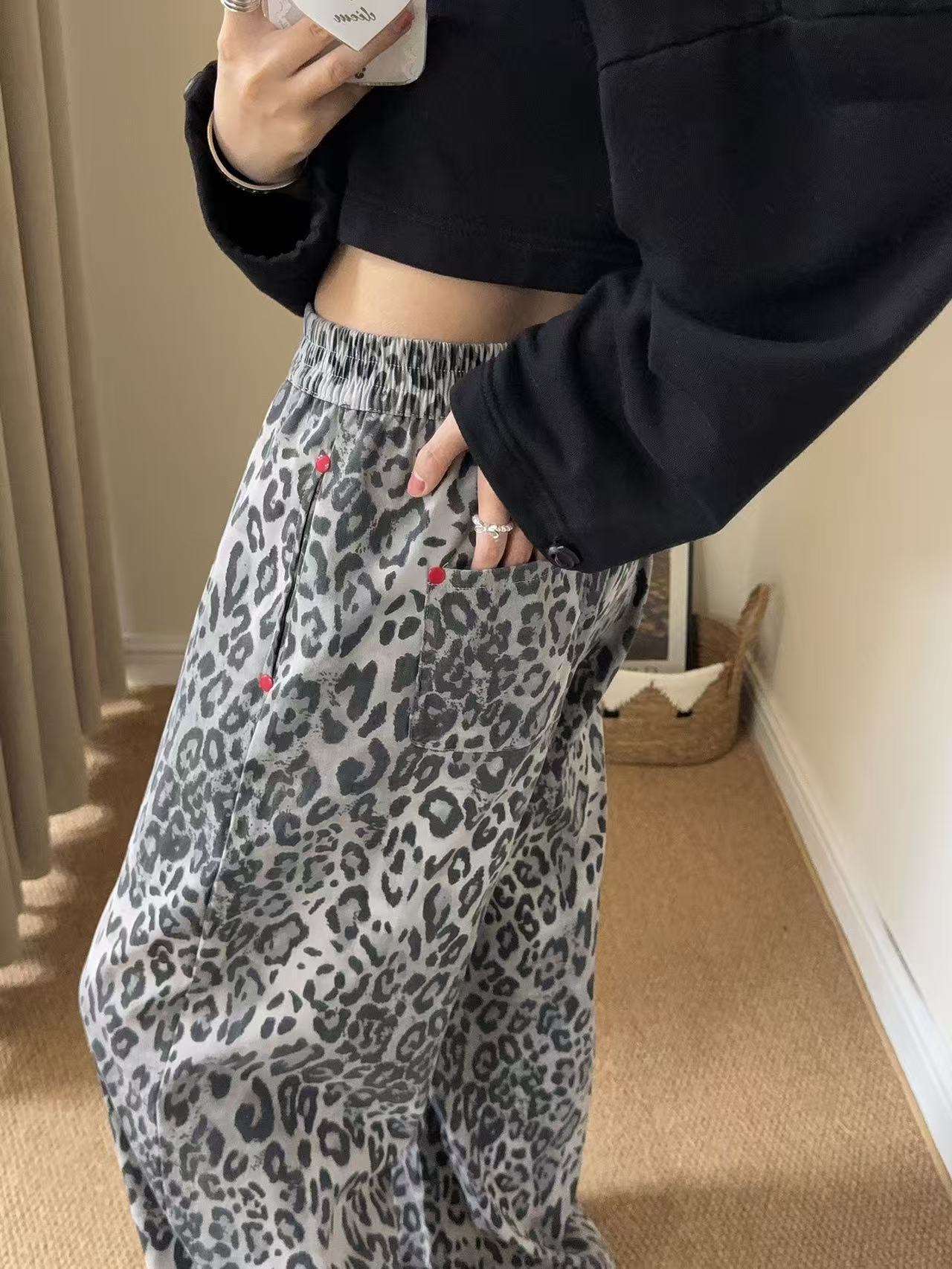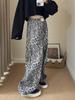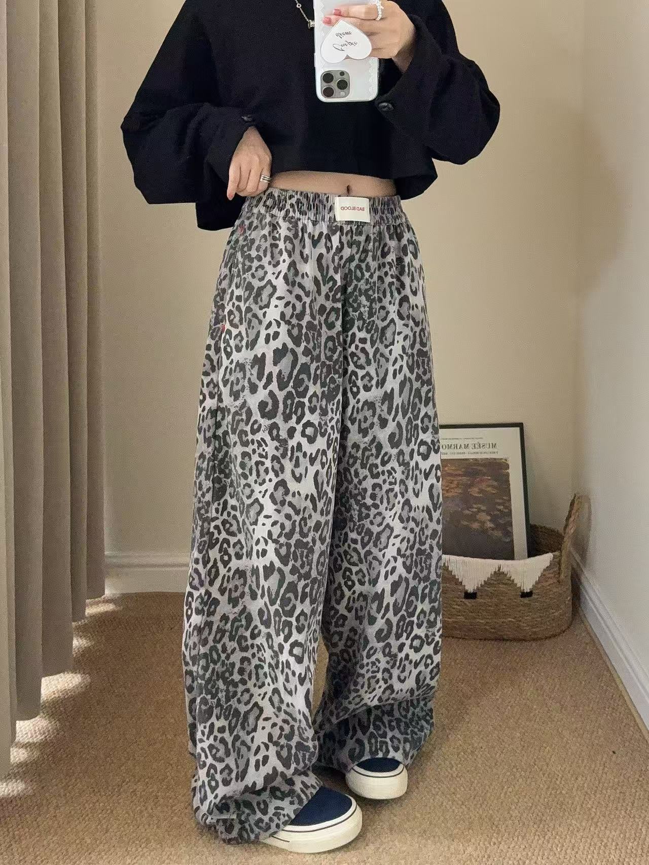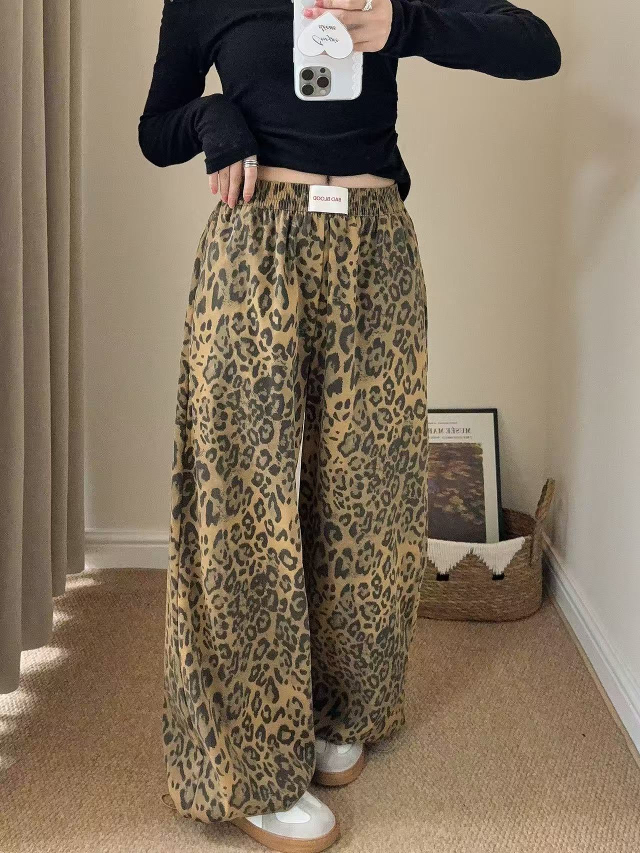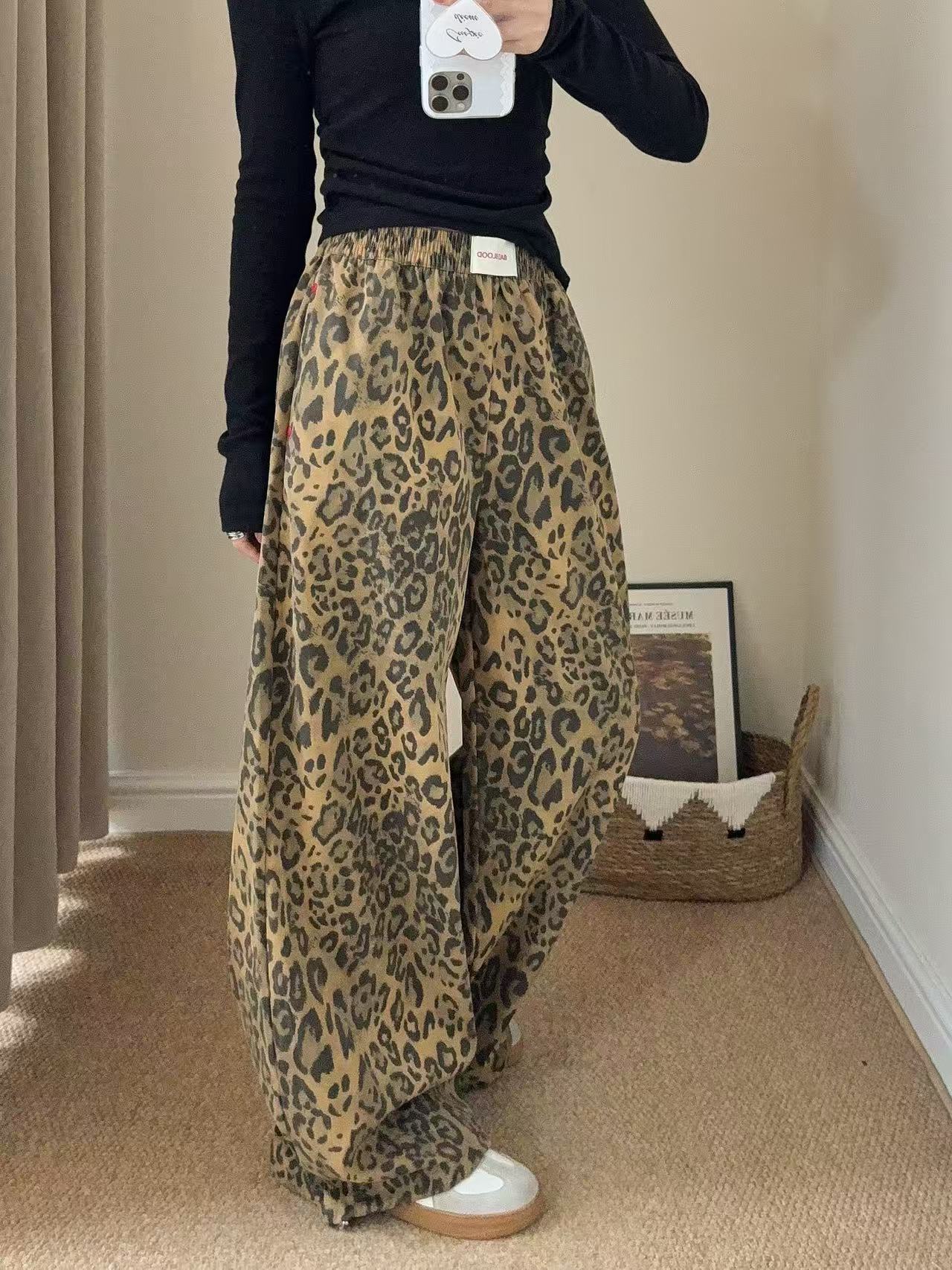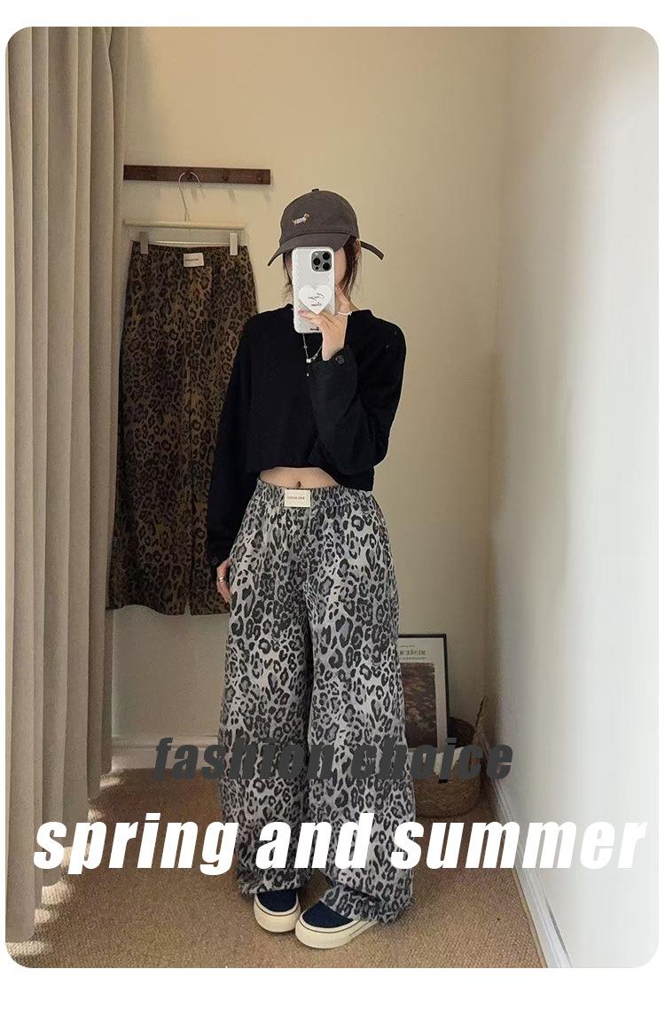 Pantalones de Pierna Ancha con Remaches Estampado Leopardo Americano Estilo Coreano Mujer Otoño Nuevo Cintura Alta Sueltos Adelgazantes Pierna Recta Versátiles Casuales Pantalones Largos
