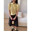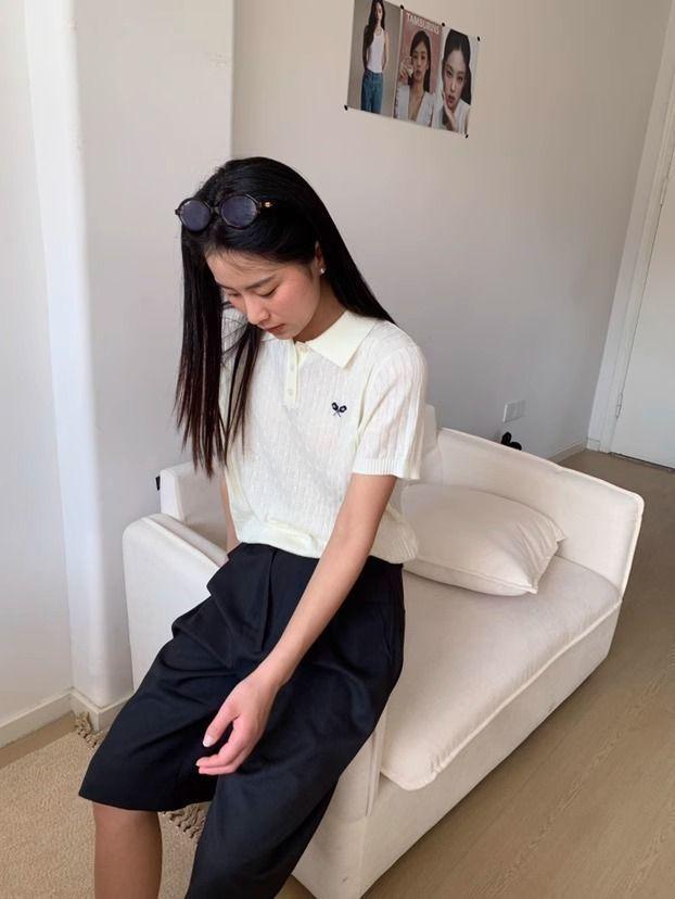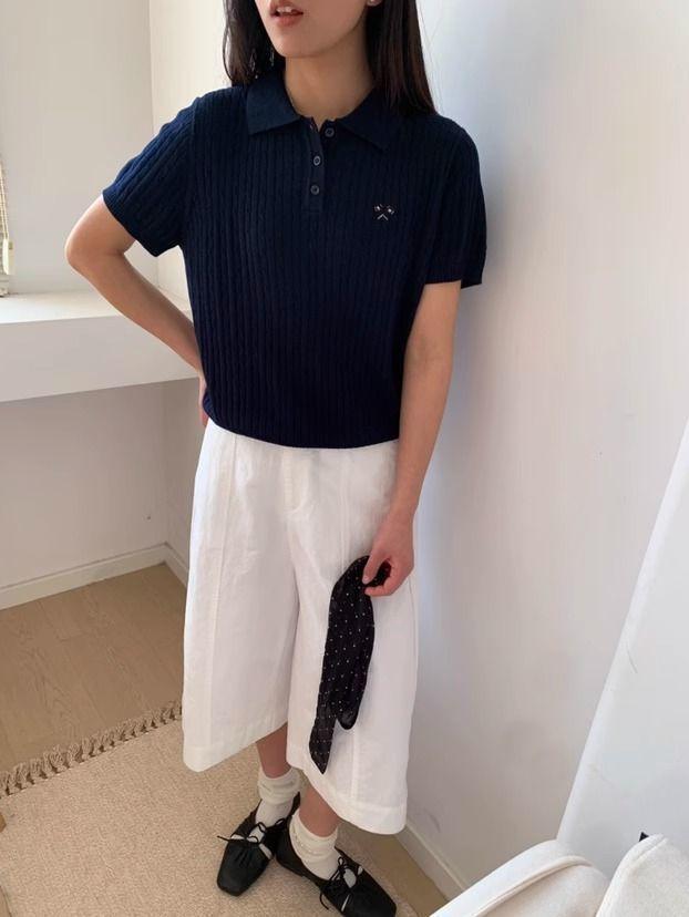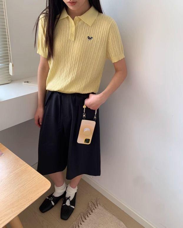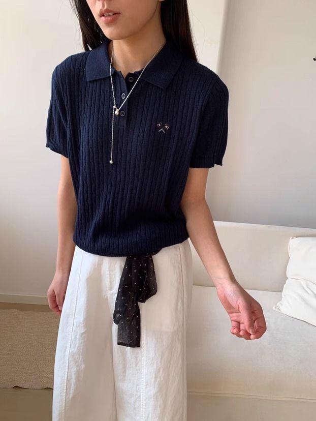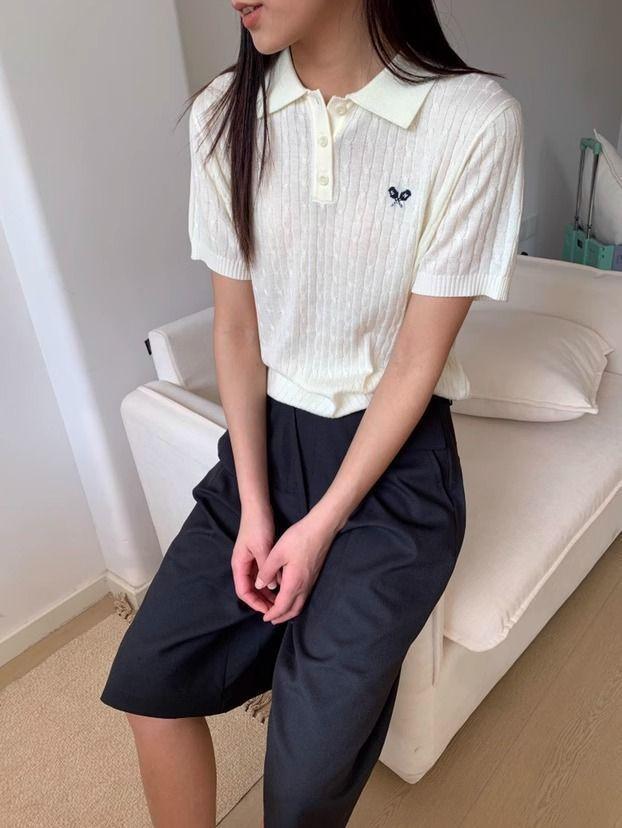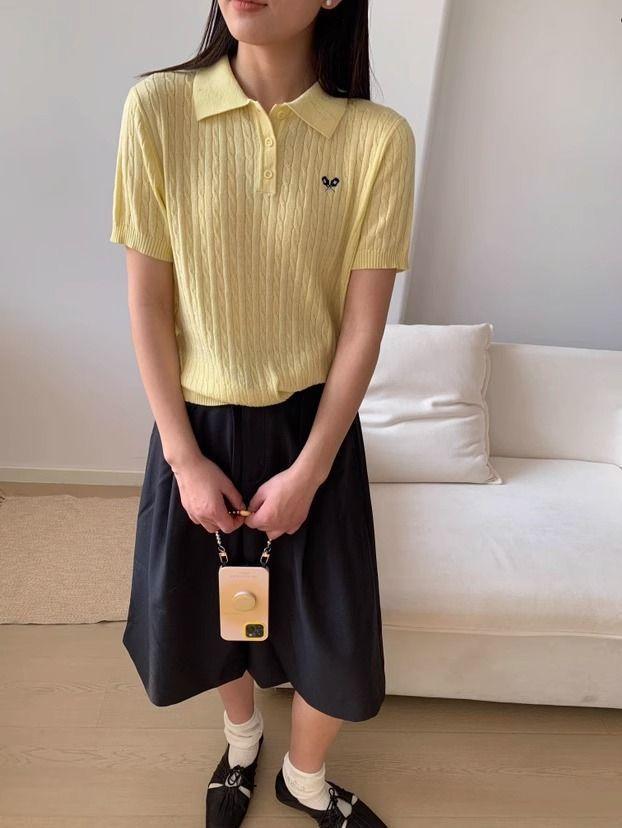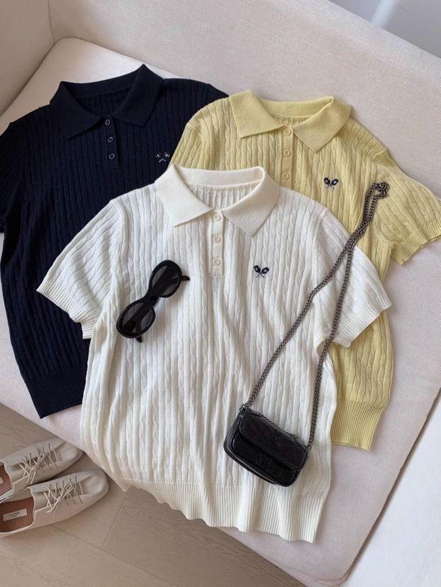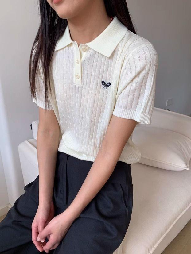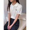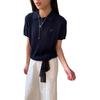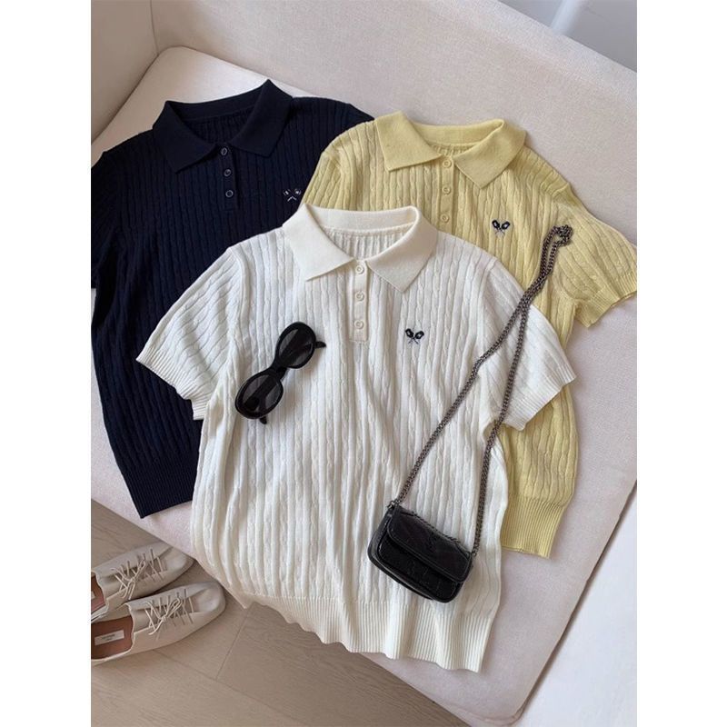 2025 Nuevo Estilo de Verano Estilo Preppy Cuello Polo Tejido de Punto de Manga Corta Tejido de Punto Corto de Nicho para Mujer Camiseta Bordada