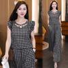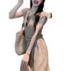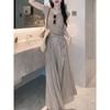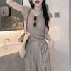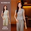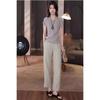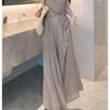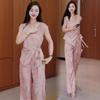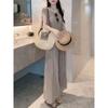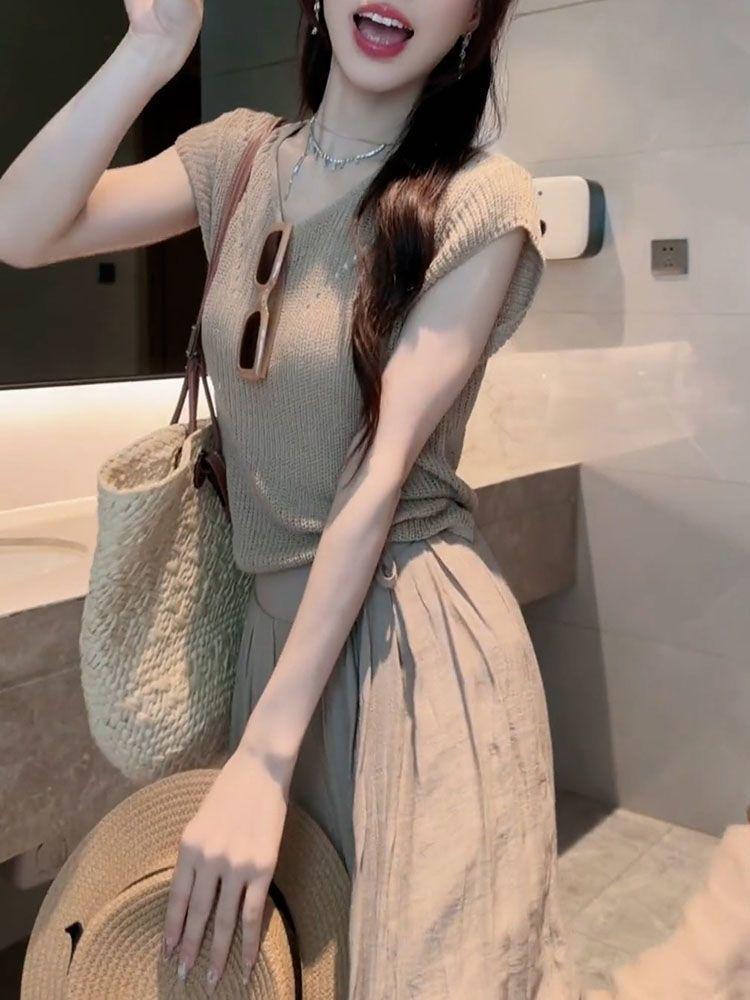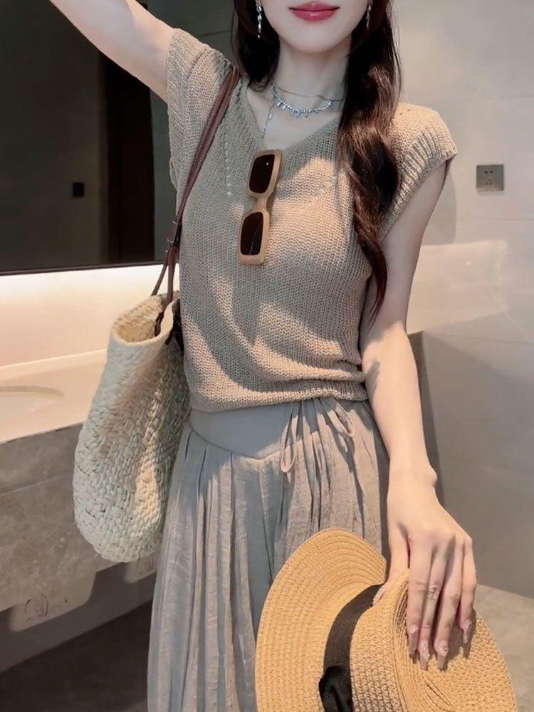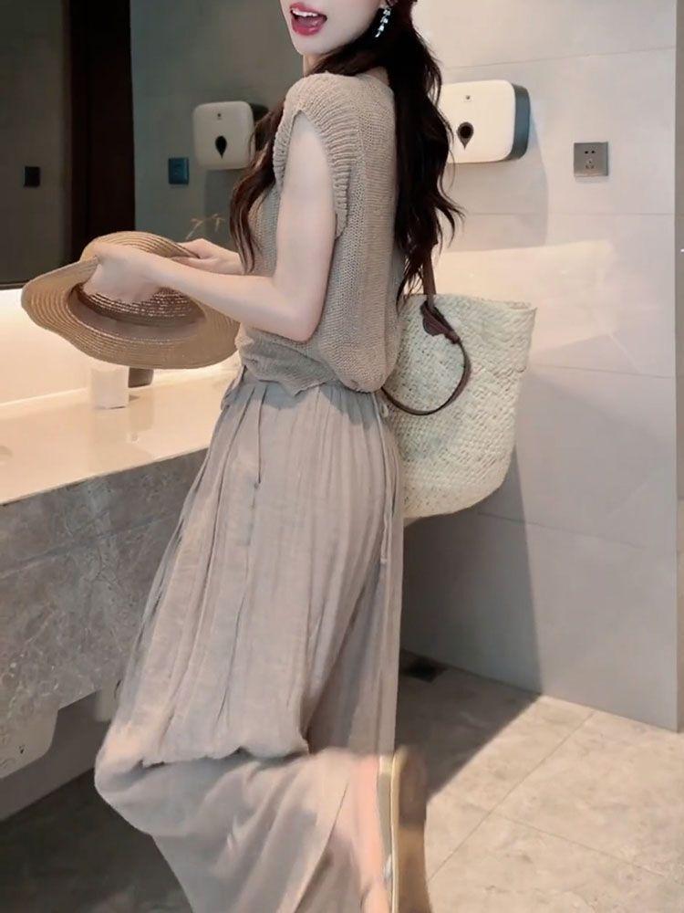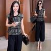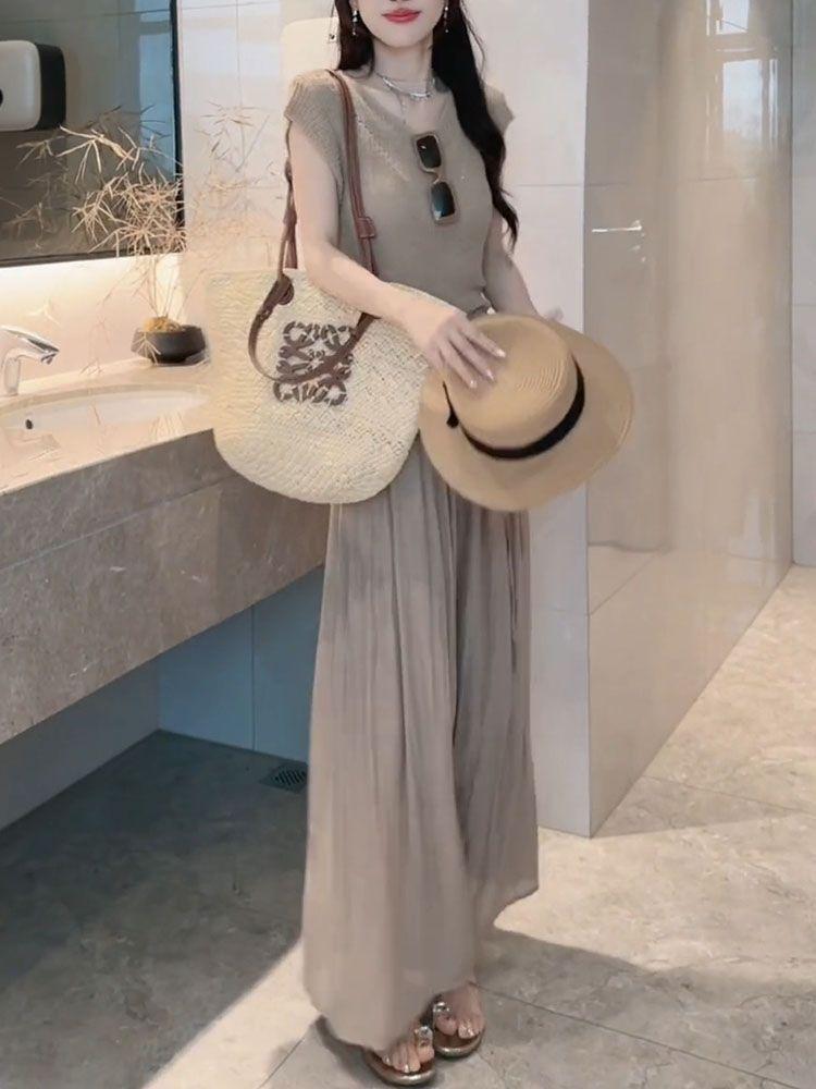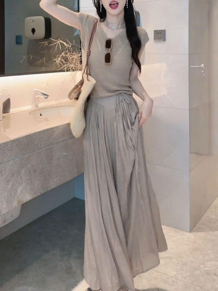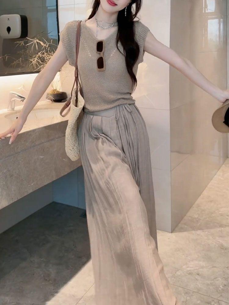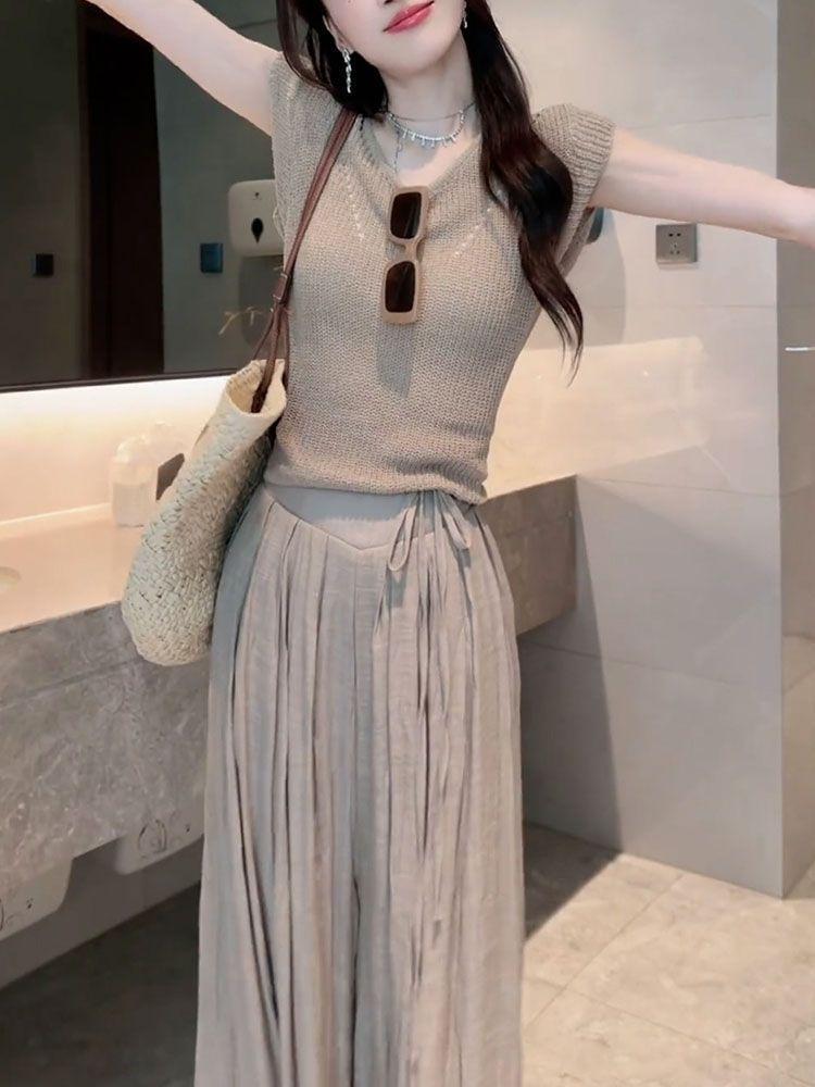 Conjunto completo de verano 2025 nuevo top suave francés de cuello redondo con manga corta calada para mujer, pantalones largos holgados con caída de talle alto