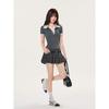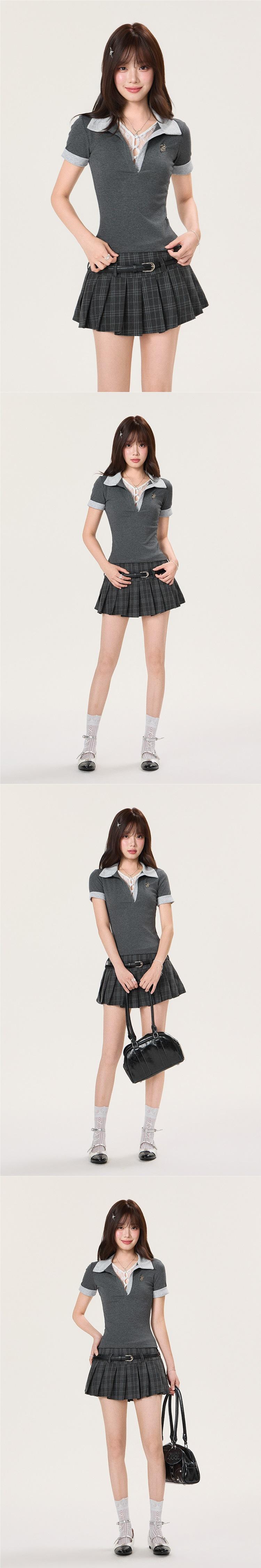Grey top, Short skirt [with belt]
