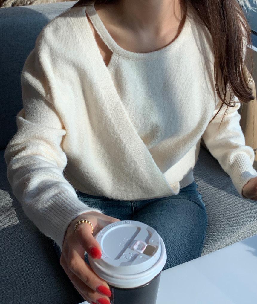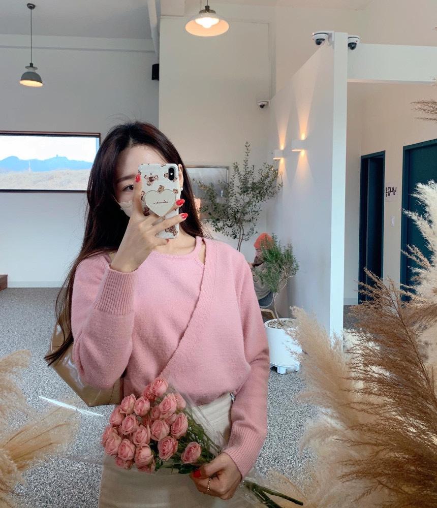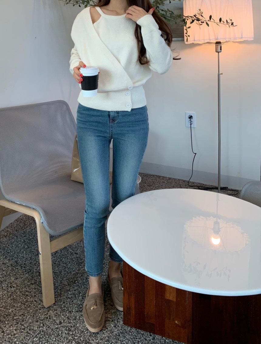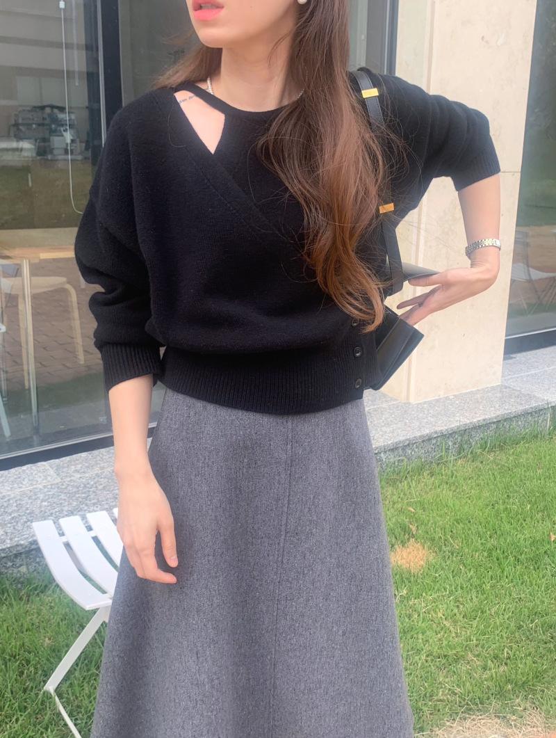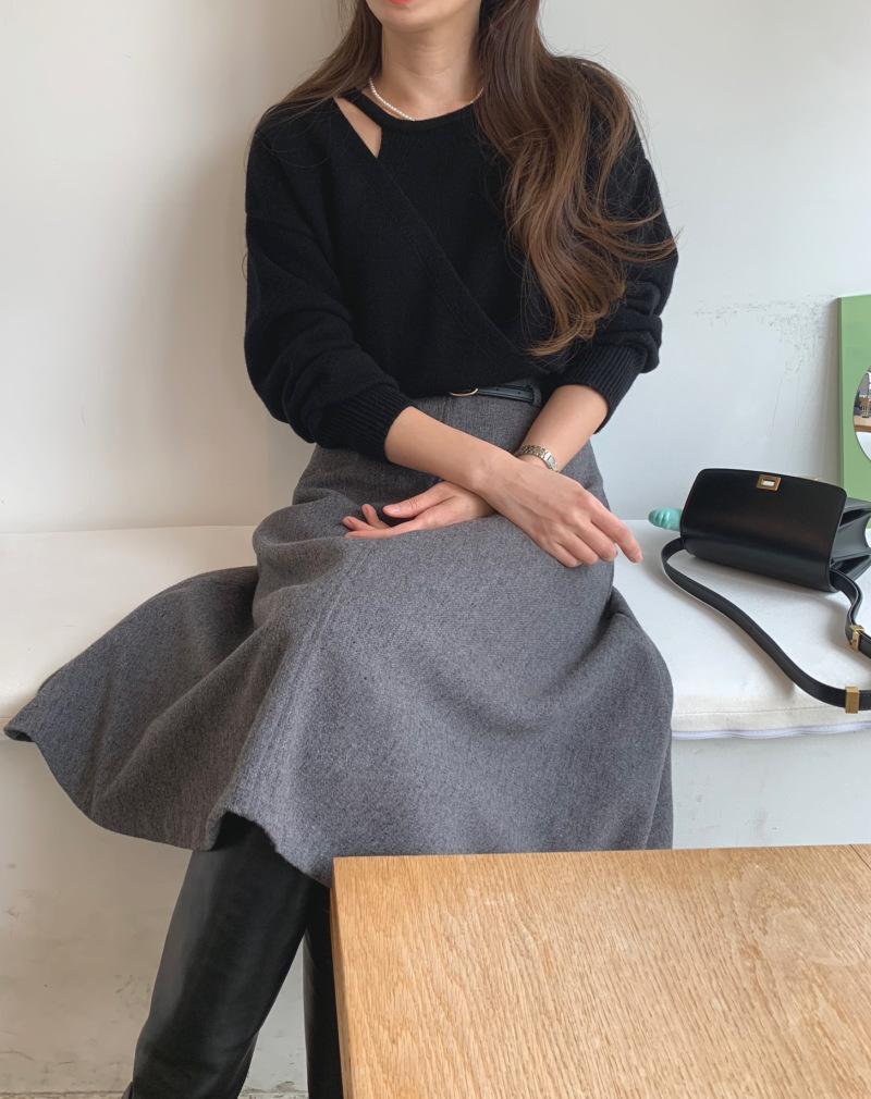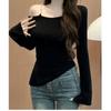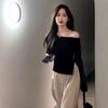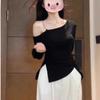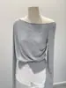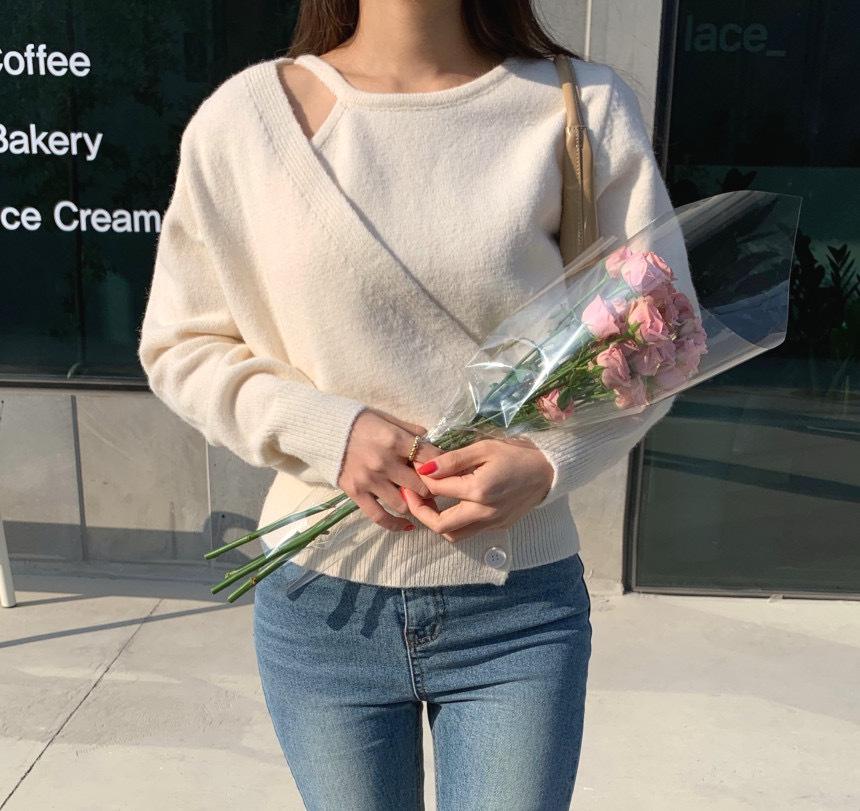 Suéter de Punto con Temperamento Francés, Diseño con Hombros Descubiertos, Sentido Irregular, Tres Botones, Adelgazante para la Cintura, Manga Larga