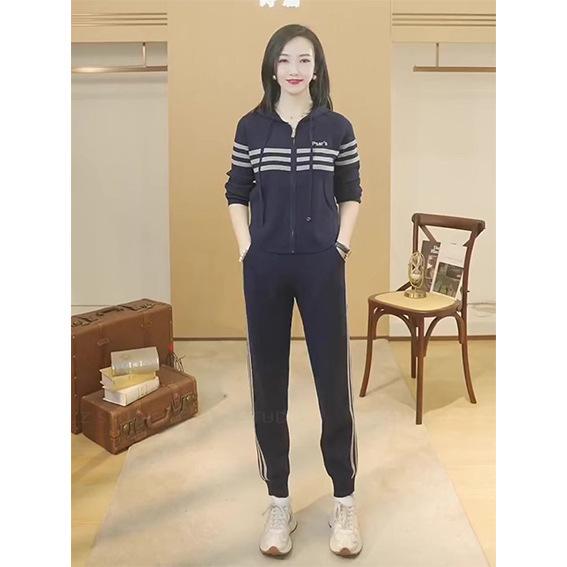 Conjunto Deportivo Casual para Mujer 2025 Nueva Moda de Primavera y Otoño Estilo Extranjero Reductor de Edad Cárdigan a Rayas Sudadera con Capucha Conjunto de Dos Piezas