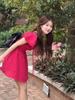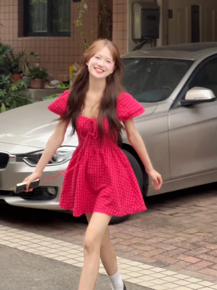 Vestido de Tirantes a Cuadros Rojo Rosa Dulce Francés de Manga Corta con Volantes para Mujer Verano Adelgazante de Cintura Sexy Falda de Niña