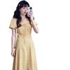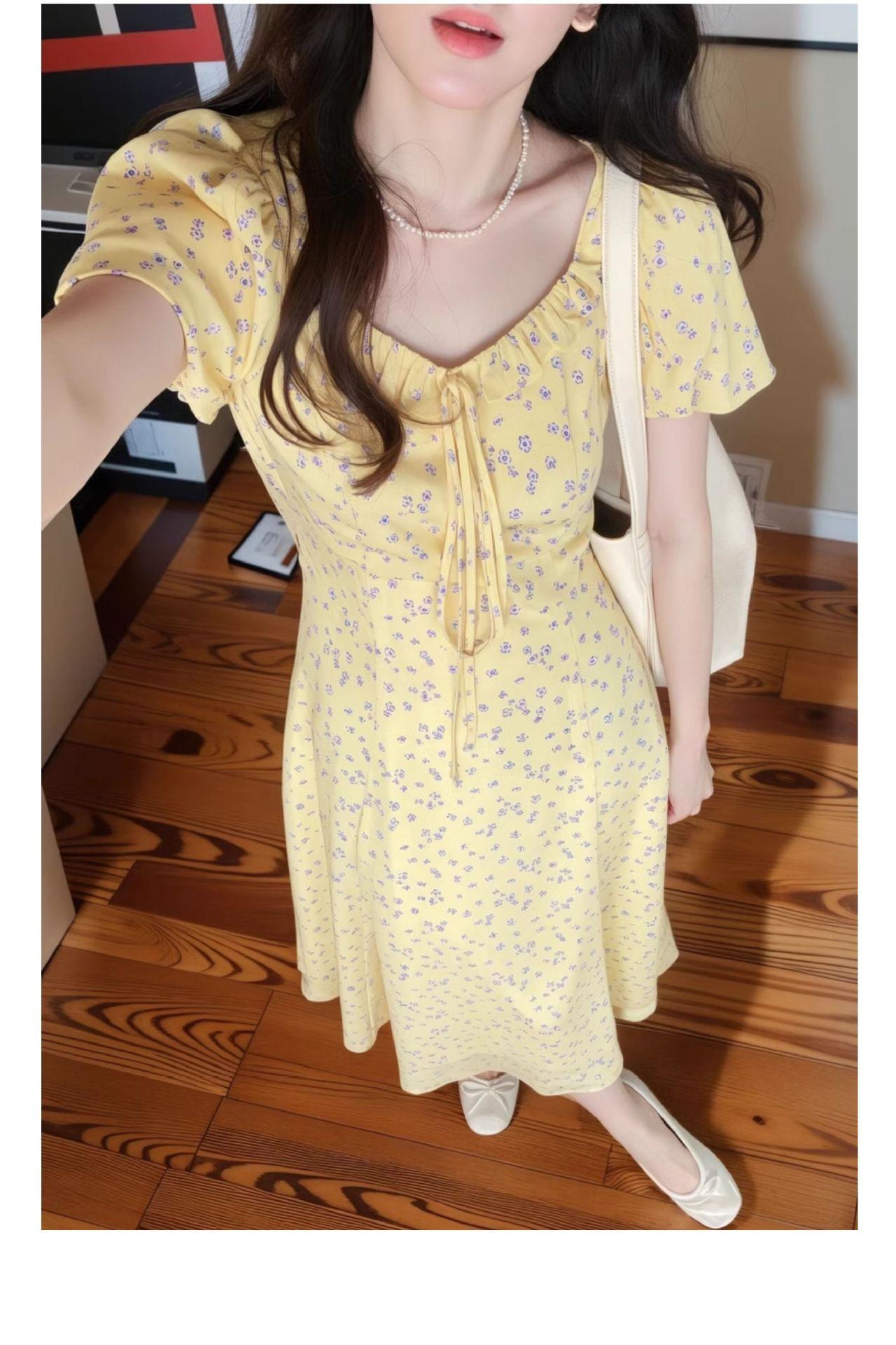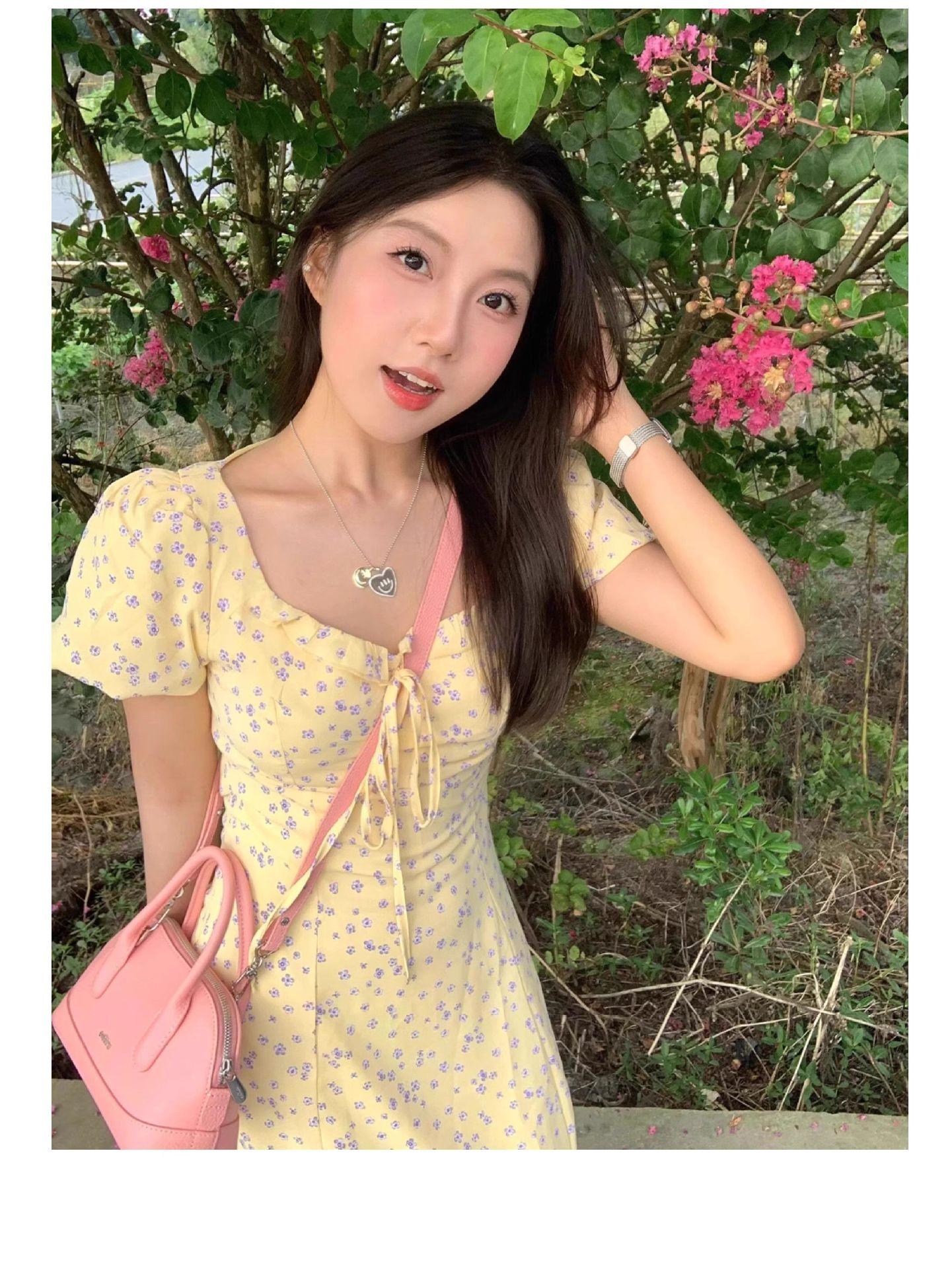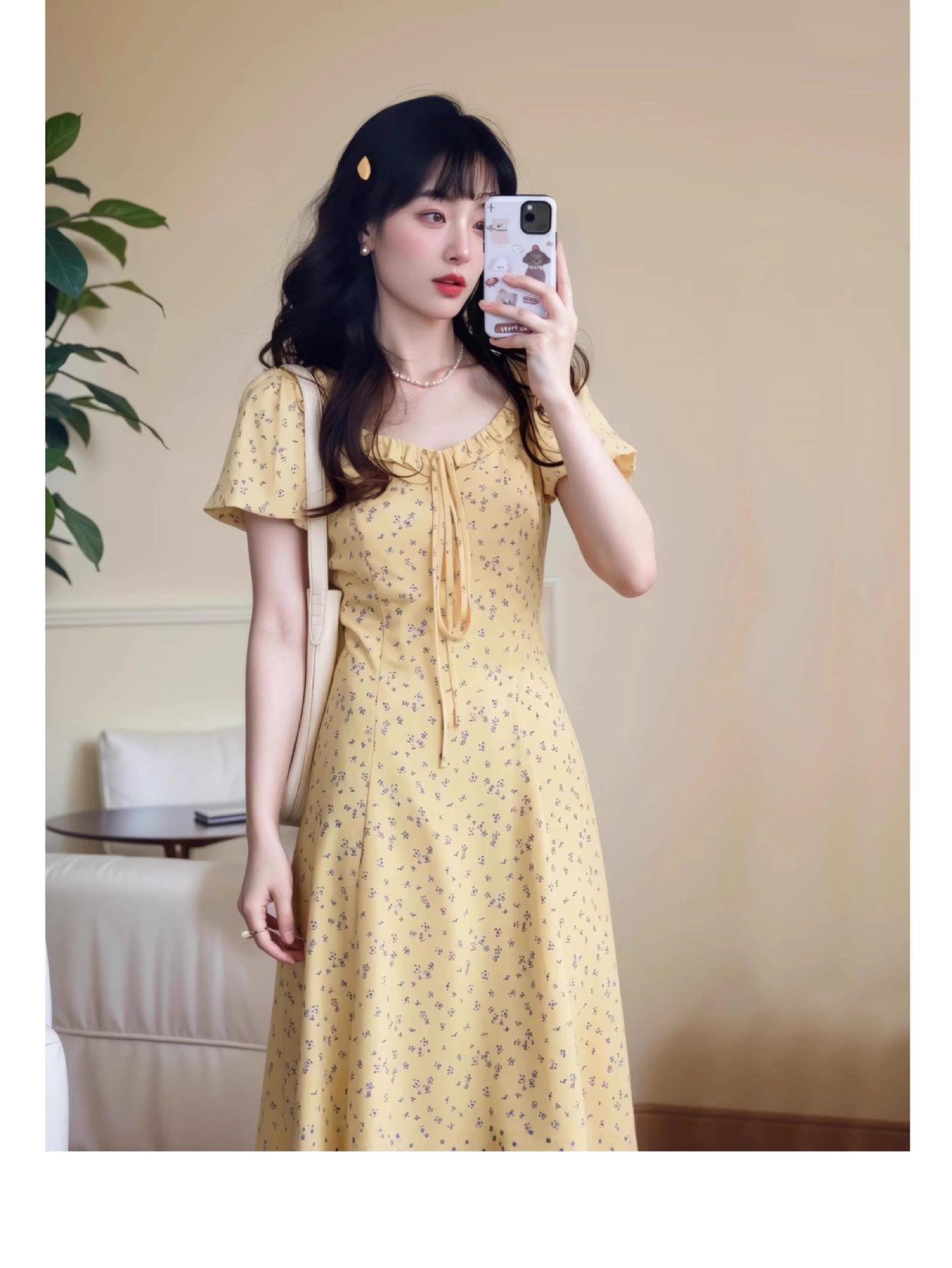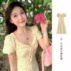 Vestido de Atmósfera Romántica Francesa Amarillo Floral Cuello Cuadrado Diseño de Verano para Mujer Cintura con Cordones Adelgazante Falda Larga