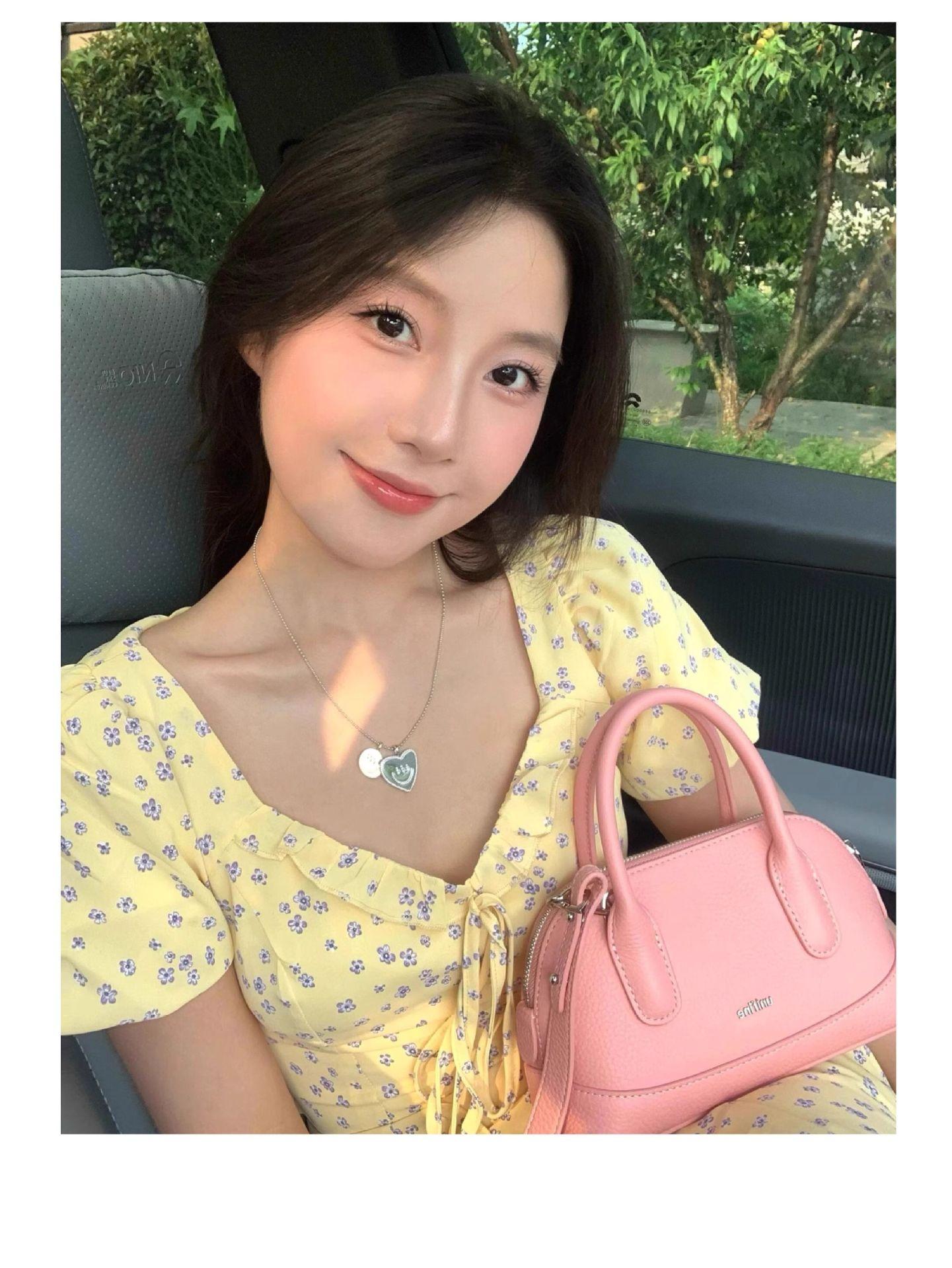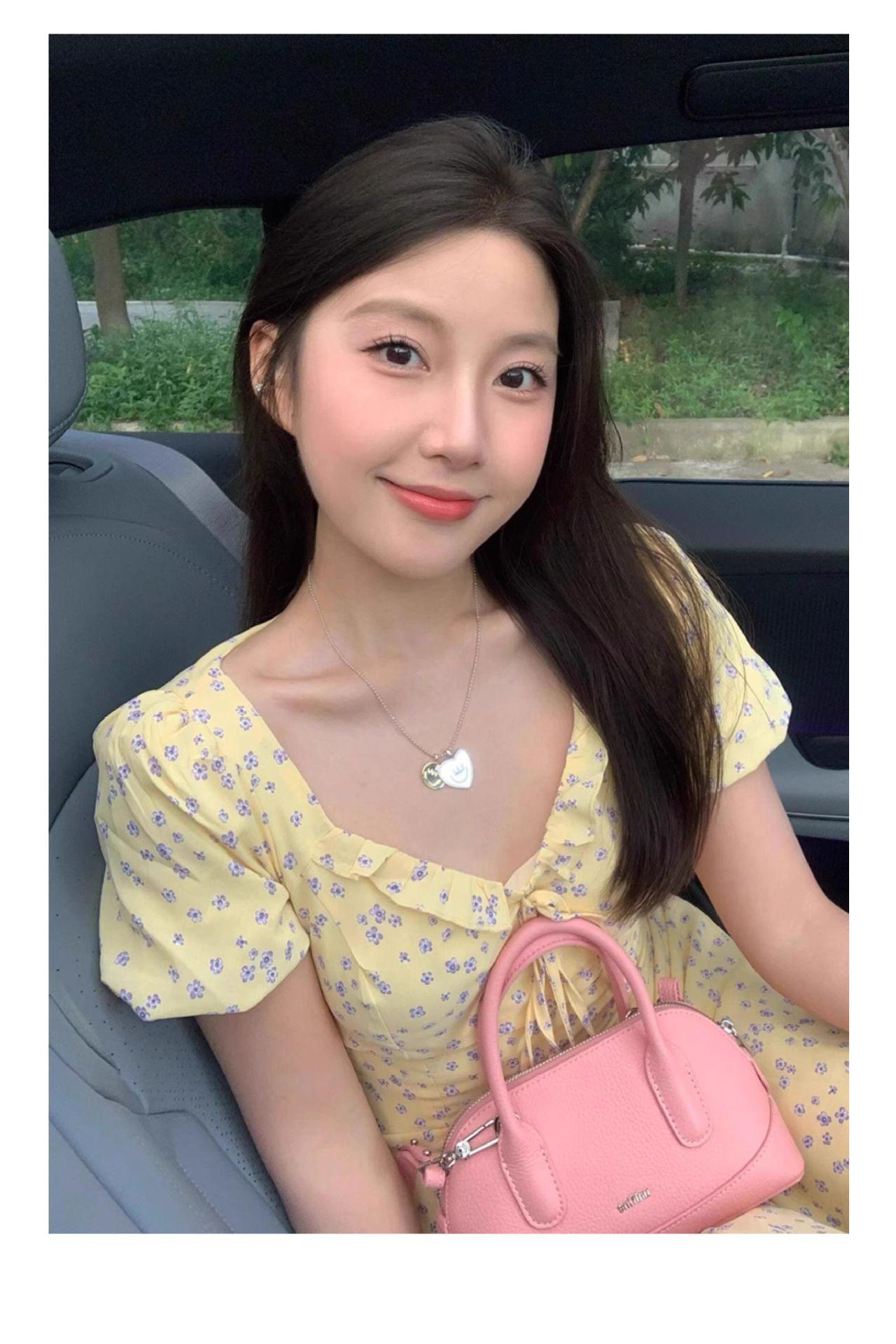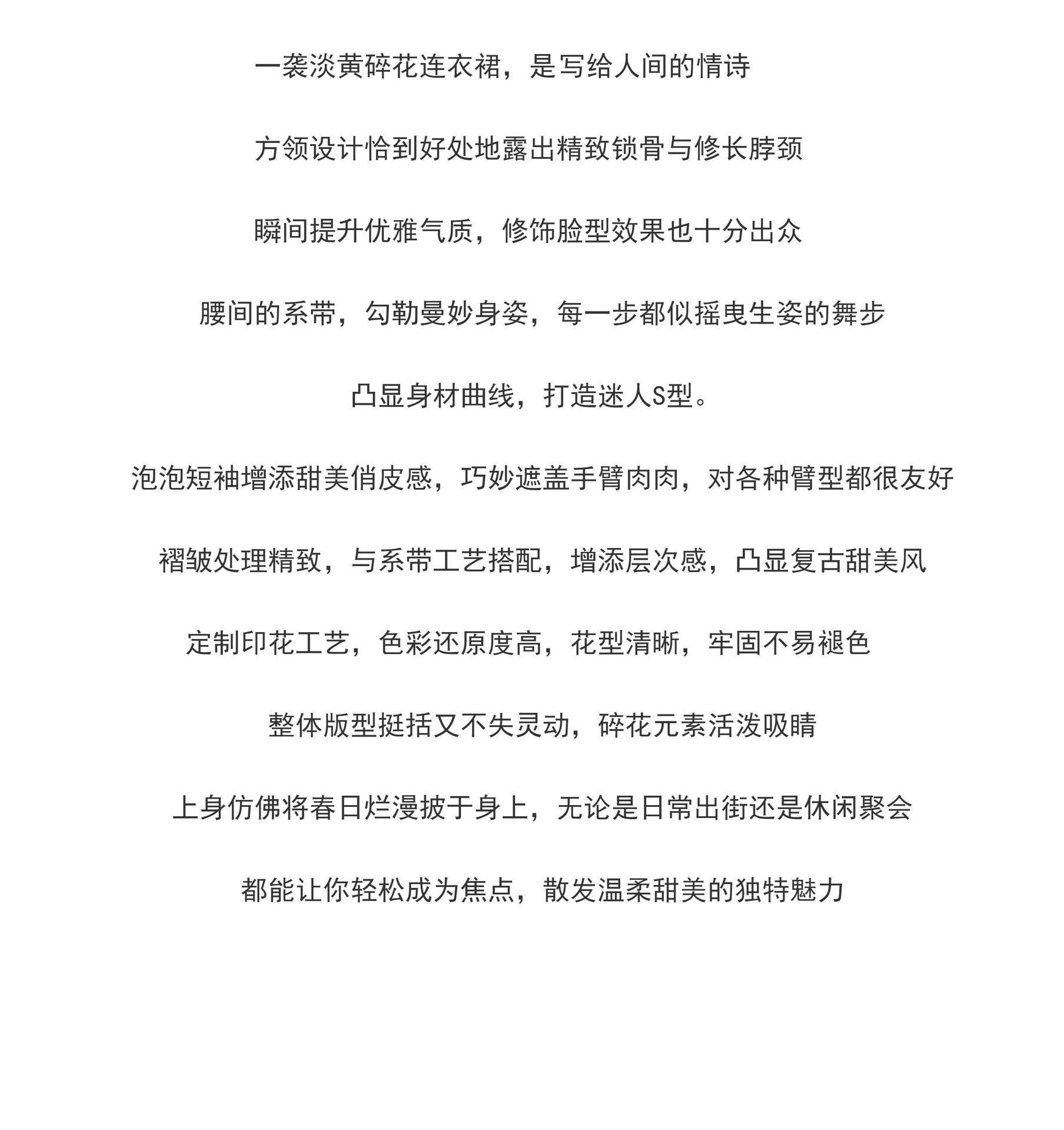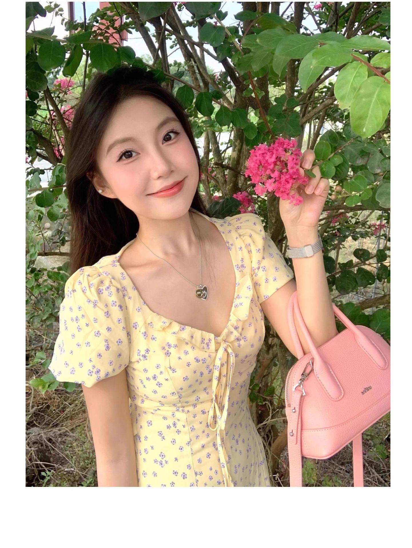 Vestido de Atmósfera Romántica Francesa Amarillo Floral Cuello Cuadrado Diseño de Verano para Mujer Cintura con Cordones Adelgazante Falda Larga