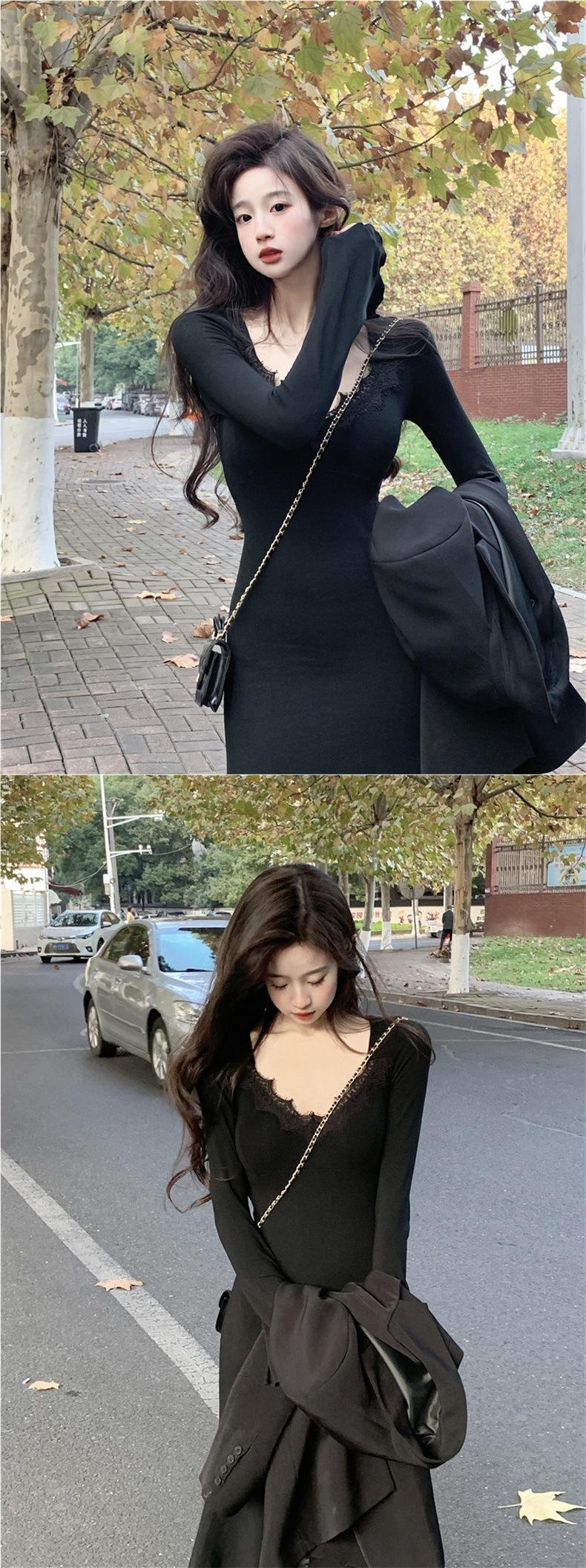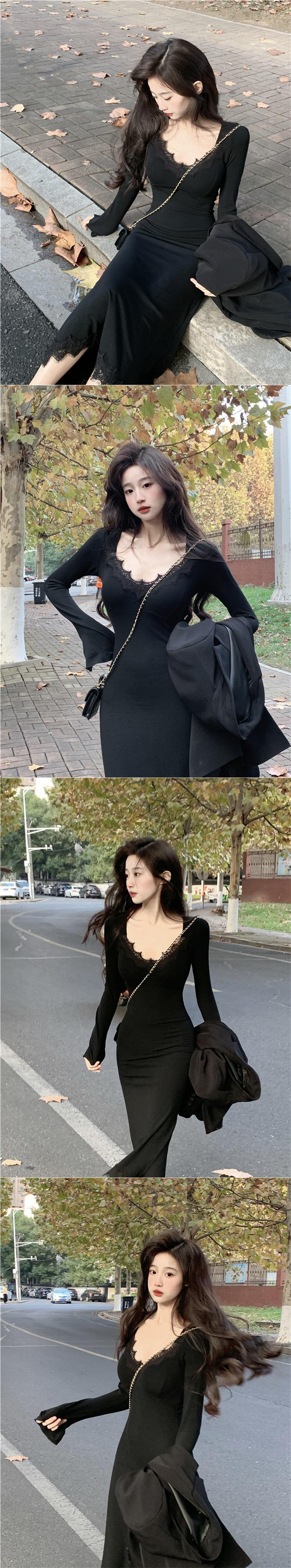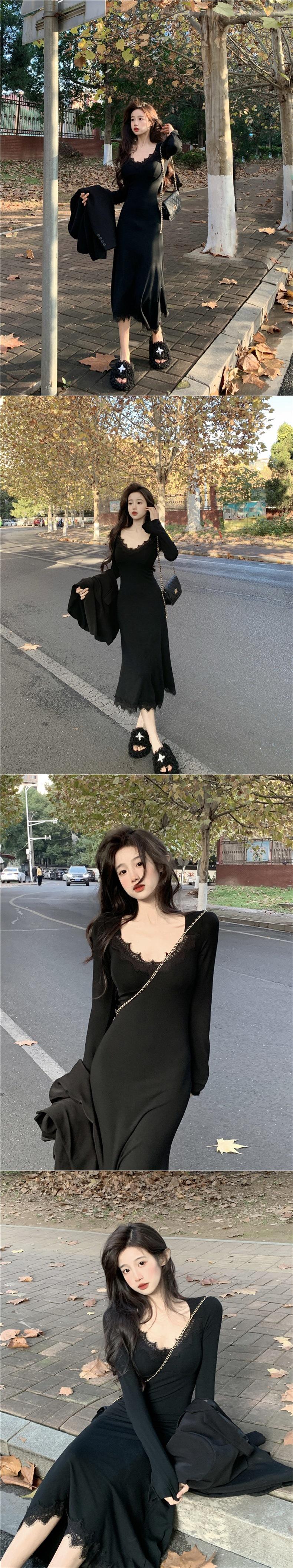 Nuevo Vestido de Primavera de Manga Larga con Parches de Cola de Pez para Mujer Base Negro Encaje Cintura Adelgazante Vestido de Temperamento Vestido Largo