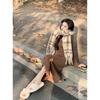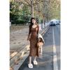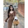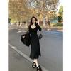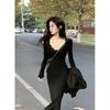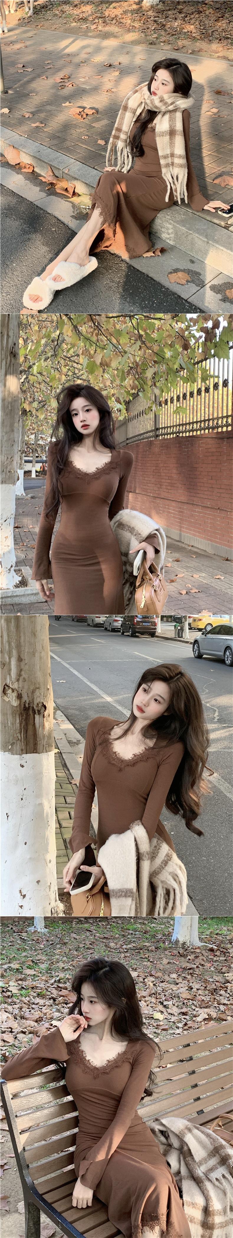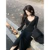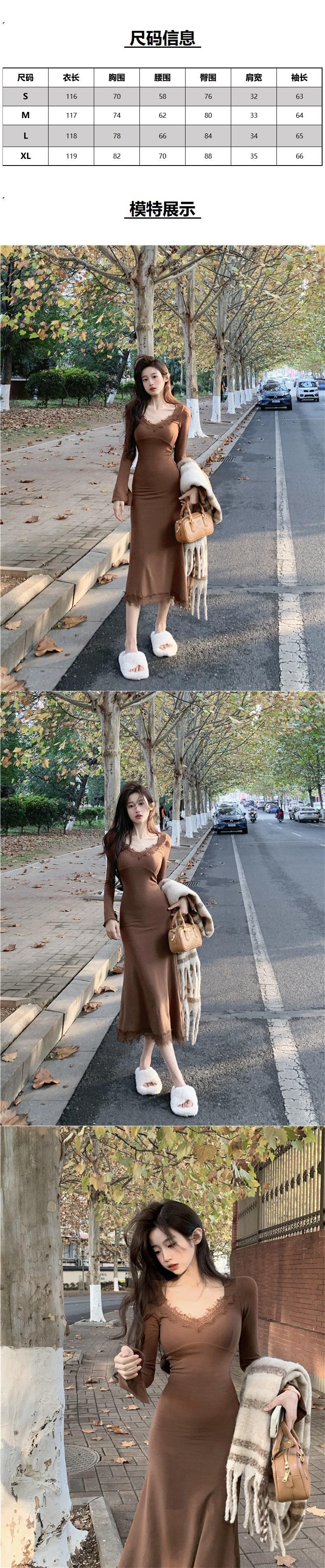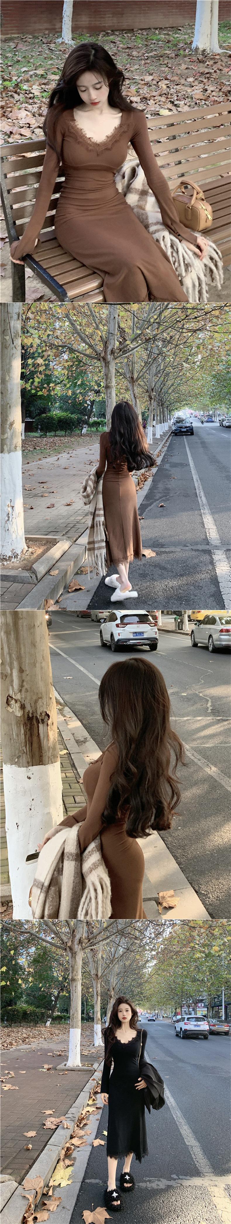 Nuevo Vestido de Primavera de Manga Larga con Parches de Cola de Pez para Mujer Base Negro Encaje Cintura Adelgazante Vestido de Temperamento Vestido Largo