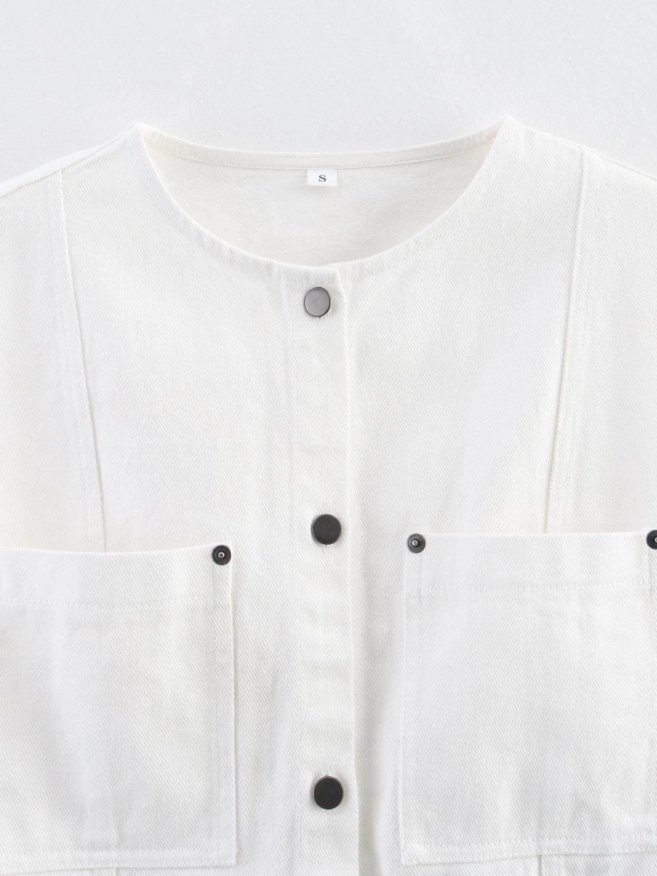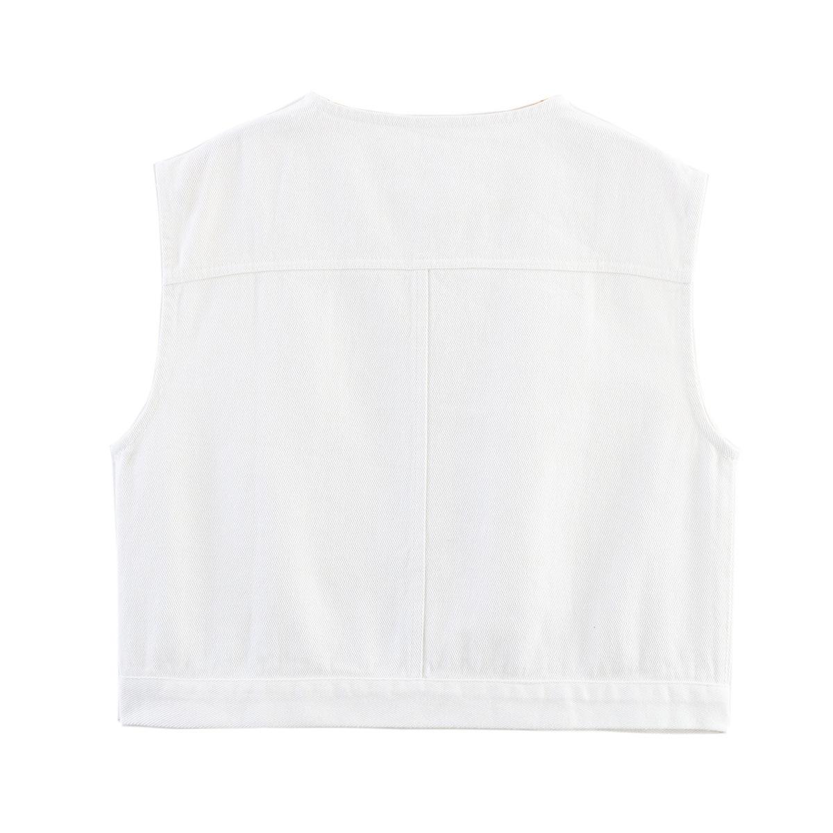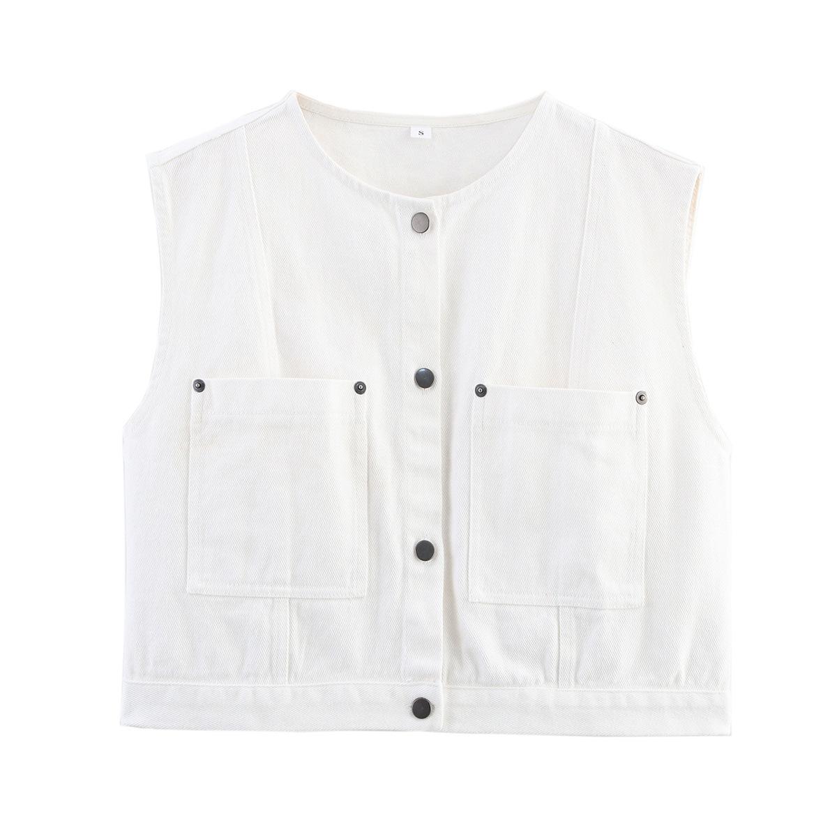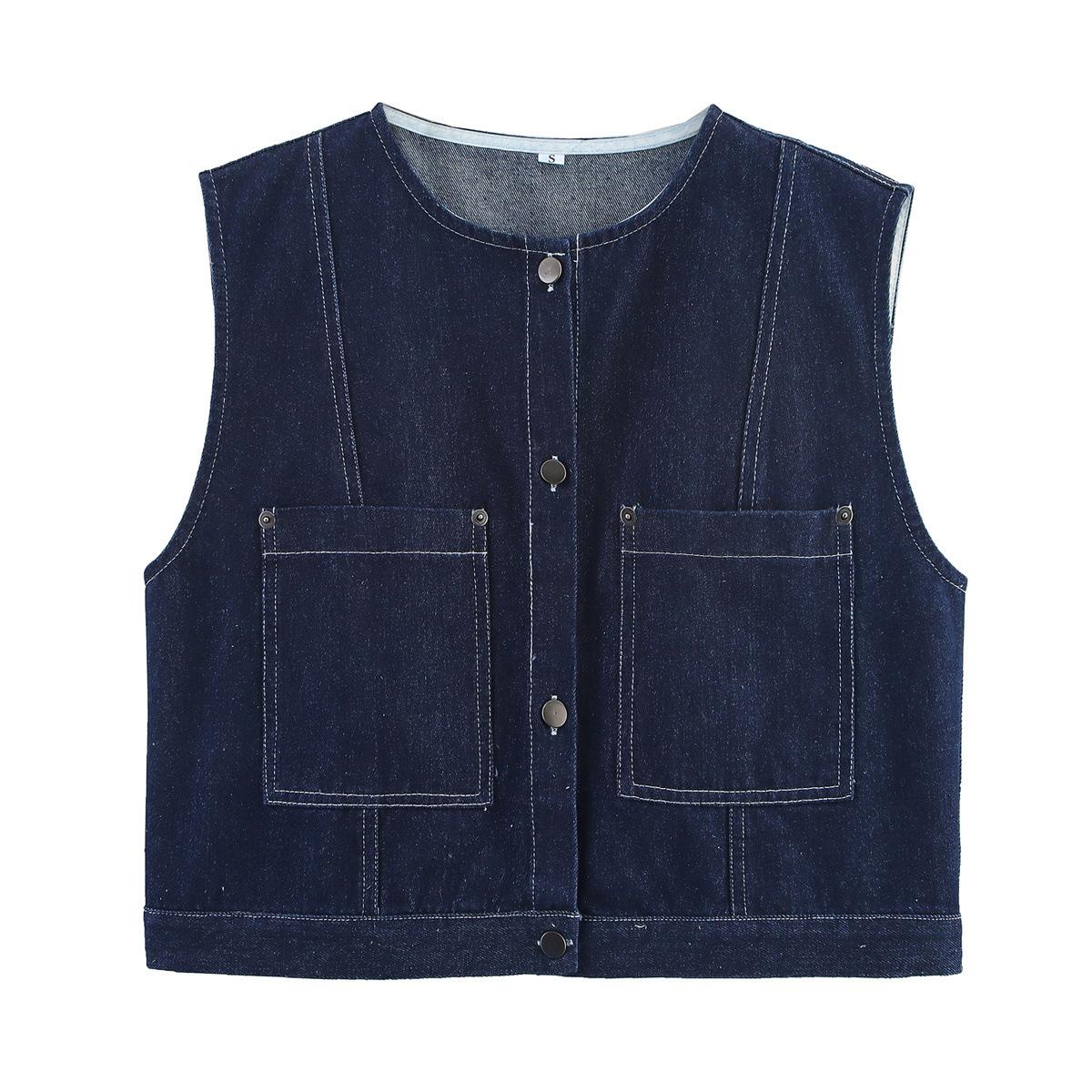 Z Primavera/Verano Nuevo Chaleco de Mezclilla sin Mangas con Cuello Redondo para Mujer, Ajustado Versátil, Top con Bolsillo, Tendencia