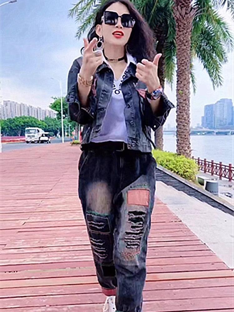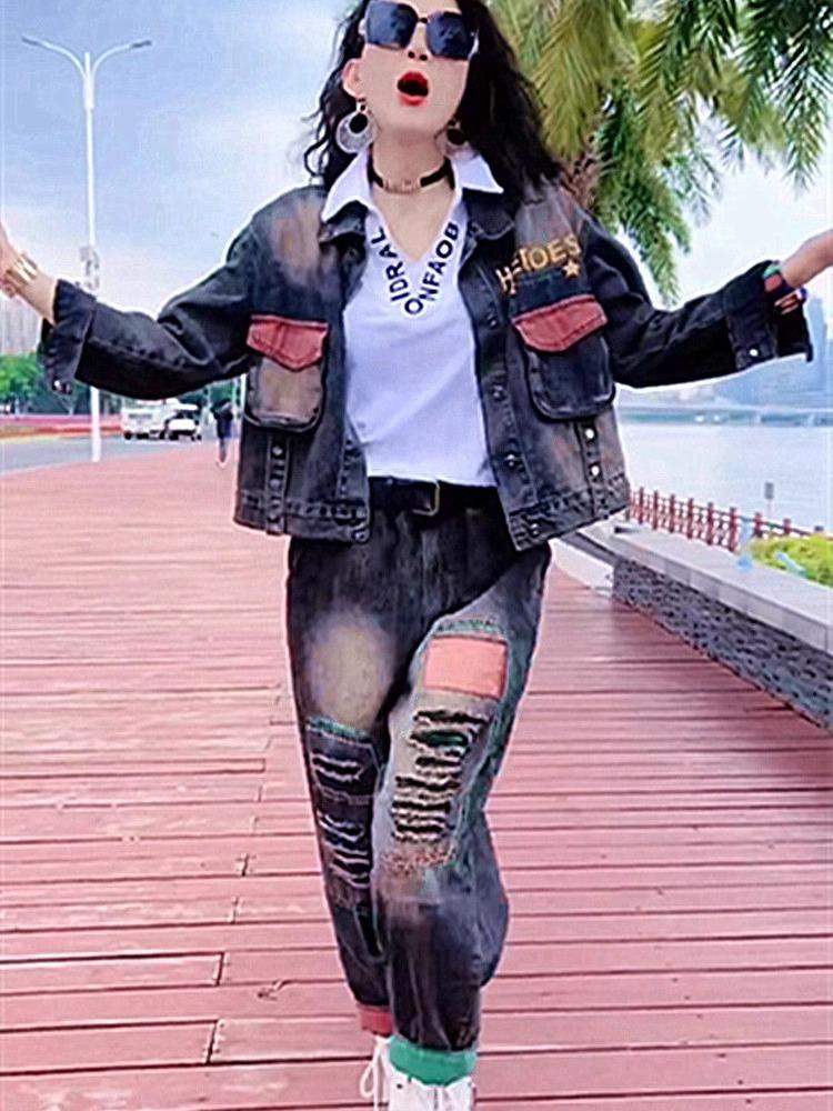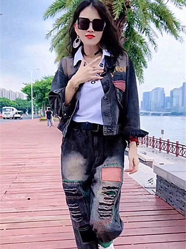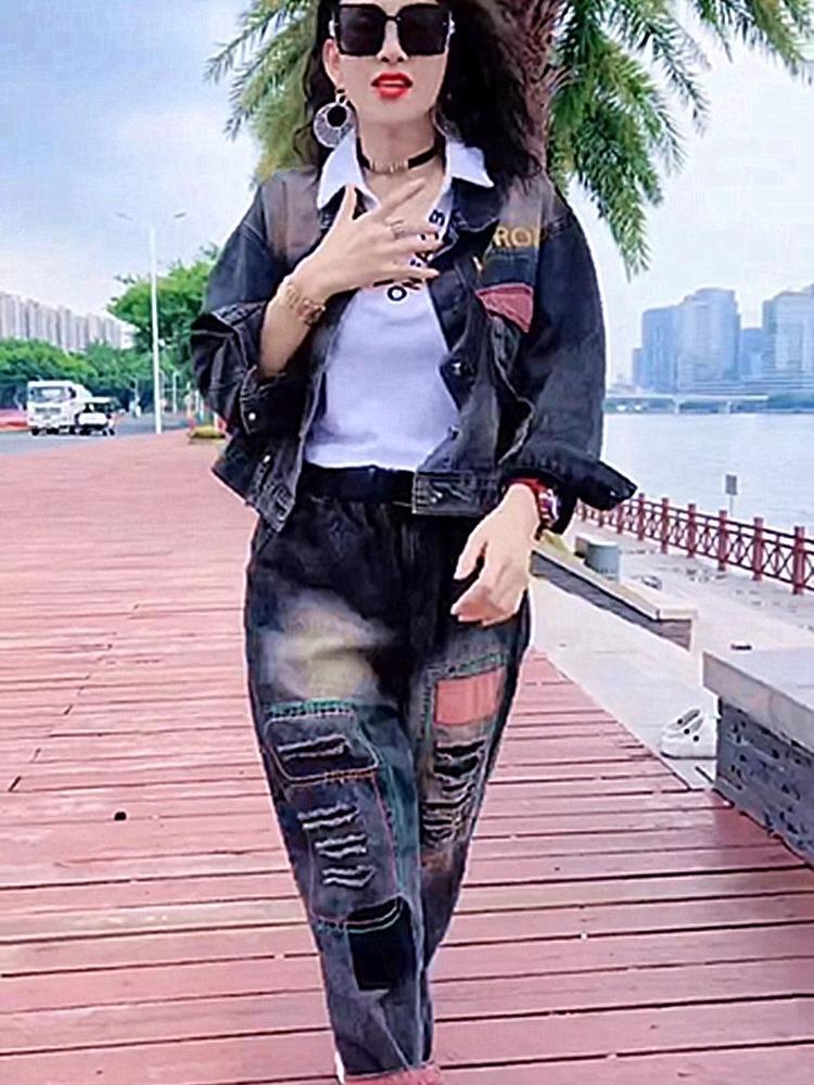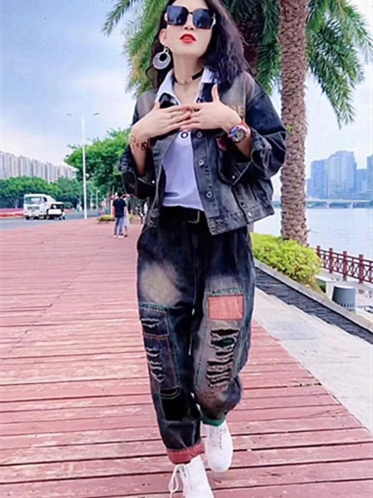 Chaqueta de mezclilla holgada de marca de moda de talla grande para mujer Primavera y Otoño 2024 Nuevo traje popular Moda retro casual Conjunto de dos piezas