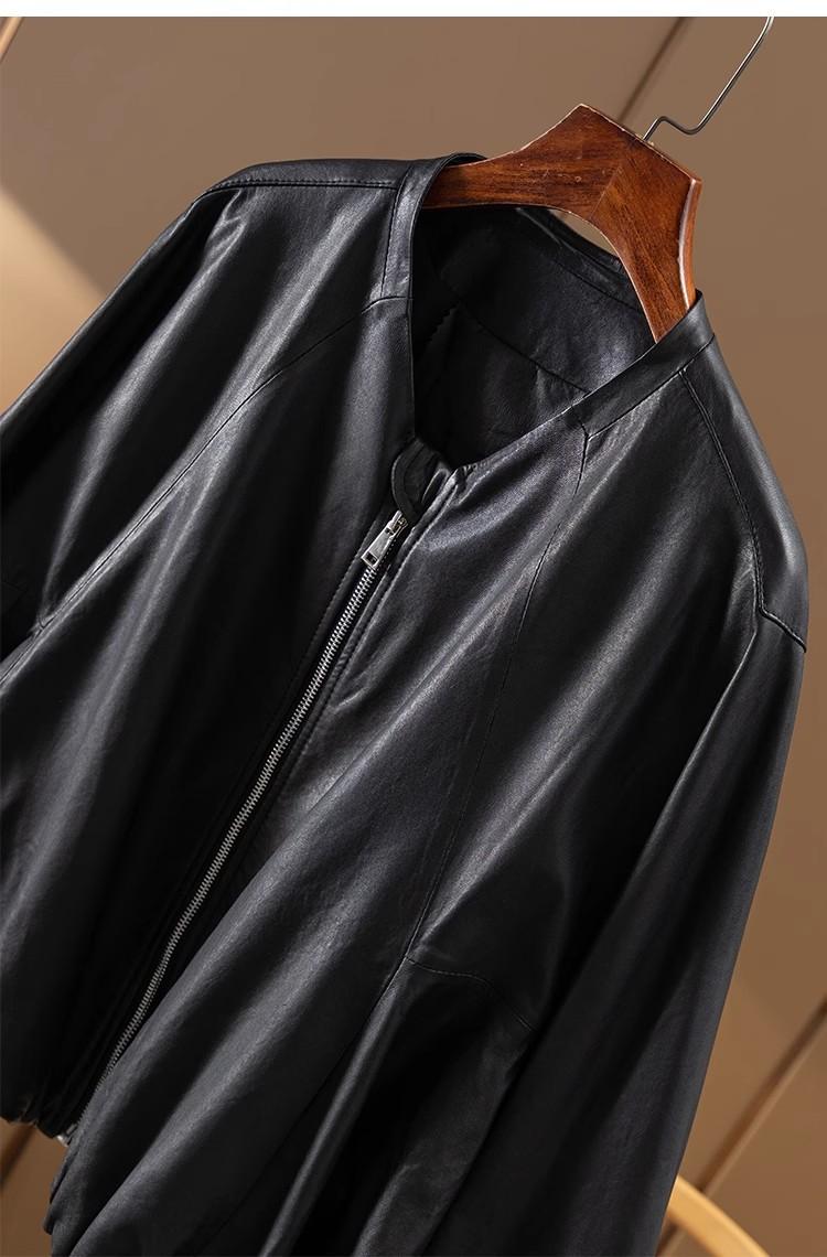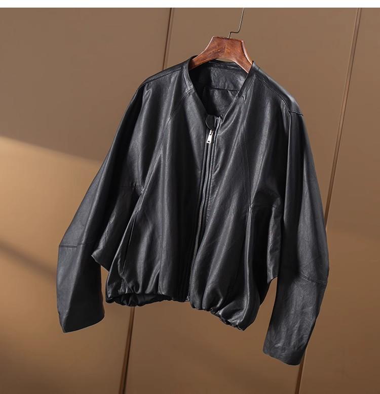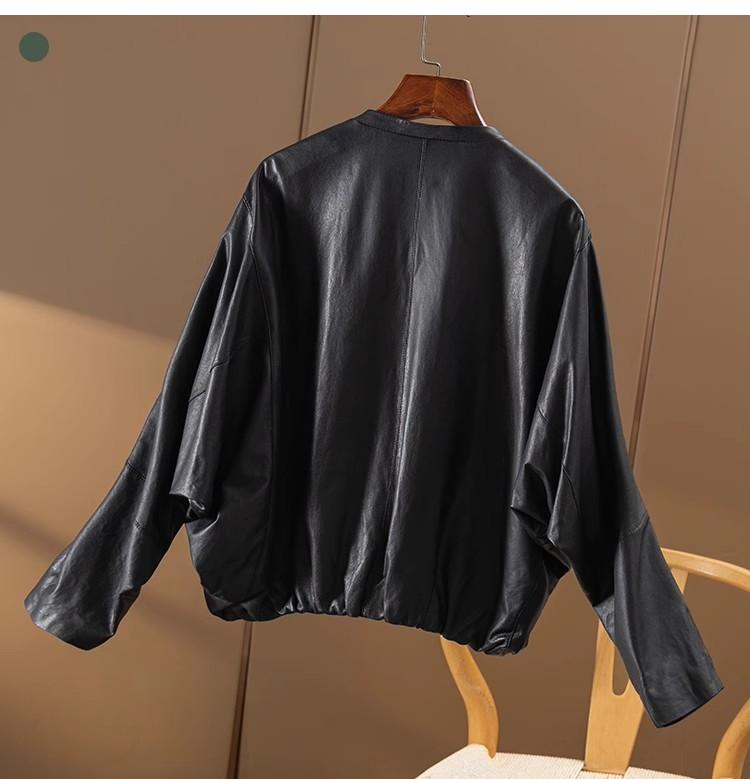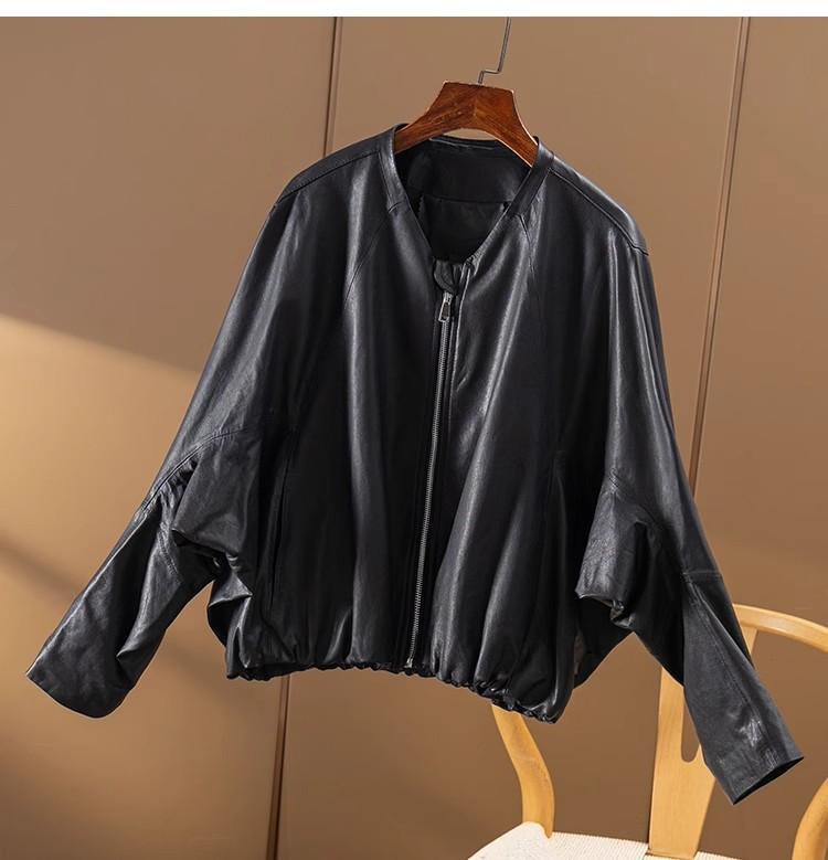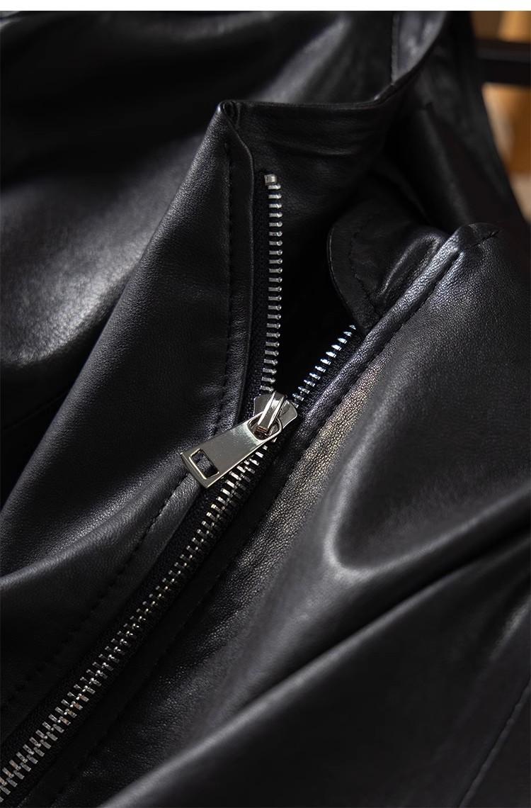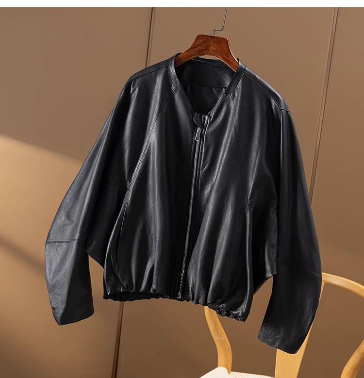 Otoño Nuevo Chaqueta Combinable Elegante Casual Cierre Cuello Redondo Piel de Oveja Cuero Genuino Chaqueta de Cuero para Mujer