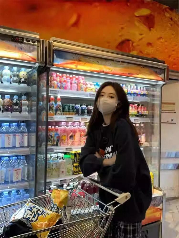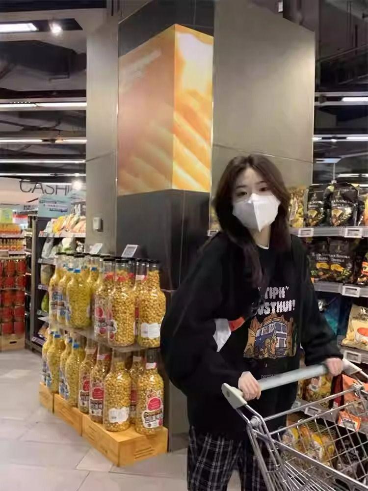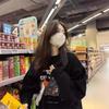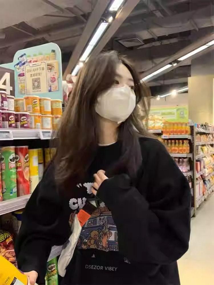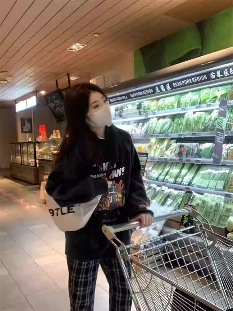 Playera negra oversize de cuello redondo estilo chic de Hong Kong para mujer, delgada para otoño e invierno, estilo holgado y casual, top adelgazante