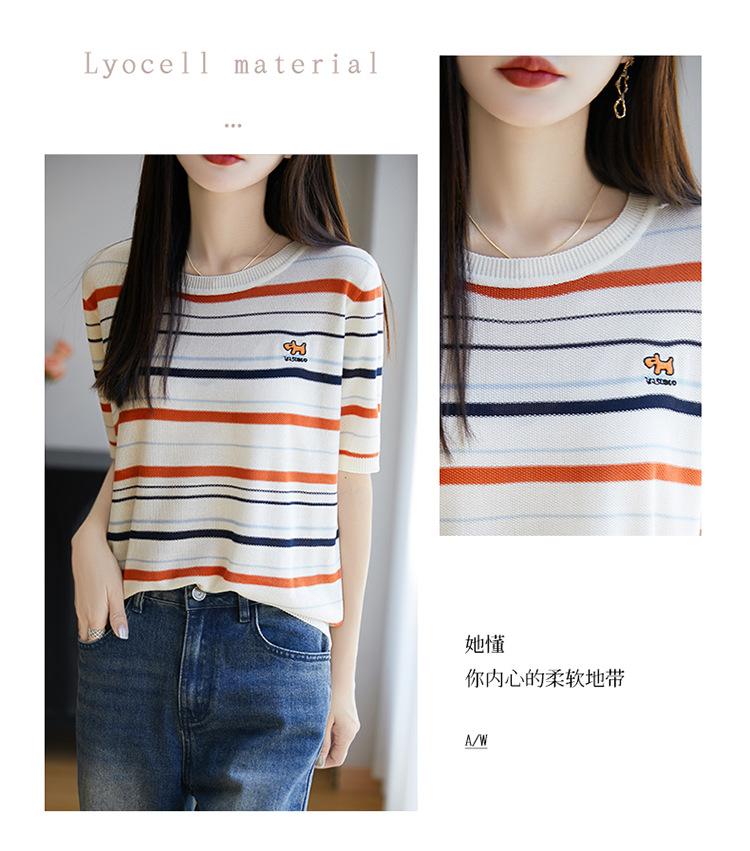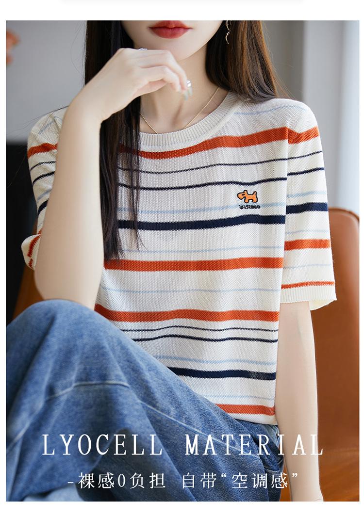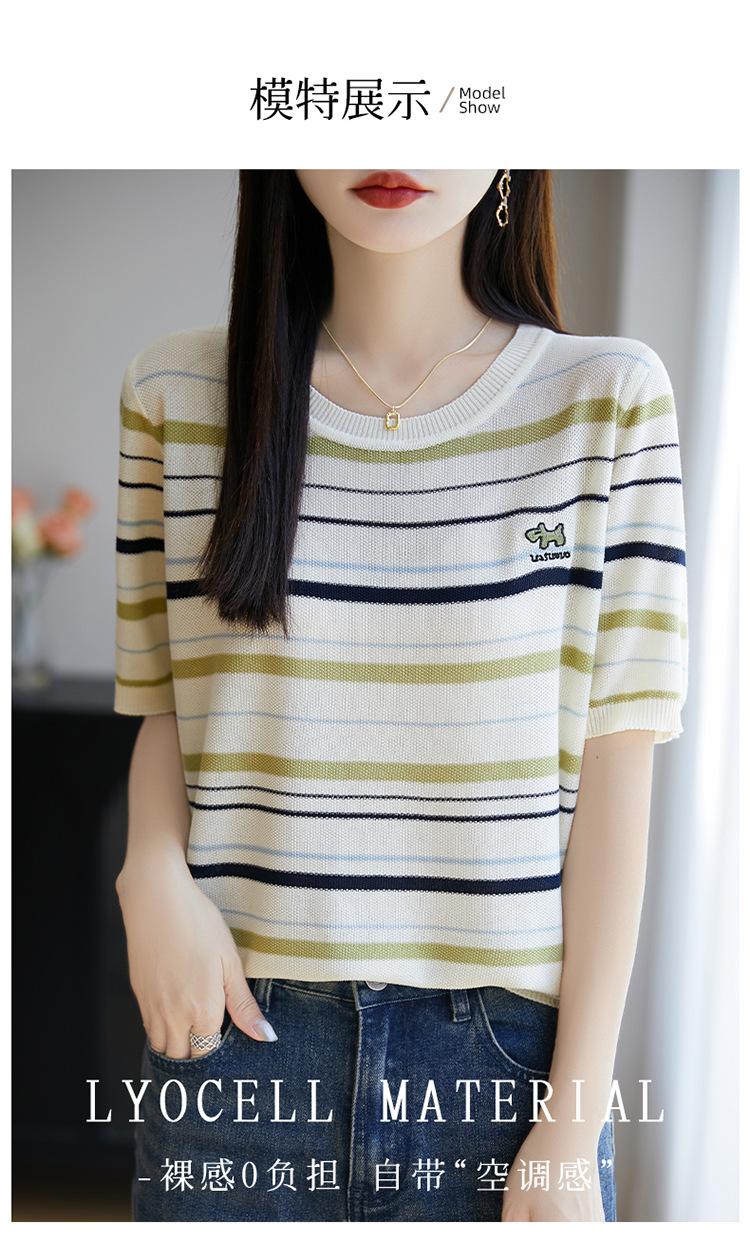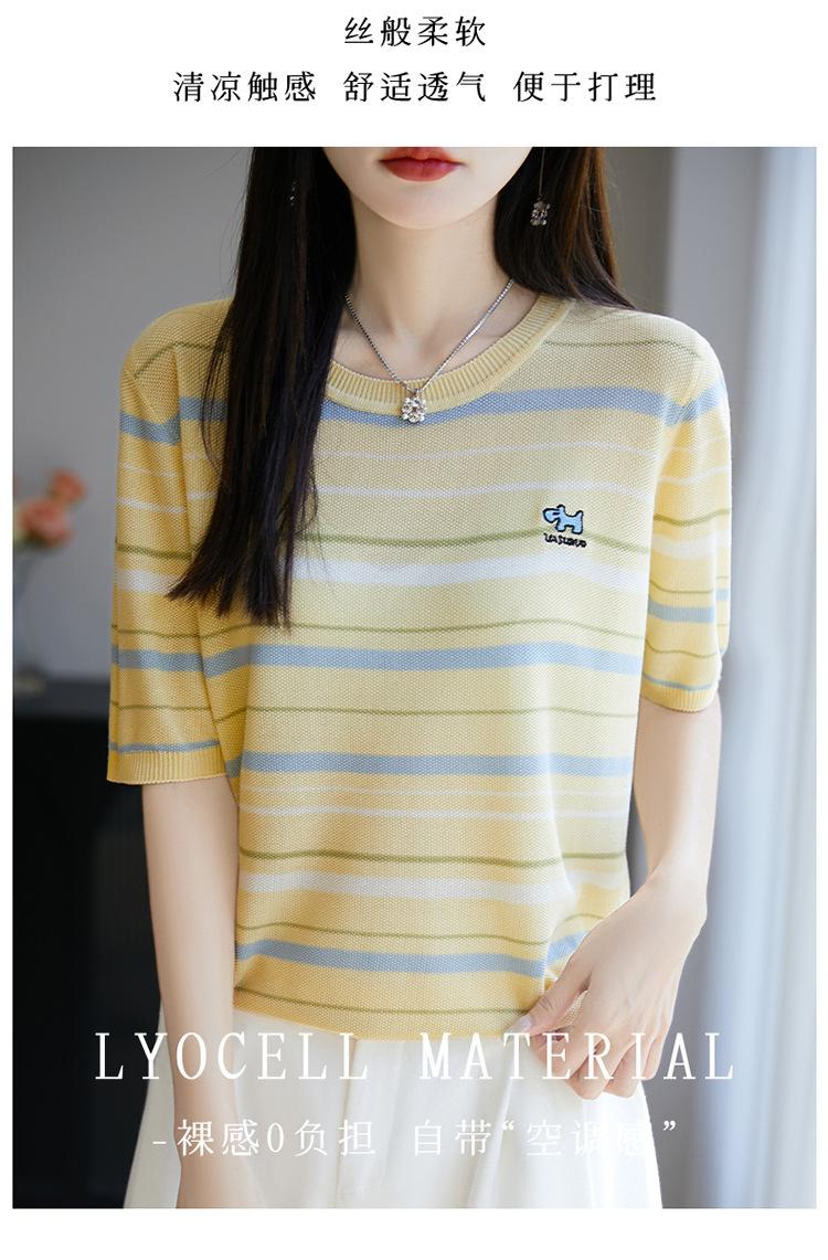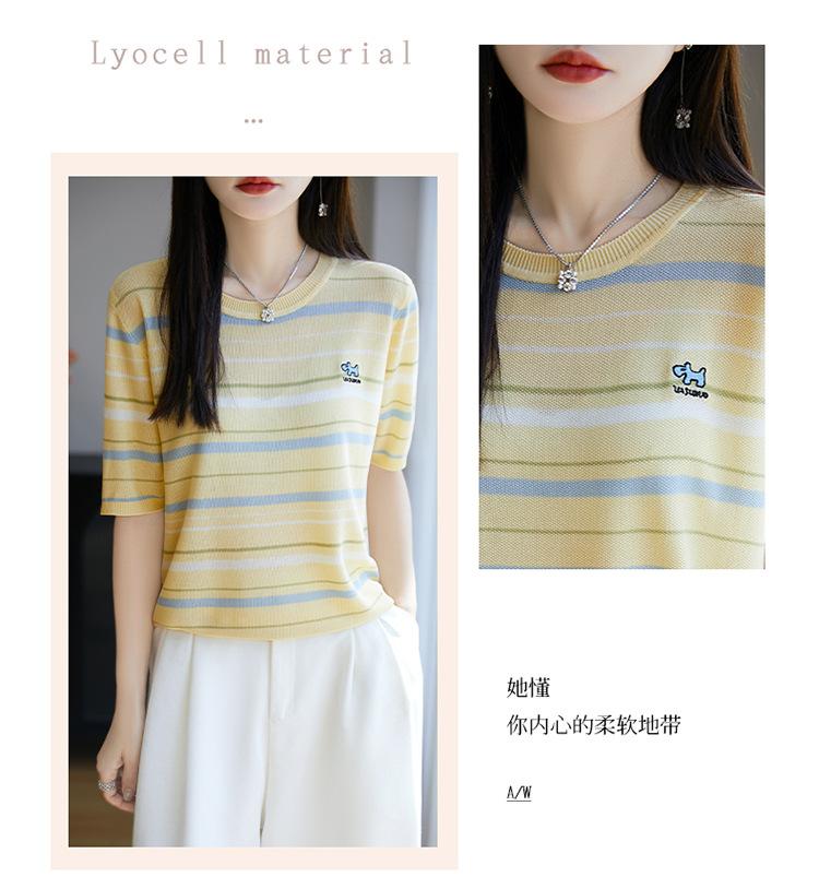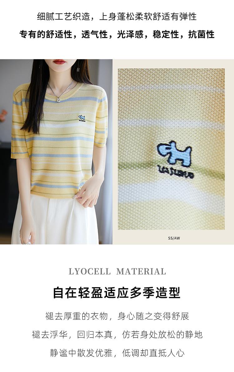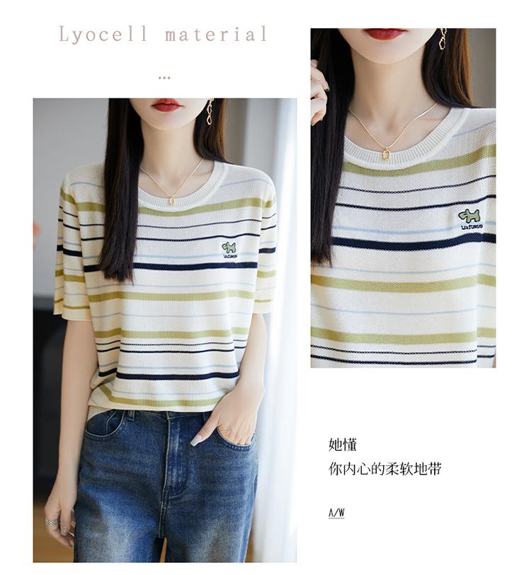 2025 Nuevo Verano Tencel Lyocell Cuello Redondo Tejido de Punto Manga Tres Cuartos para Mujer Rayado Bordado Cachorro Camiseta Básica