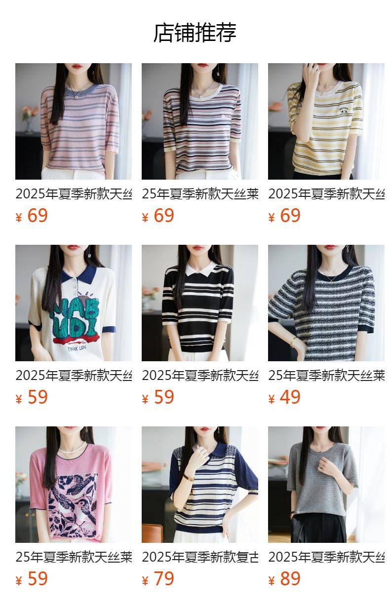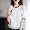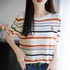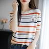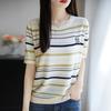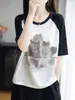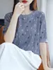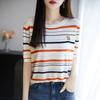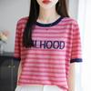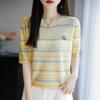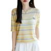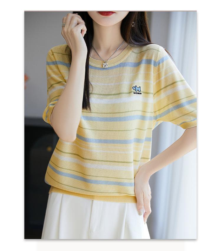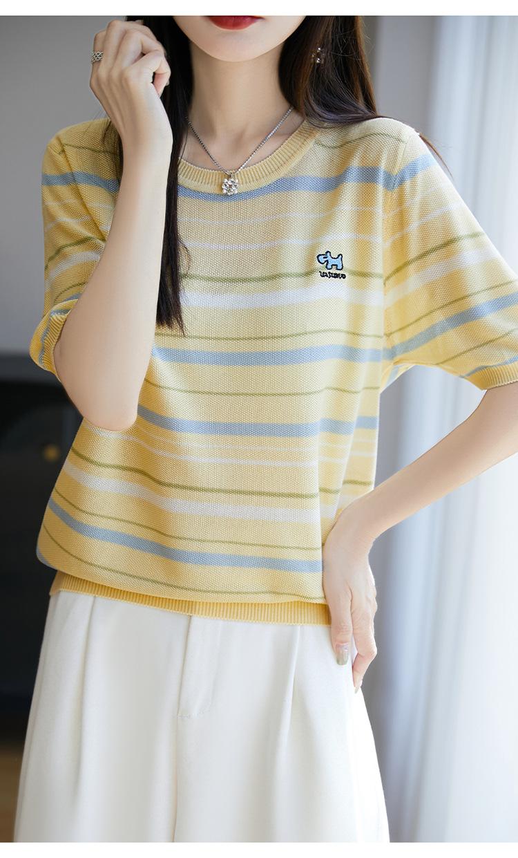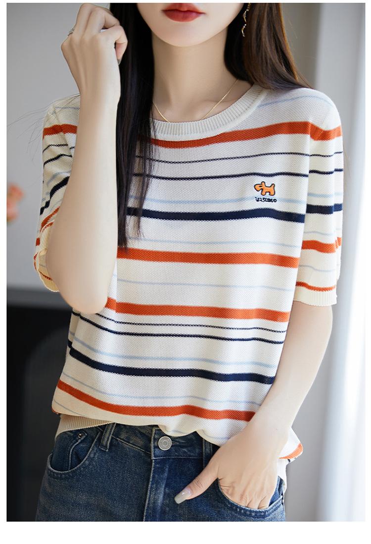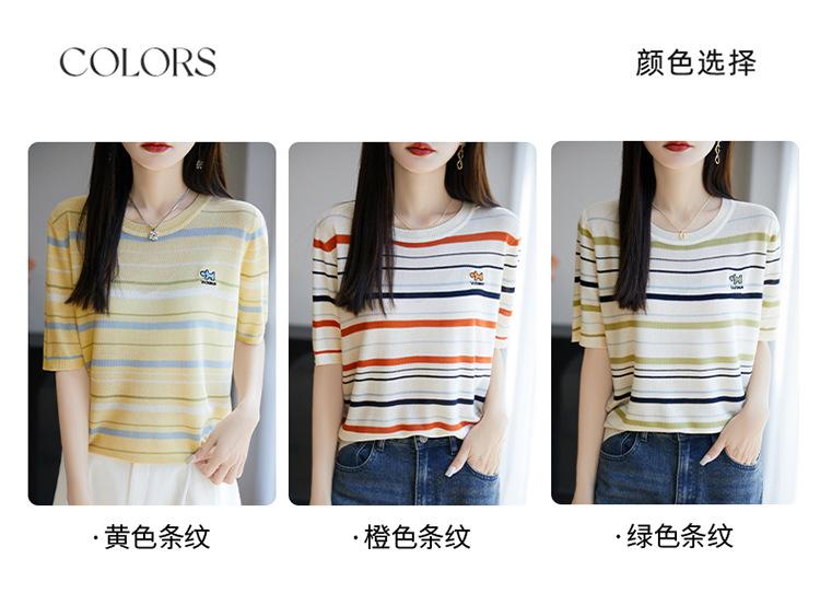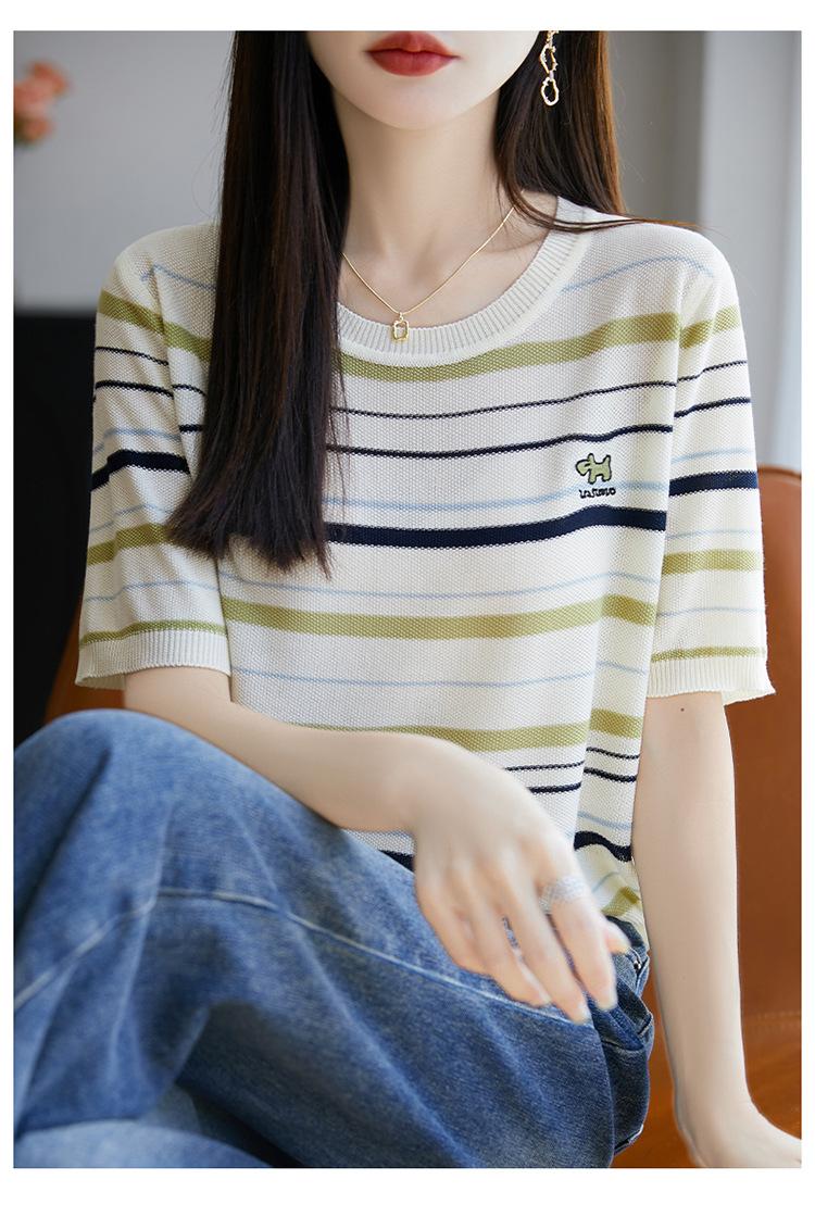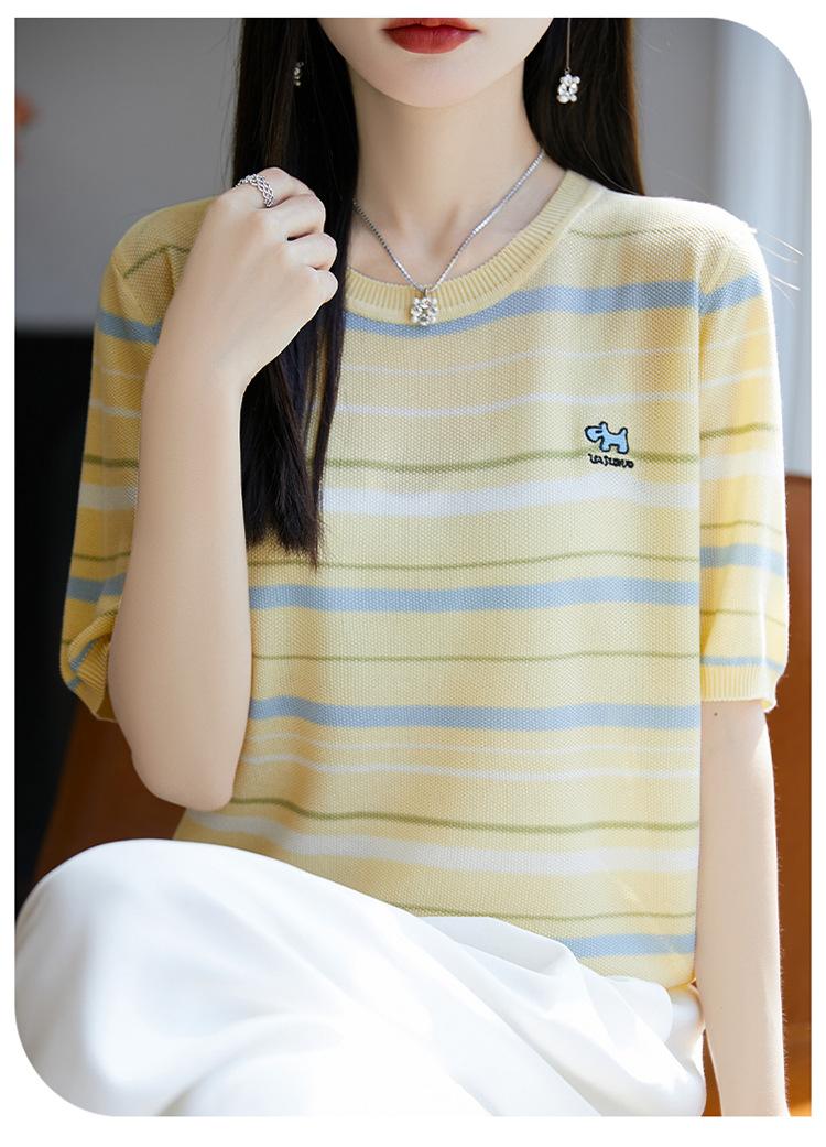 2025 Nuevo Verano Tencel Lyocell Cuello Redondo Tejido de Punto Manga Tres Cuartos para Mujer Rayado Bordado Cachorro Camiseta Básica