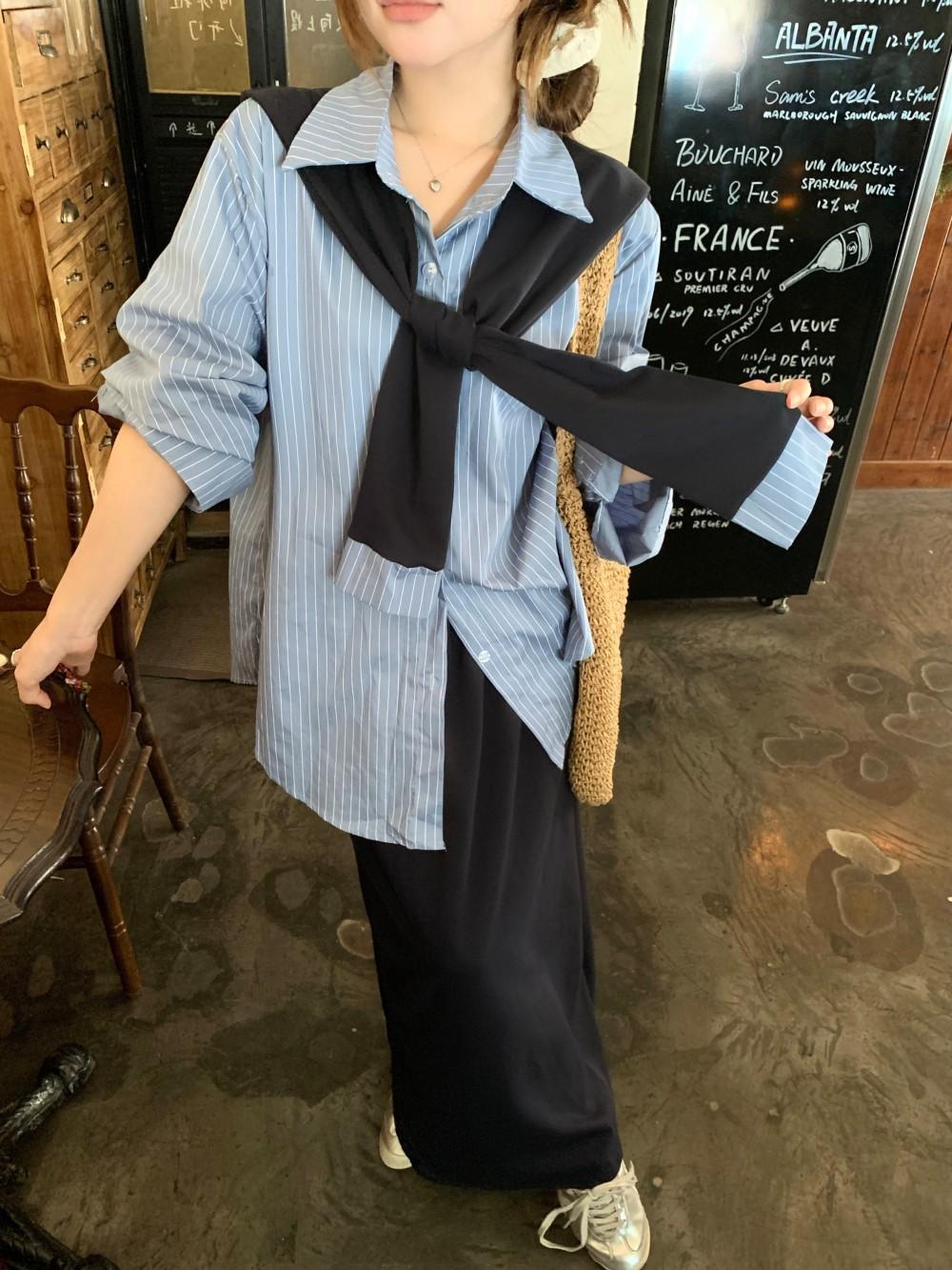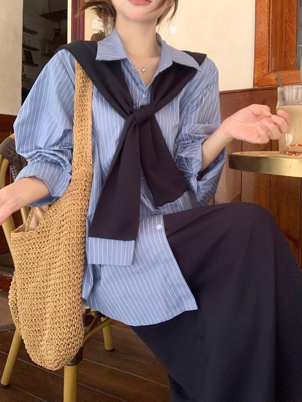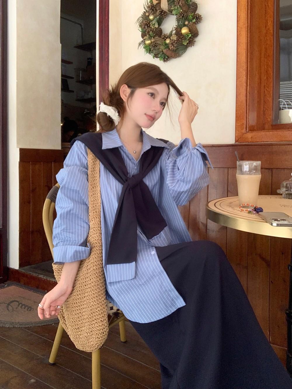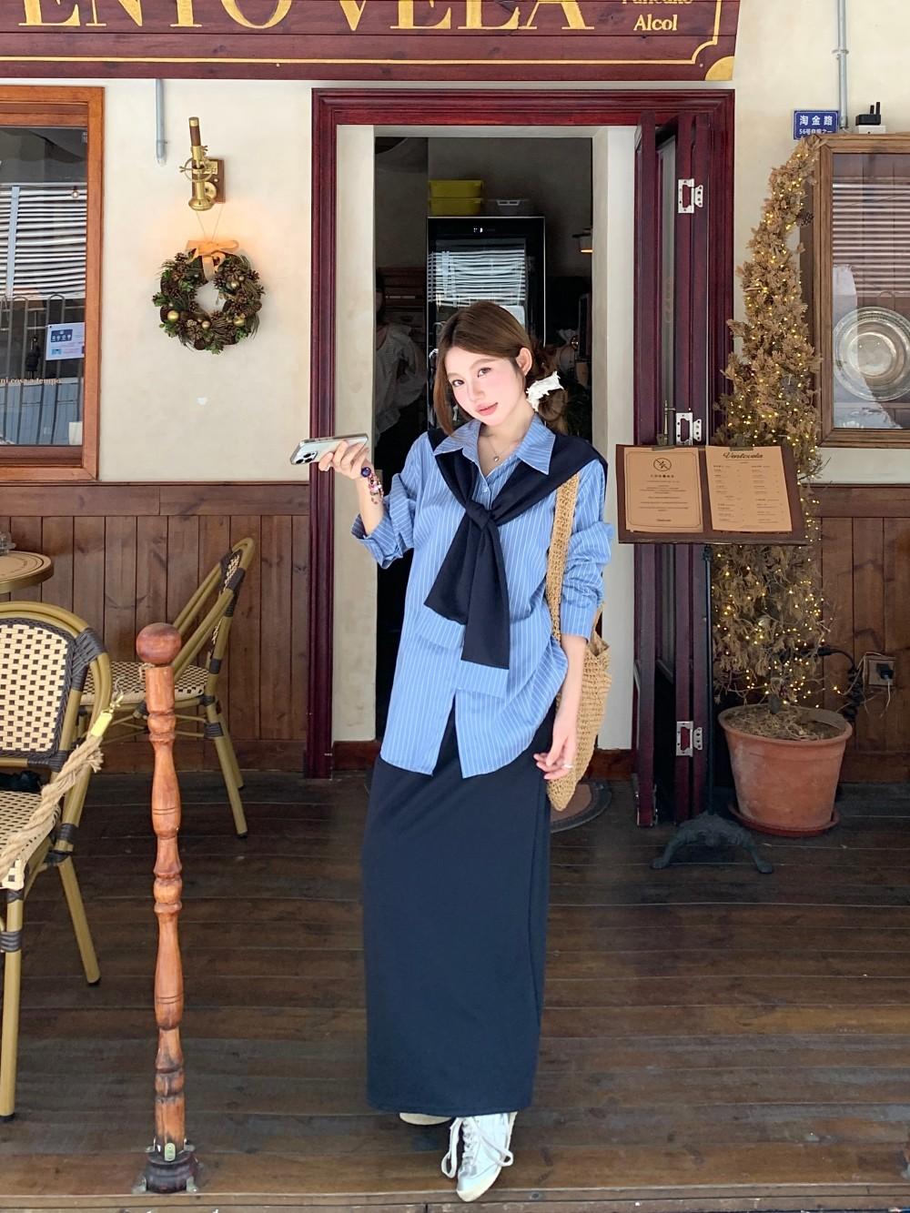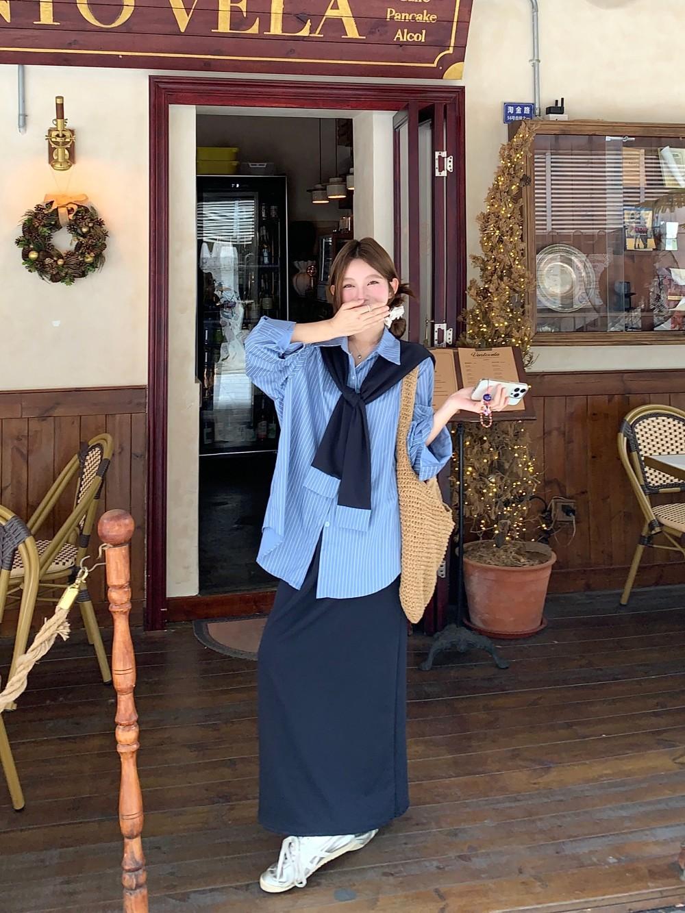 Foto Real Chaqueta Camisera Rayada Azul Diseño para Mujer Nicho Top Chal Elástico Cintura Alta Media Falda Conjunto Casual