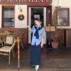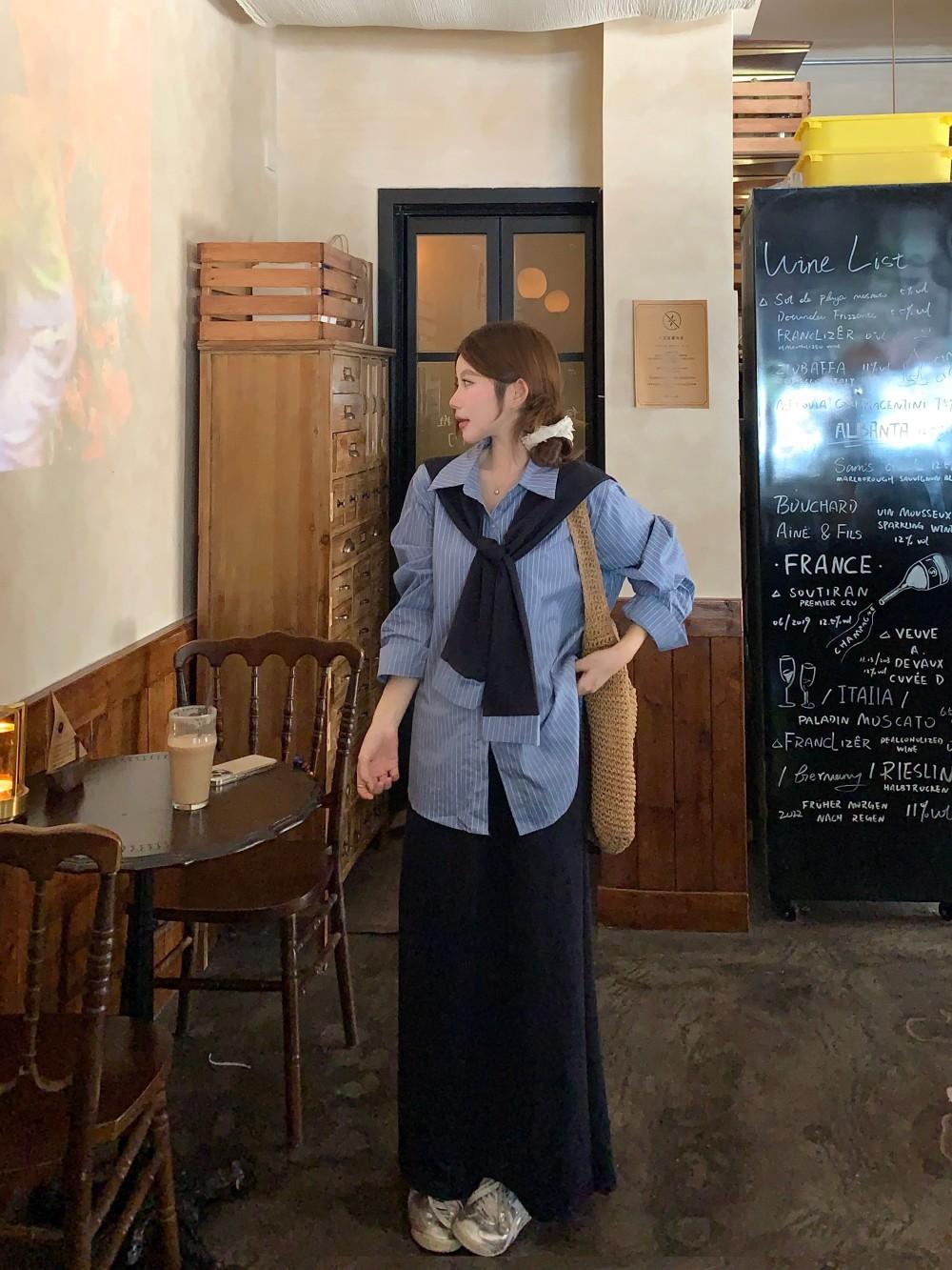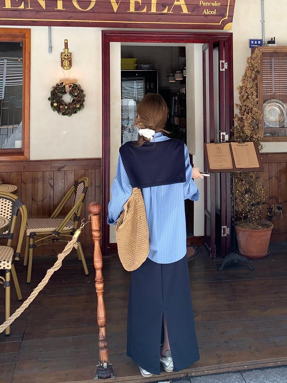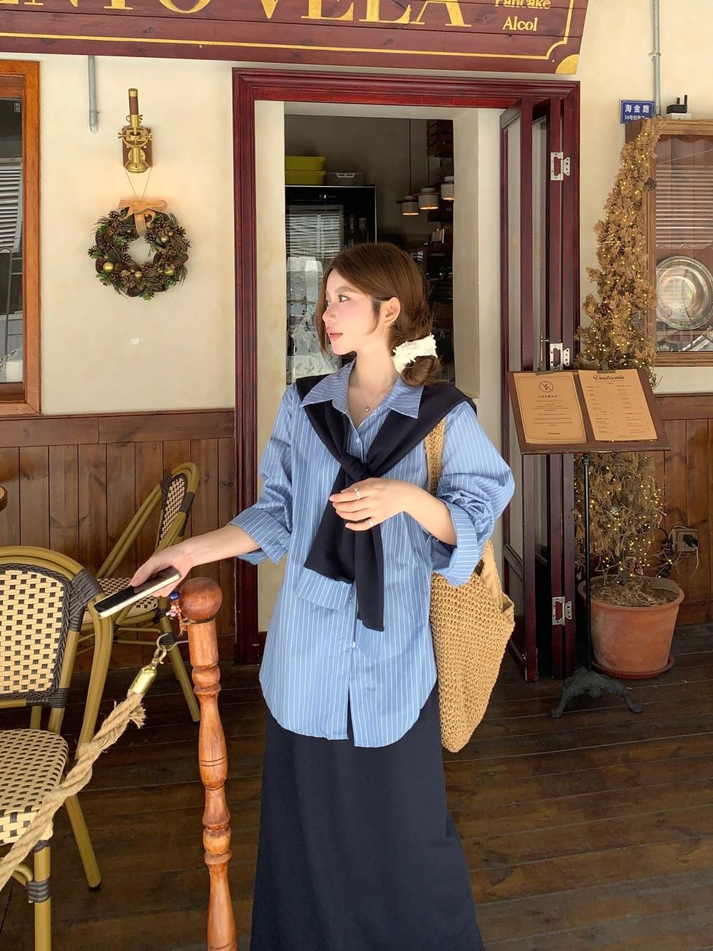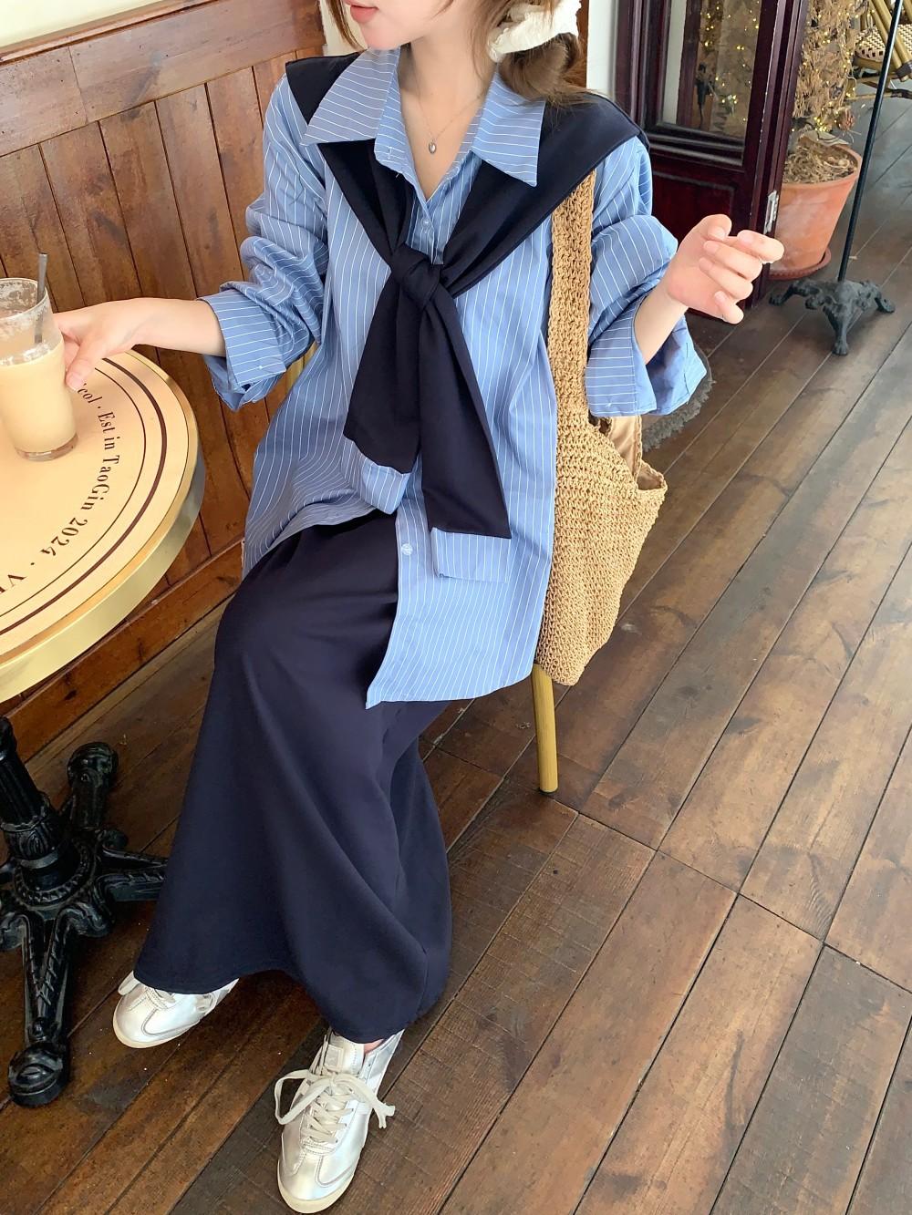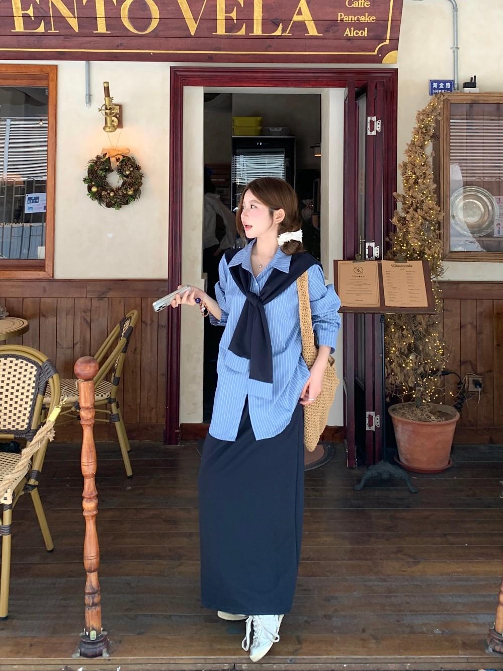 Foto Real Chaqueta Camisera Rayada Azul Diseño para Mujer Nicho Top Chal Elástico Cintura Alta Media Falda Conjunto Casual