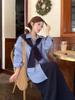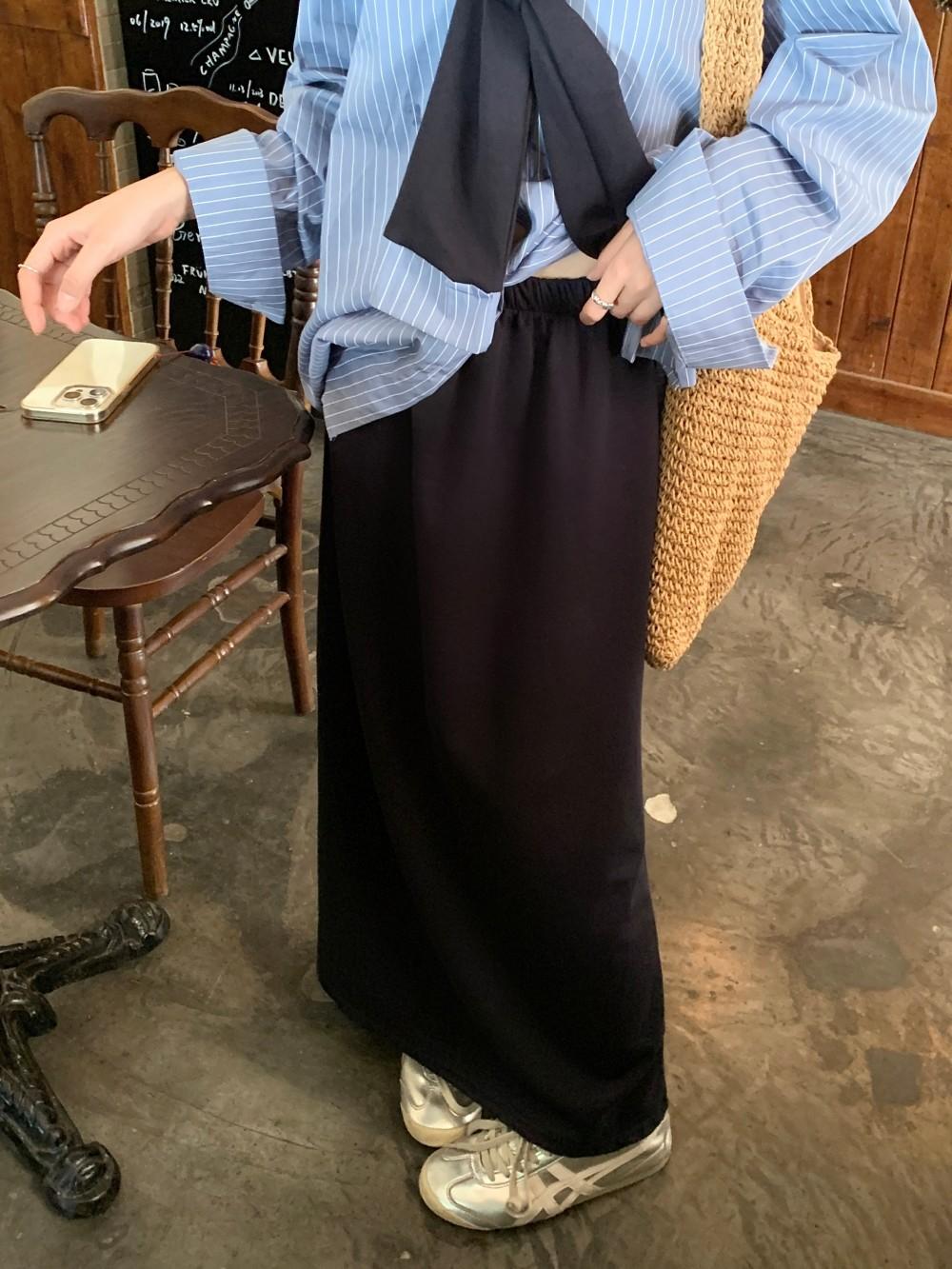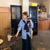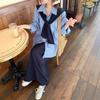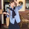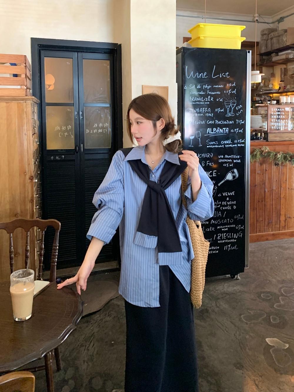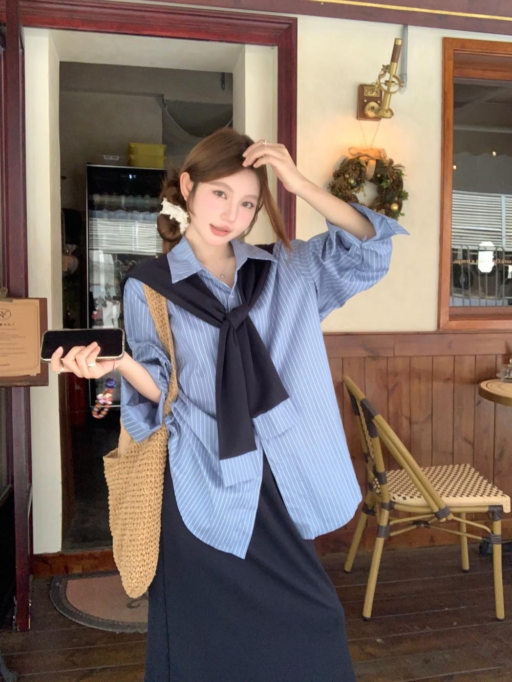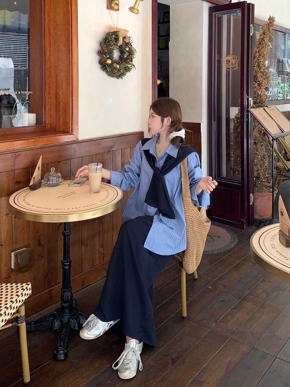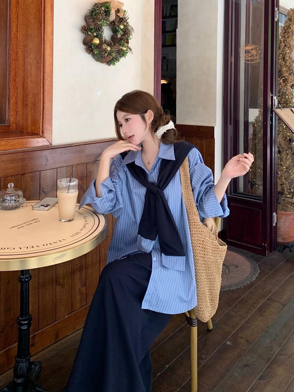 Foto Real Chaqueta Camisera Rayada Azul Diseño para Mujer Nicho Top Chal Elástico Cintura Alta Media Falda Conjunto Casual