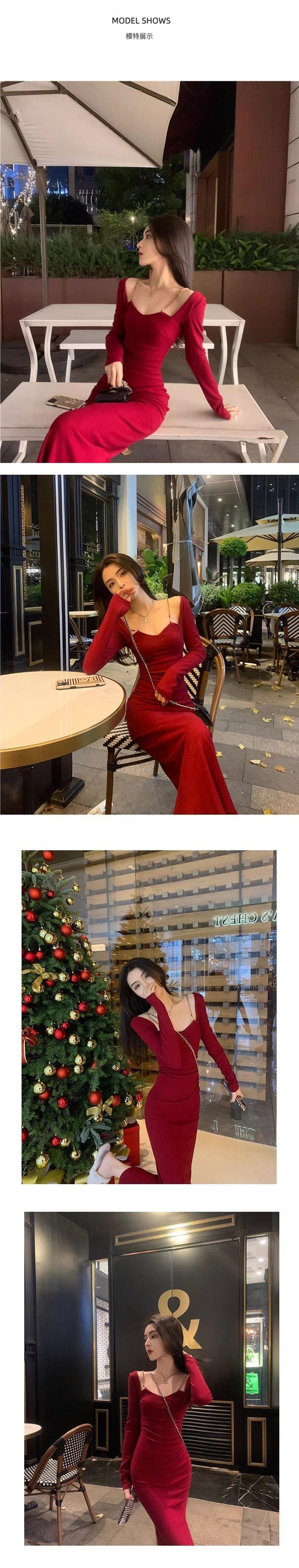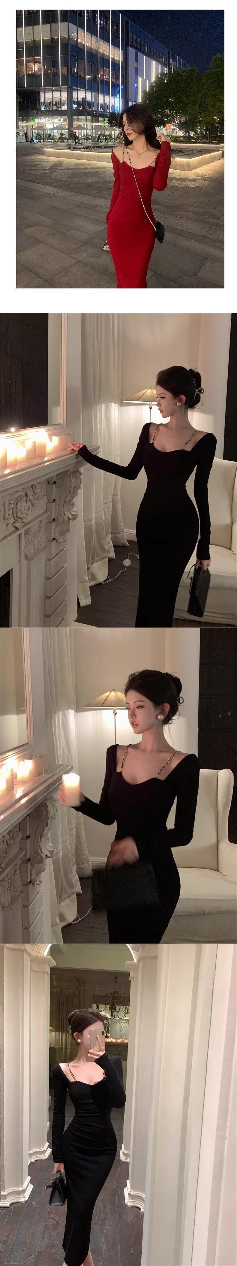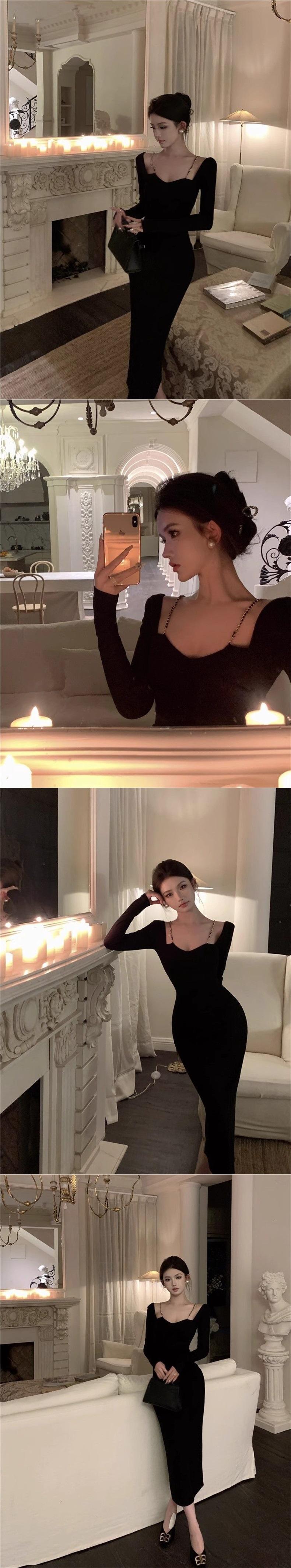 Vestido largo de manga larga interior de cadena puro y sexy para mujer otoño ceñido a la cintura ajustado falda que abraza las caderas base negra línea A vestido largo