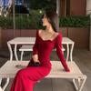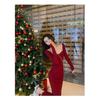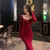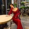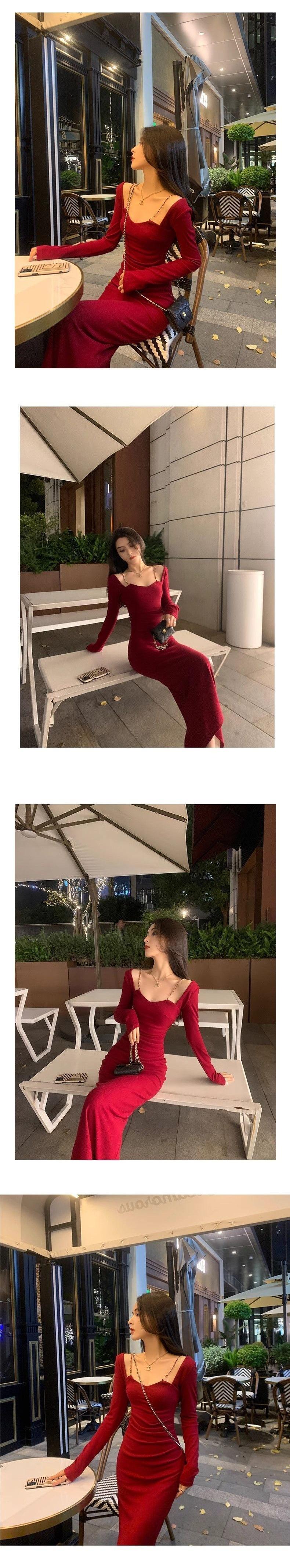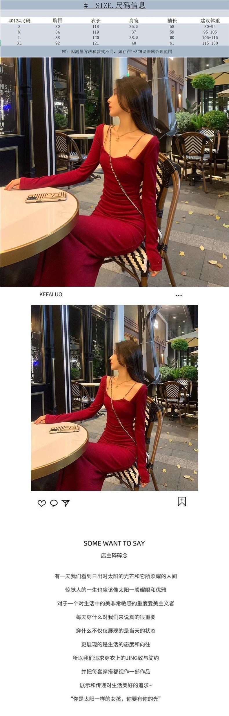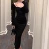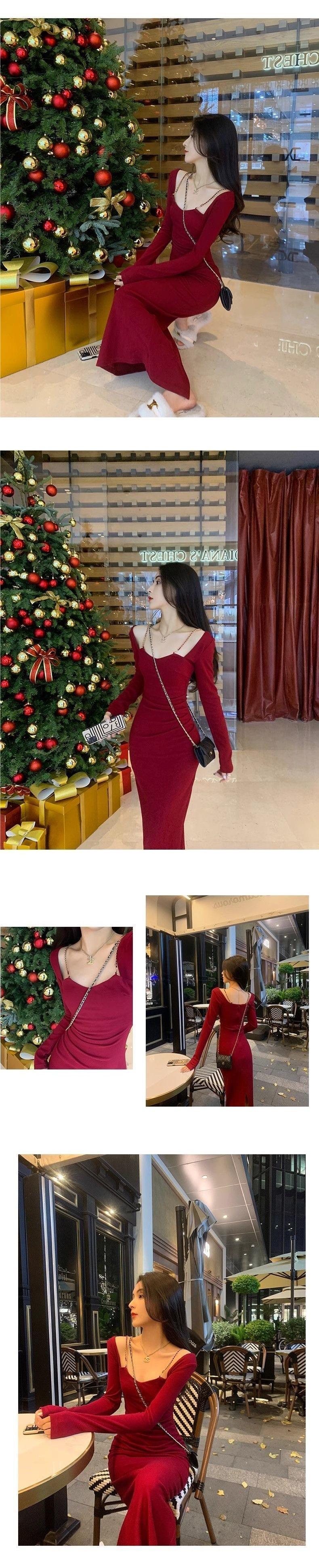 Vestido largo de manga larga interior de cadena puro y sexy para mujer otoño ceñido a la cintura ajustado falda que abraza las caderas base negra línea A vestido largo