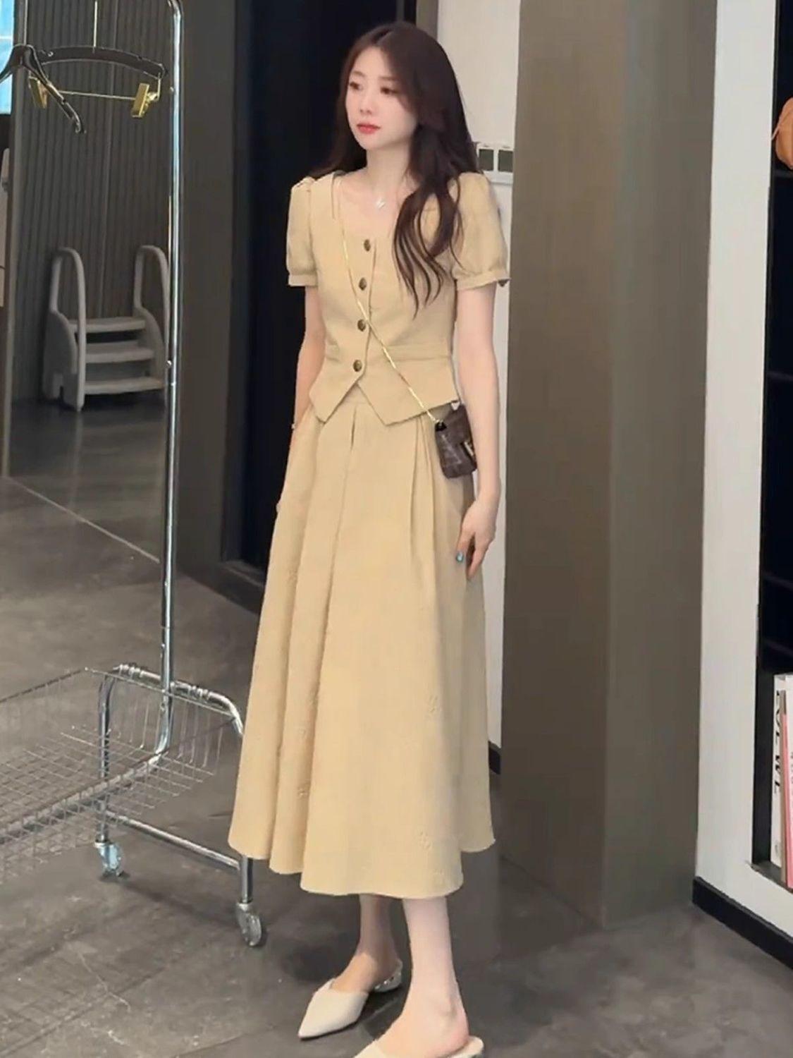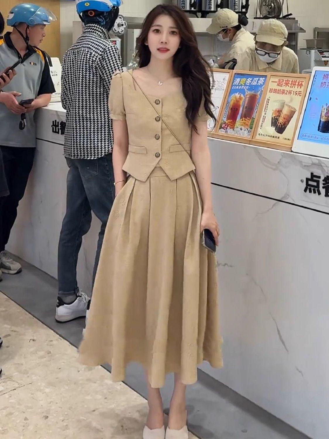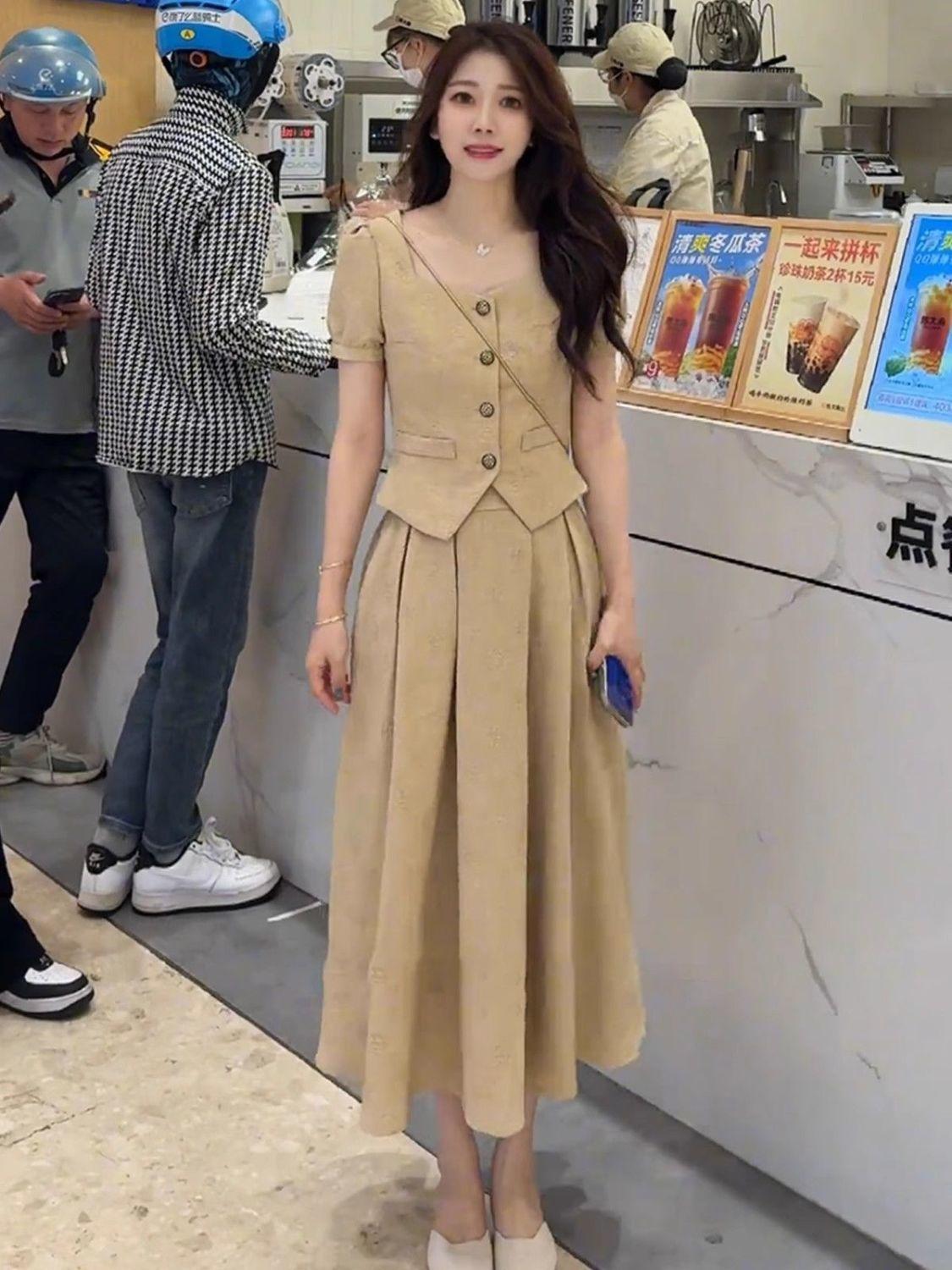 Conjunto de dos piezas estilo Chanel pequeño falda mujer verano 2025 ceñido a la cintura estilo coreano top corto de alta gama falda midi de talle alto
