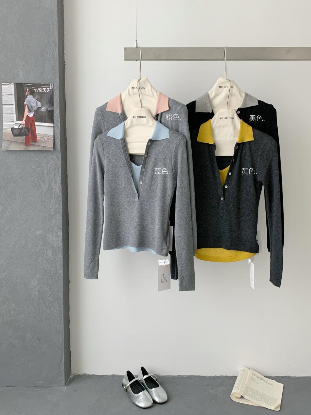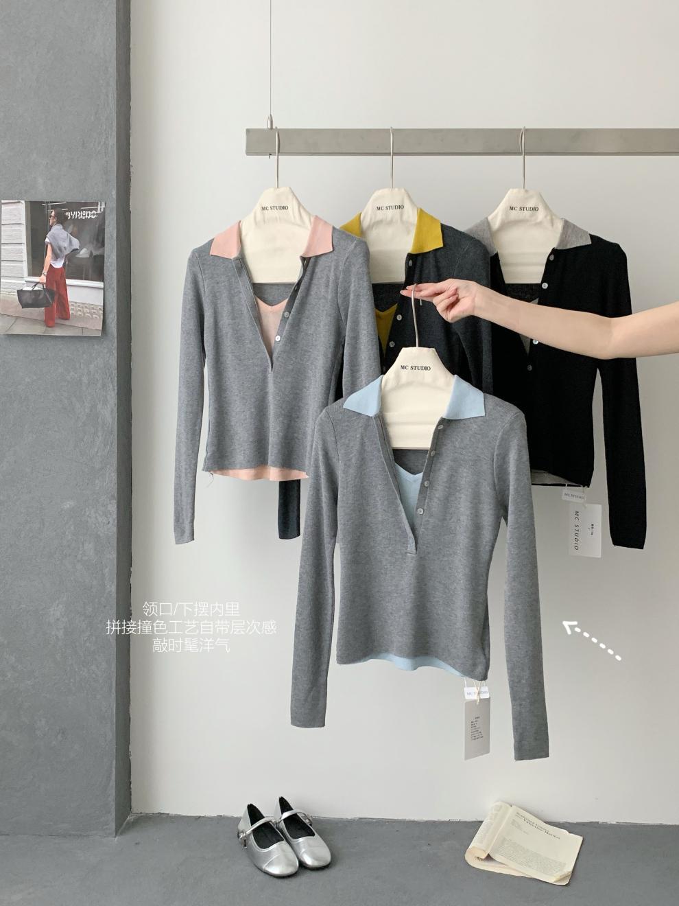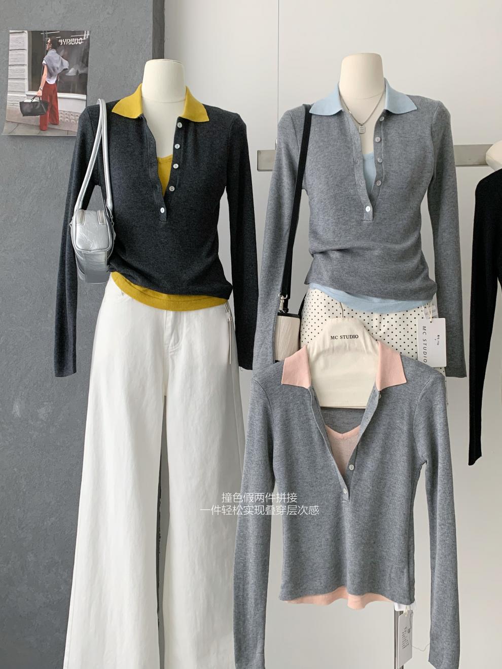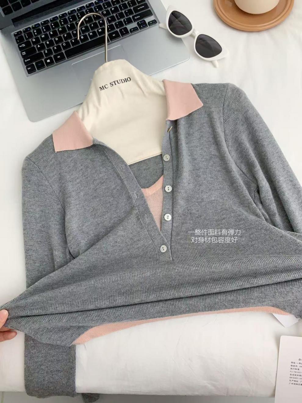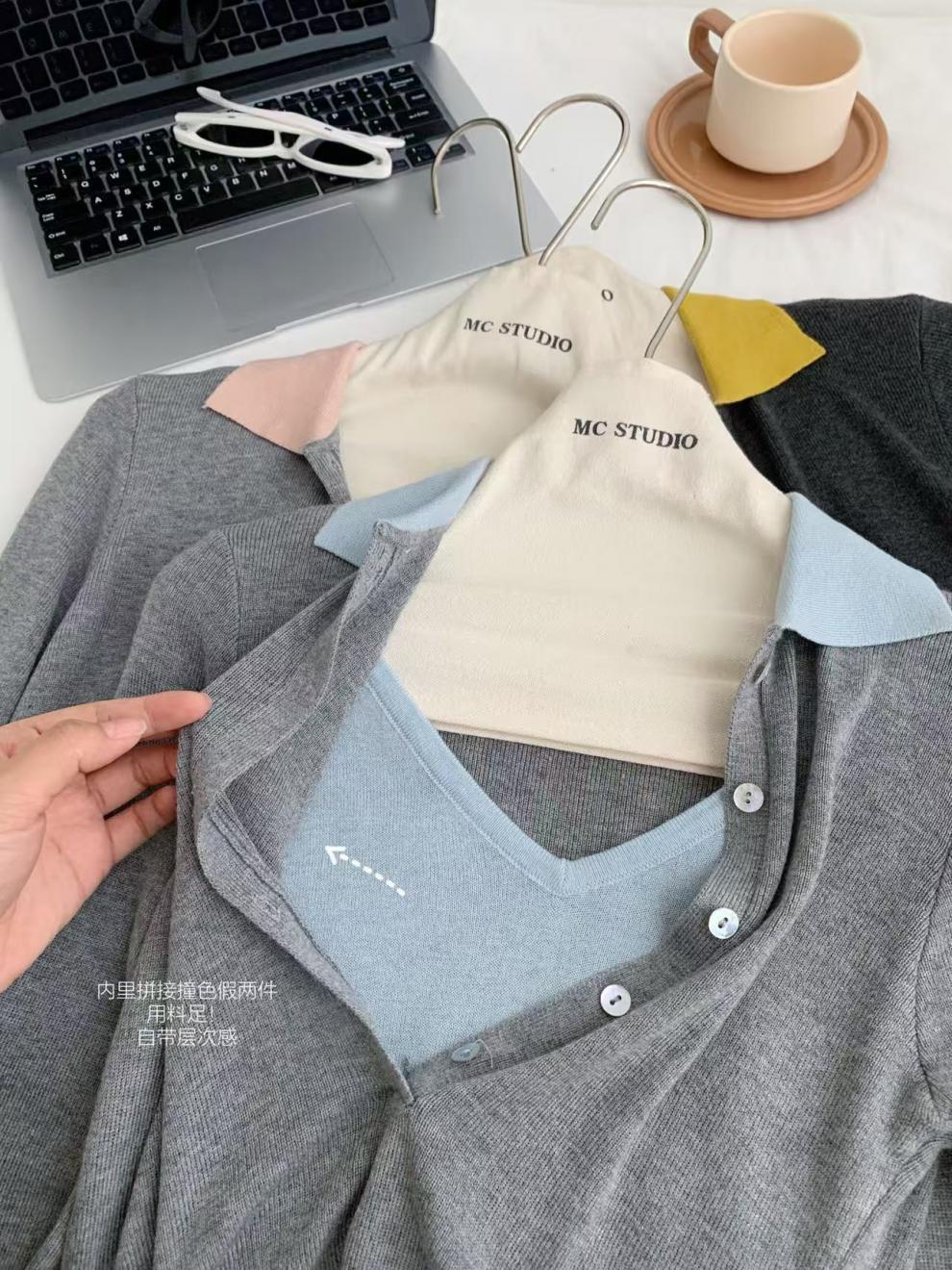 Diseño sentido color block falso dos piezas solapa ajuste ceñido casual punto para mujer otoño estilo coreano top de manga larga de alta gama