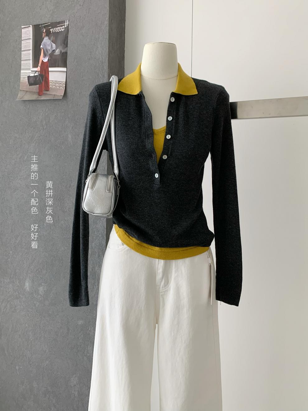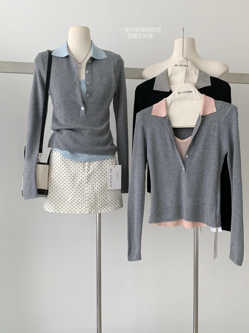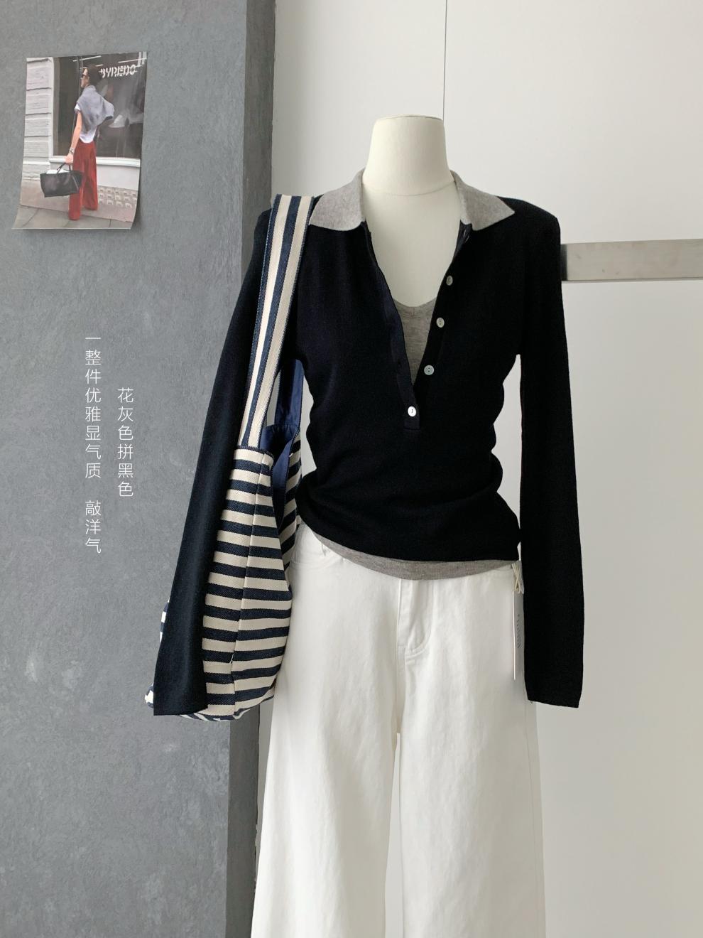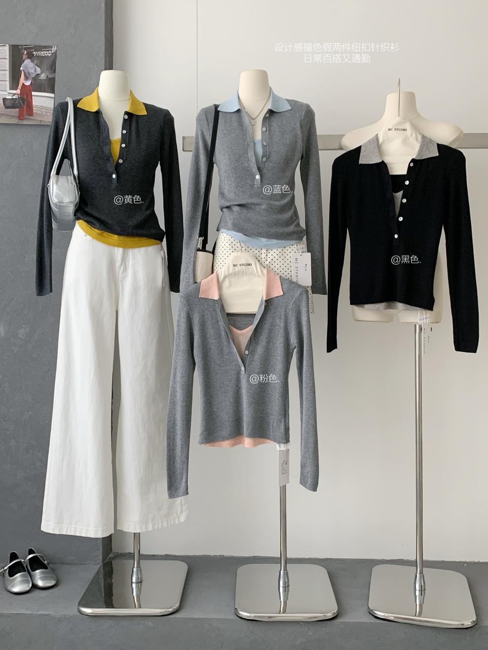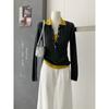 Diseño sentido color block falso dos piezas solapa ajuste ceñido casual punto para mujer otoño estilo coreano top de manga larga de alta gama