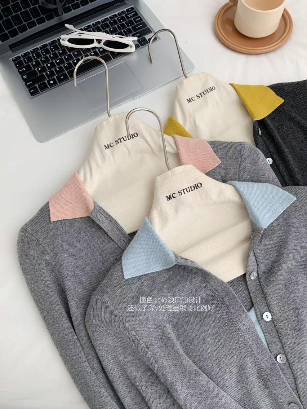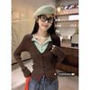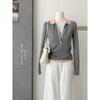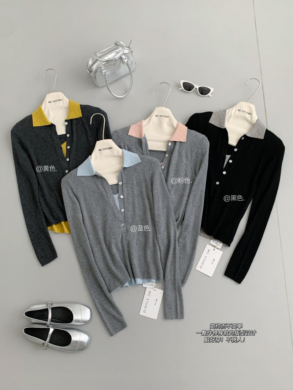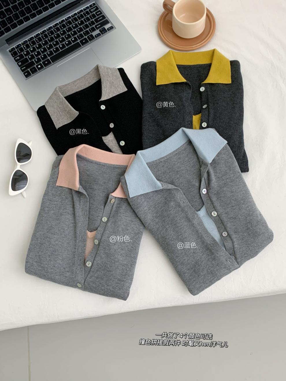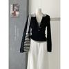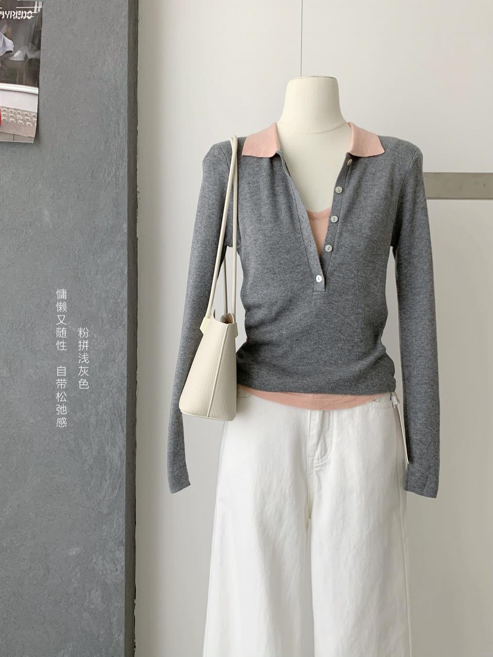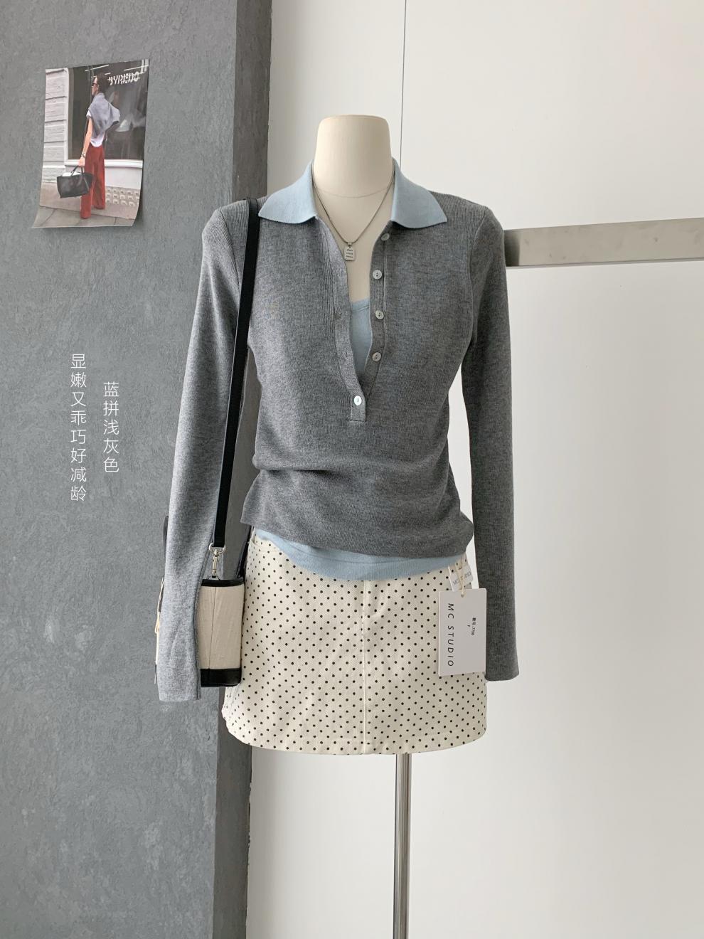 Diseño sentido color block falso dos piezas solapa ajuste ceñido casual punto para mujer otoño estilo coreano top de manga larga de alta gama