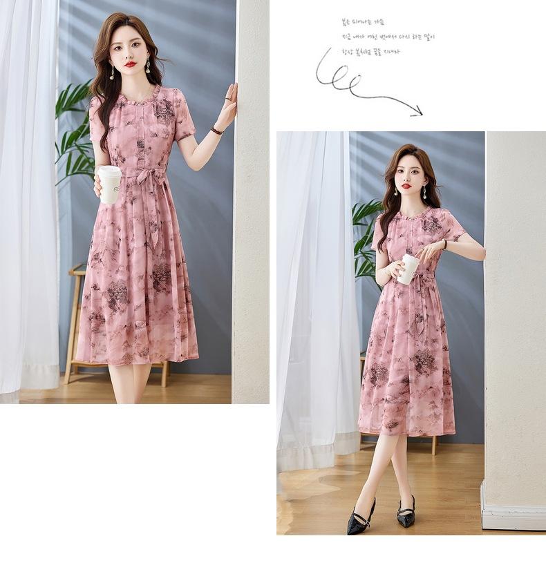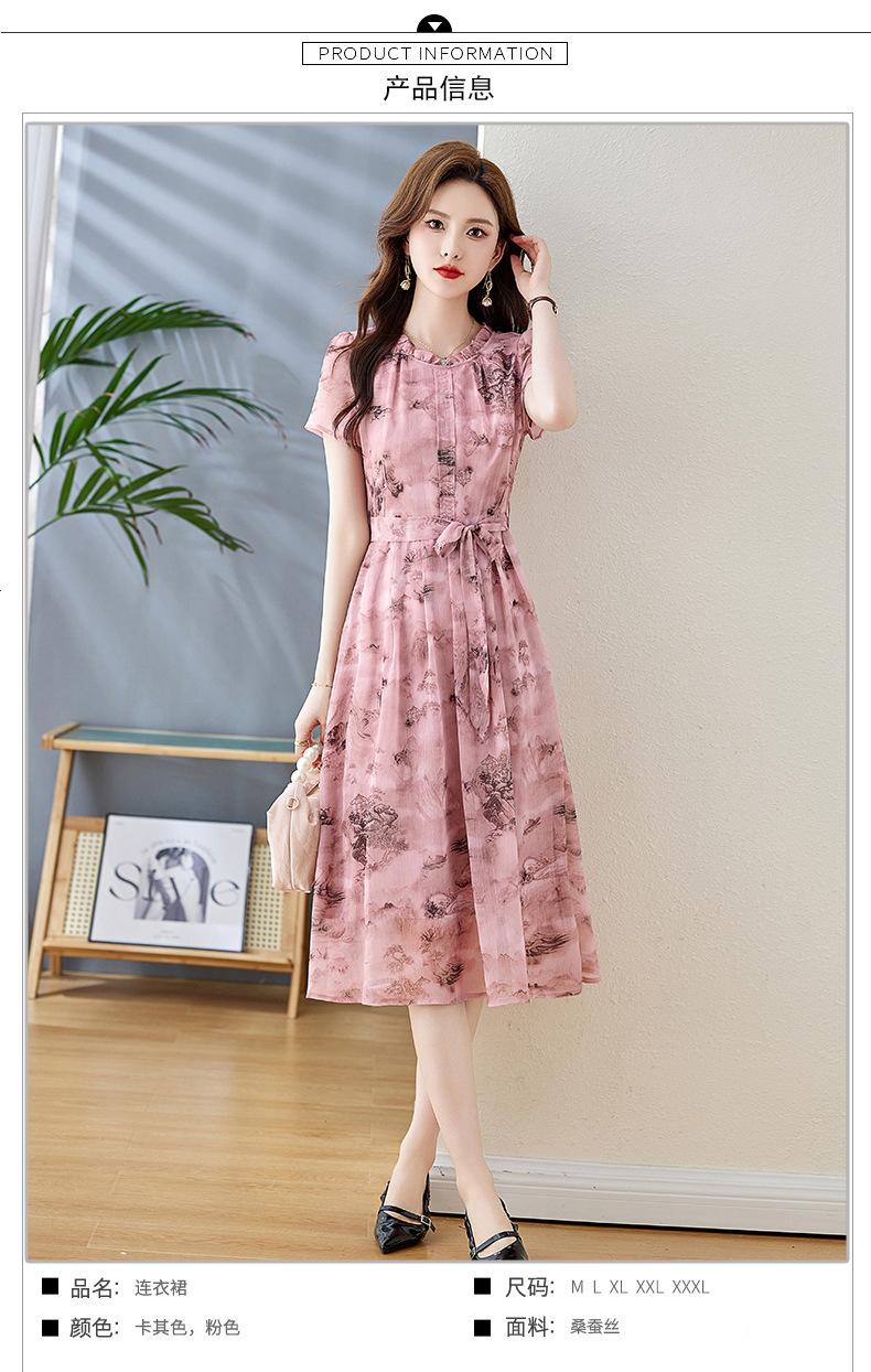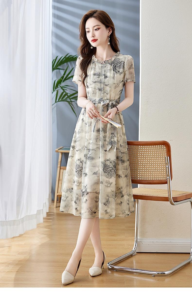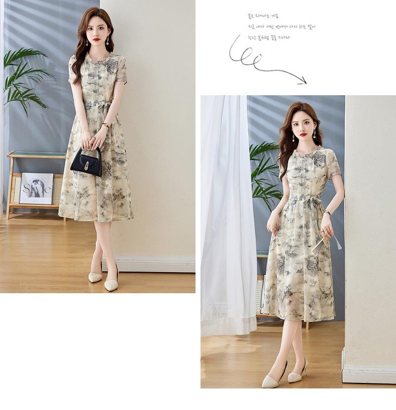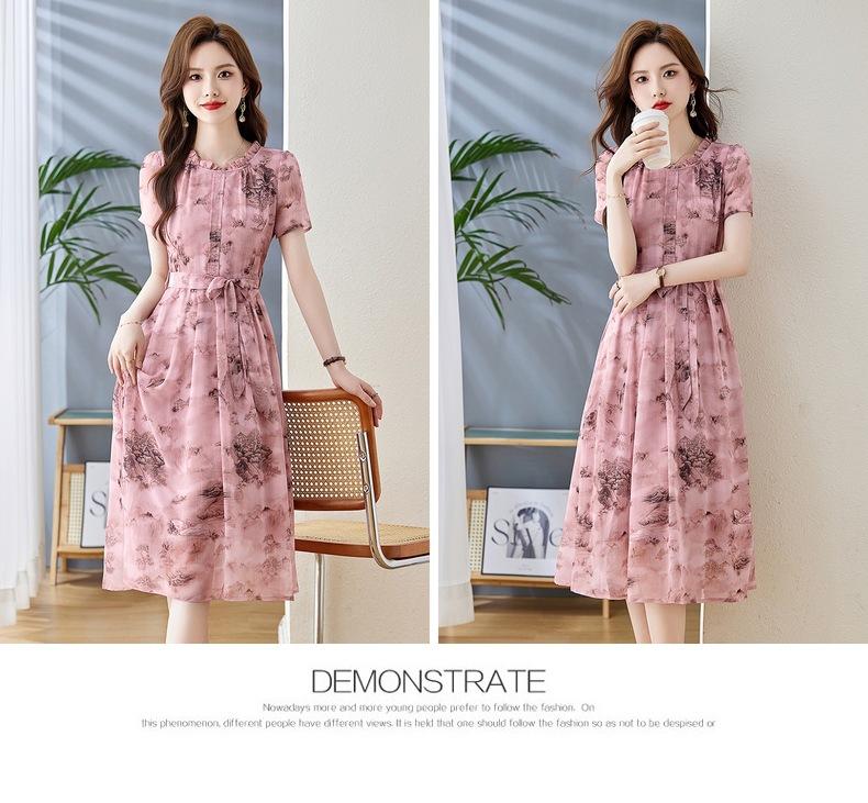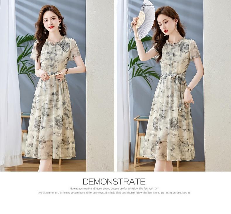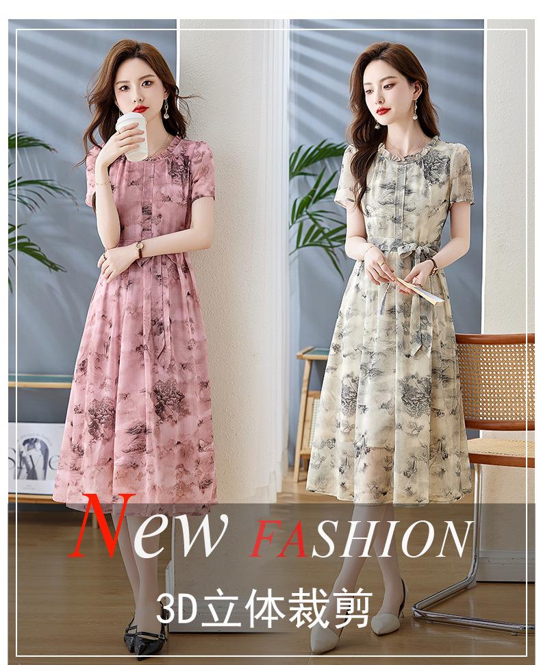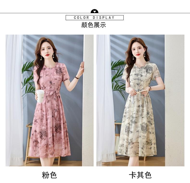 Vestido Floral de Seda de Morera, Falda de Encaje Moderna y Elegante con Cuello Redondo, Ropa de Trabajo Diaria Elegante, Falda Larga Generosa con Cordones