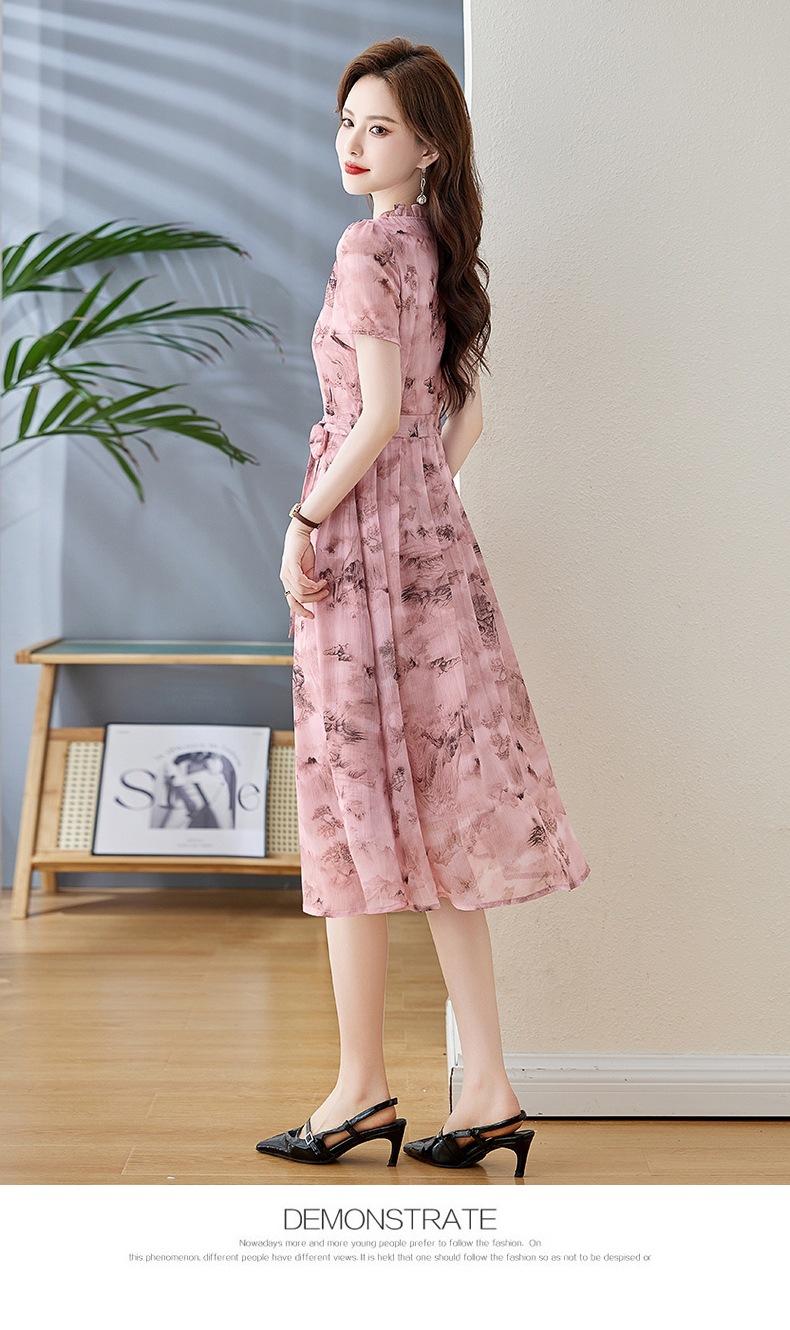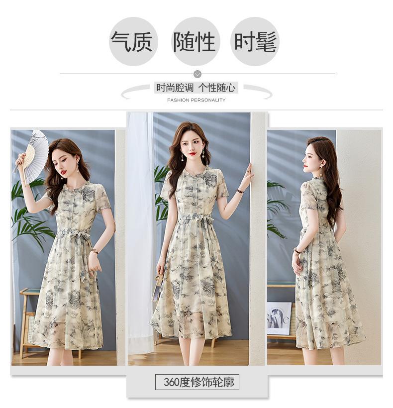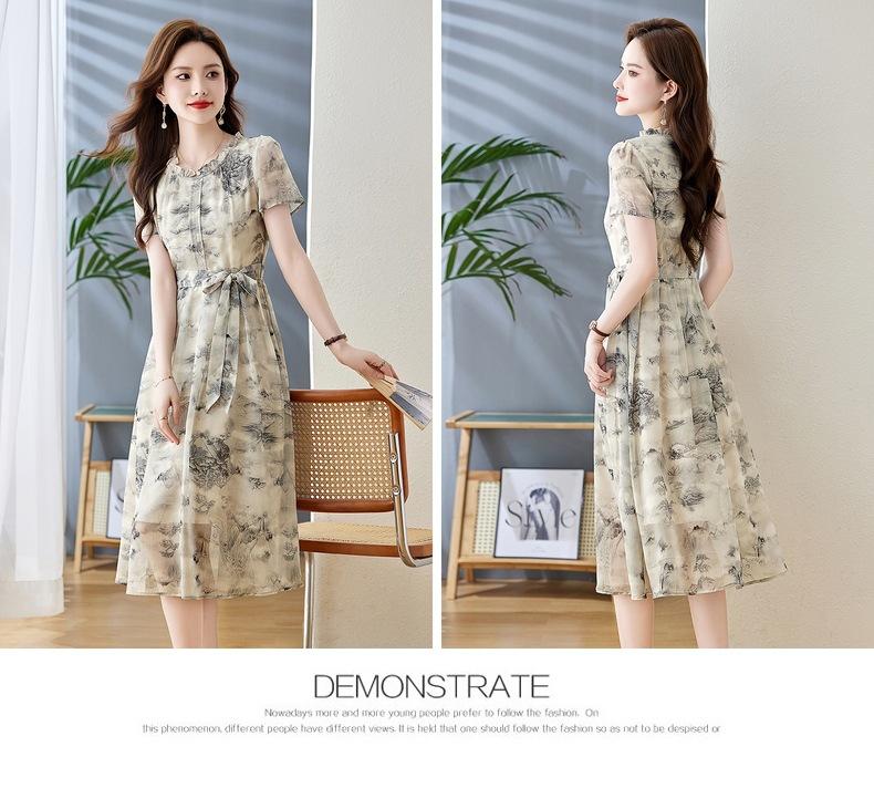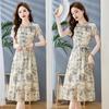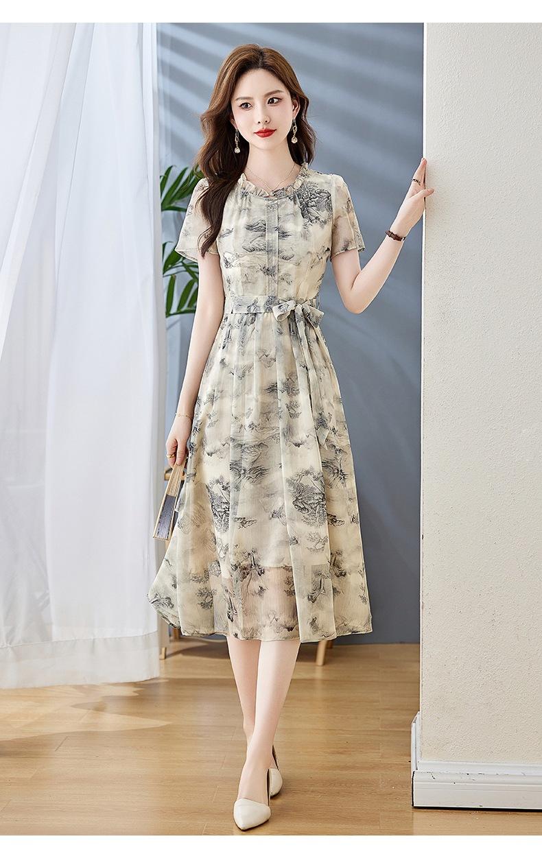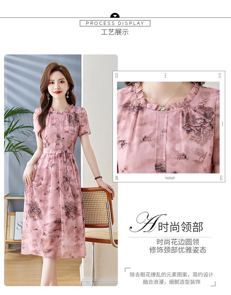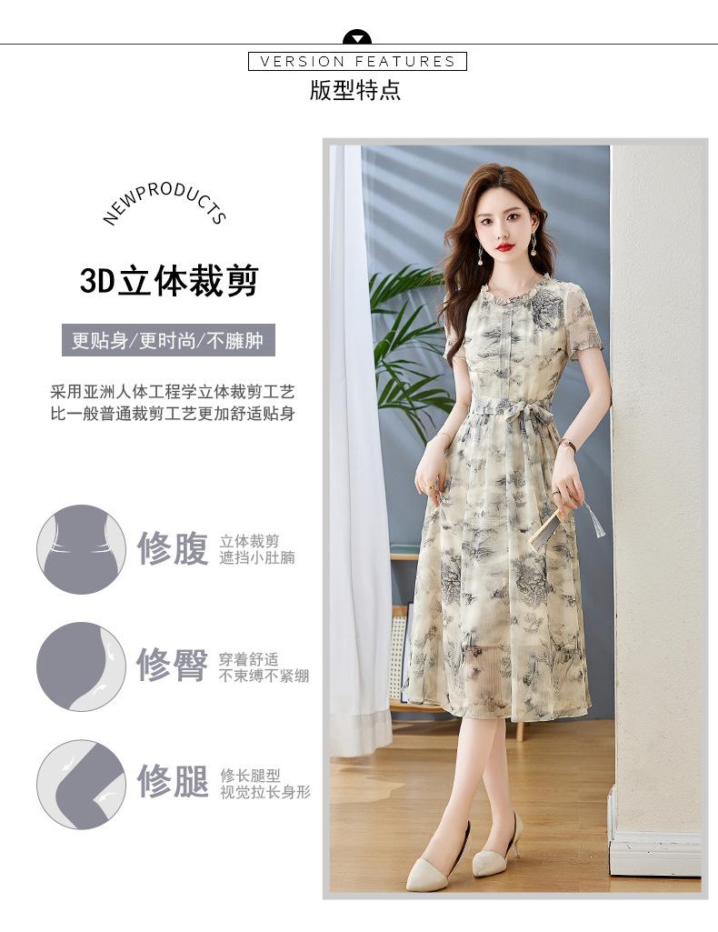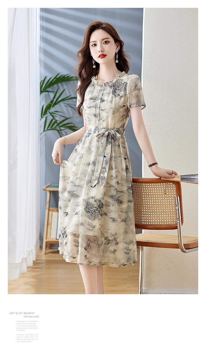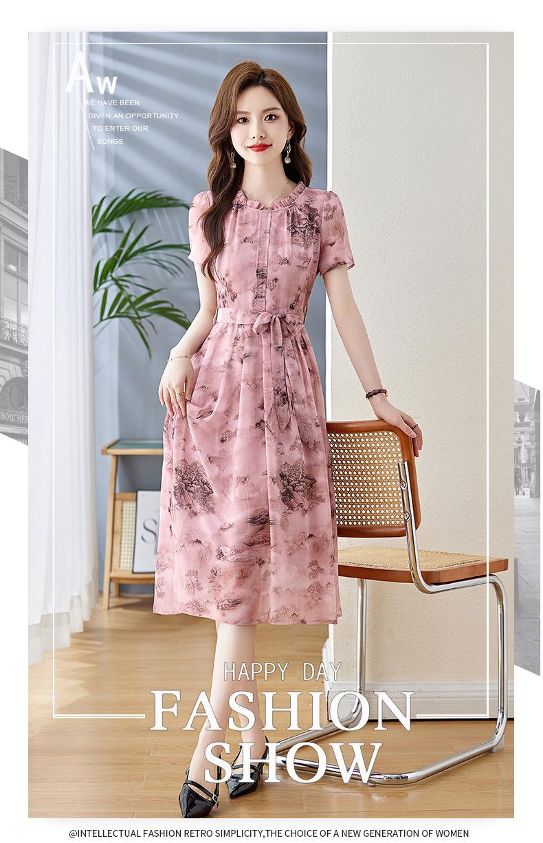 Vestido Floral de Seda de Morera, Falda de Encaje Moderna y Elegante con Cuello Redondo, Ropa de Trabajo Diaria Elegante, Falda Larga Generosa con Cordones