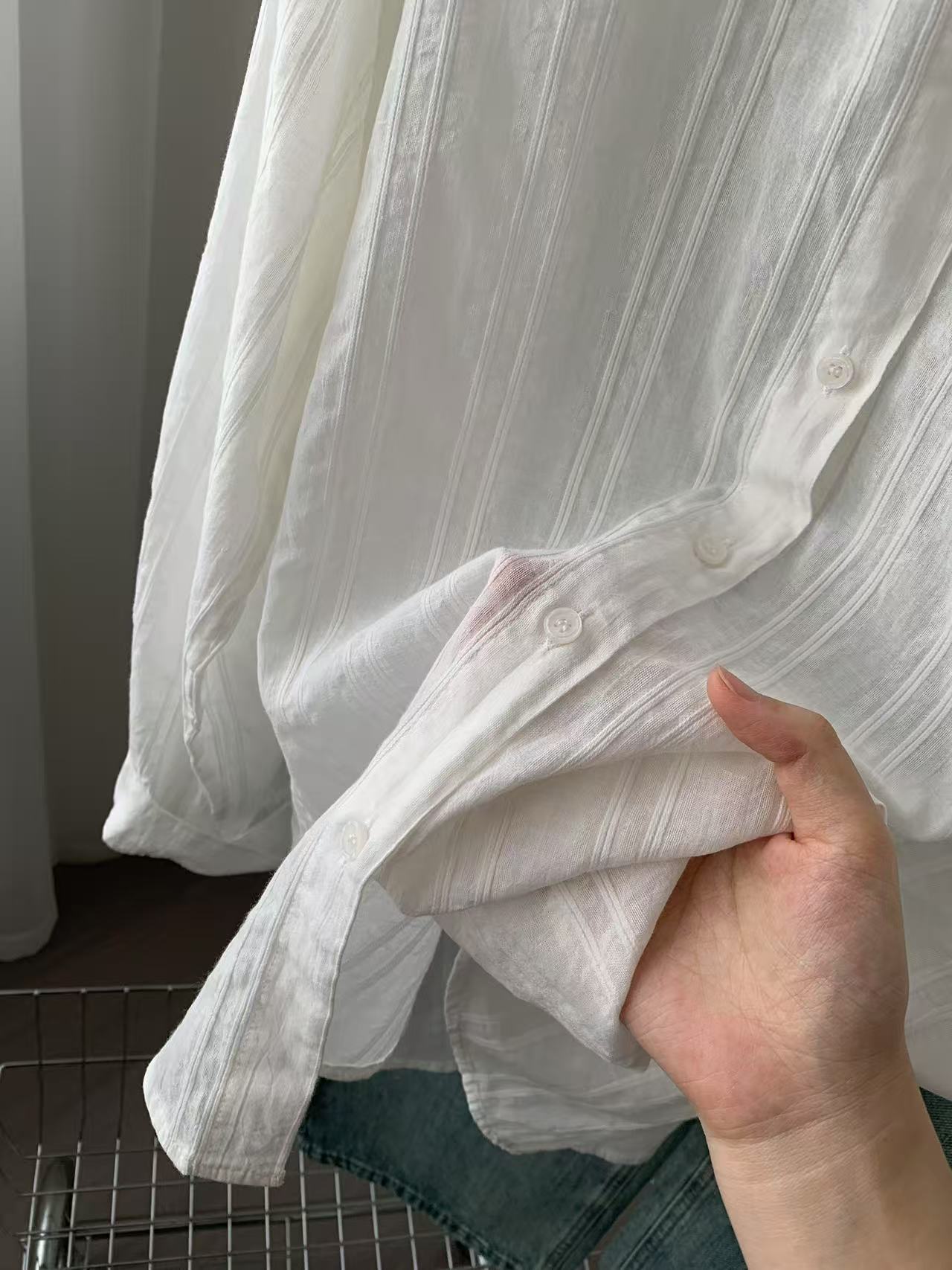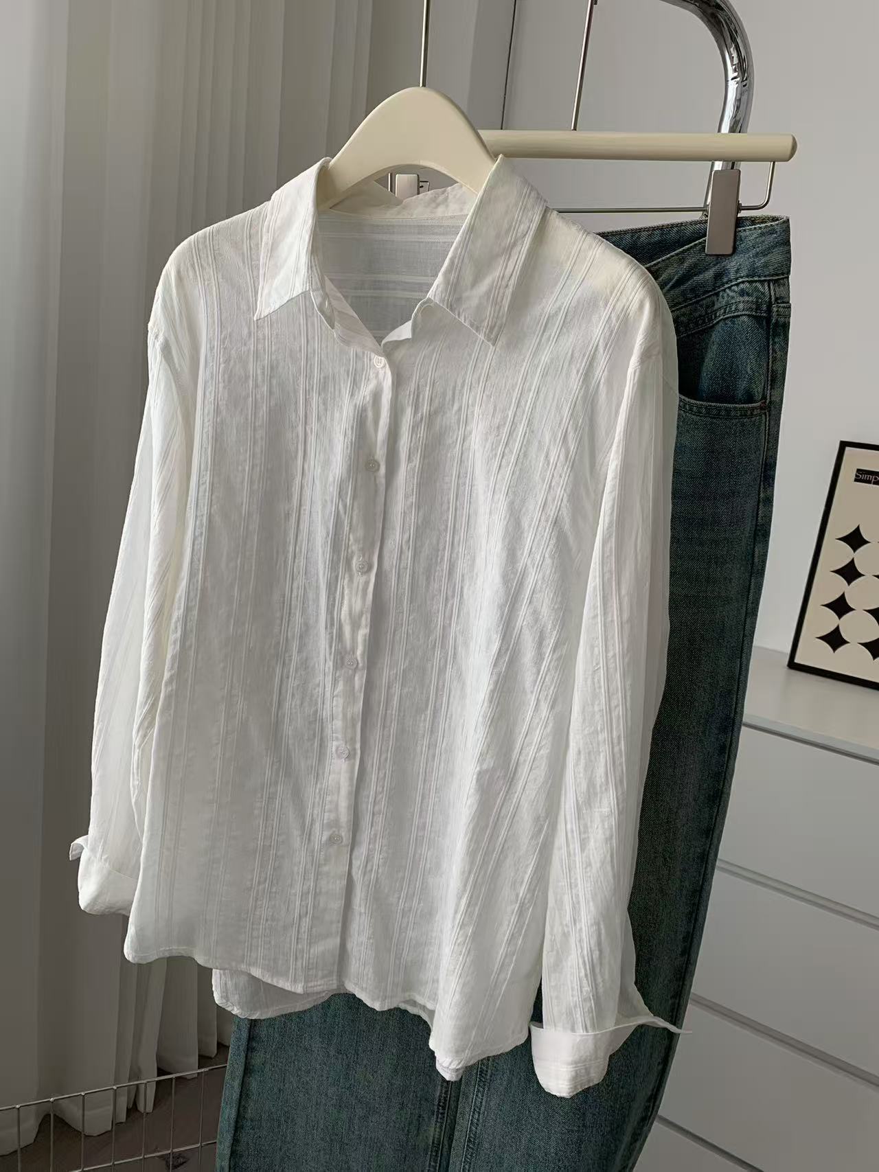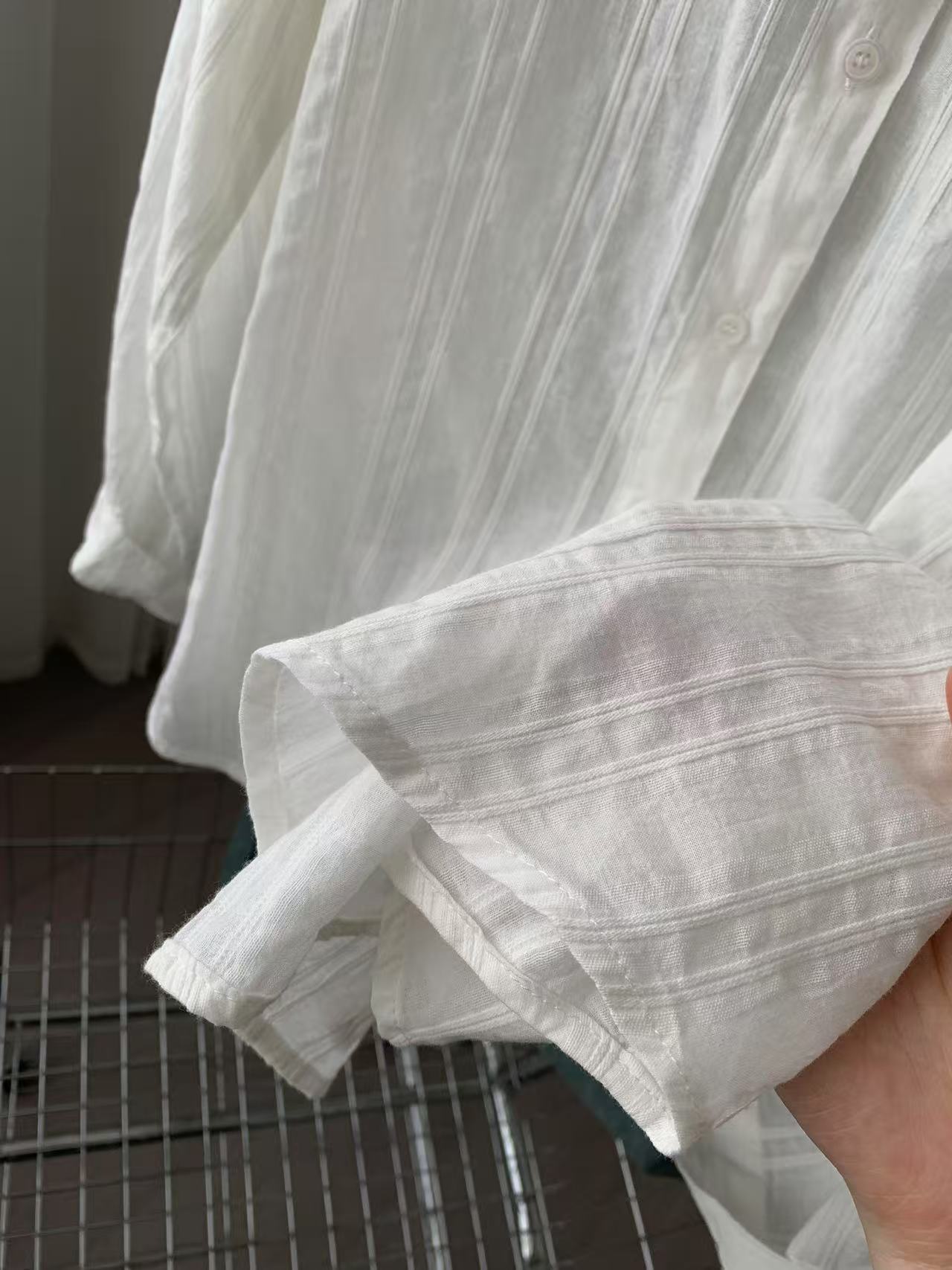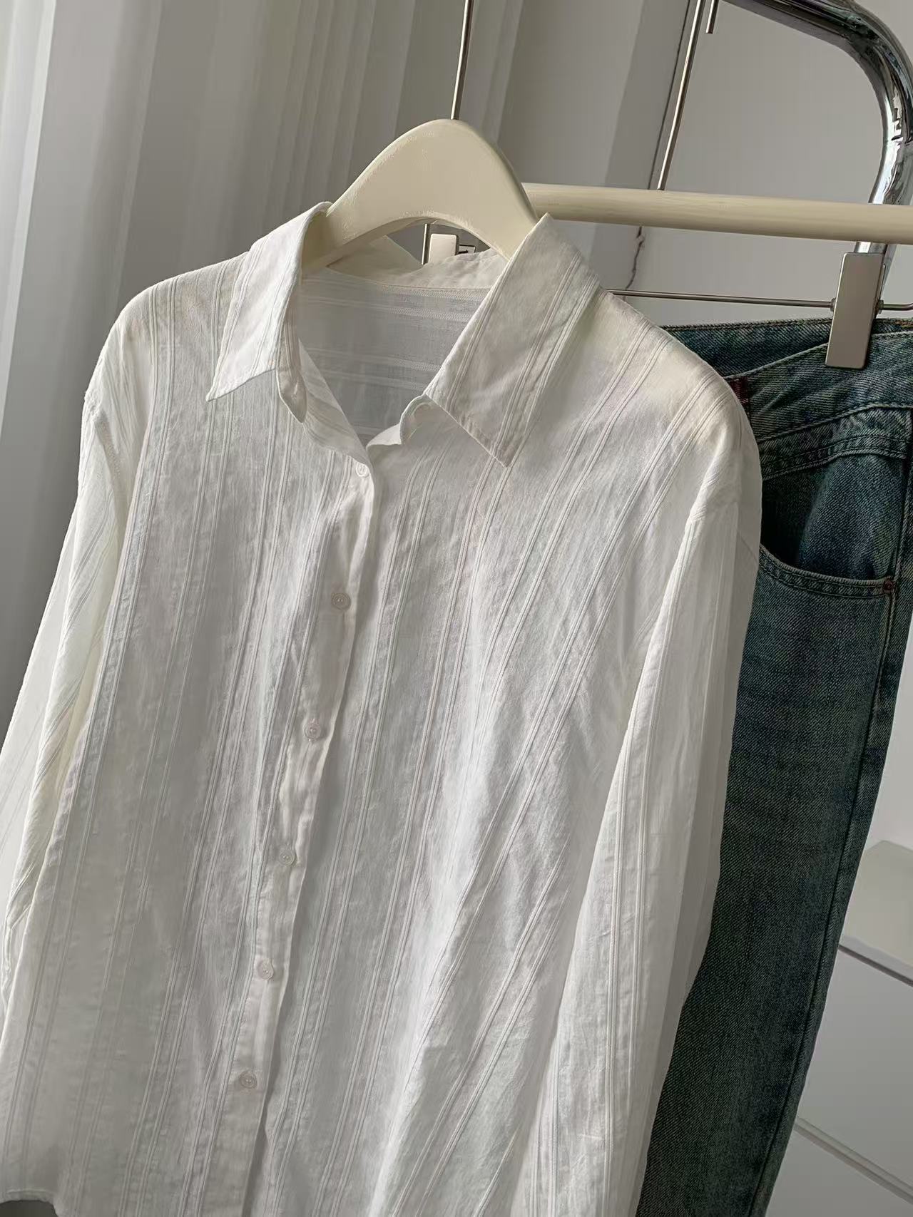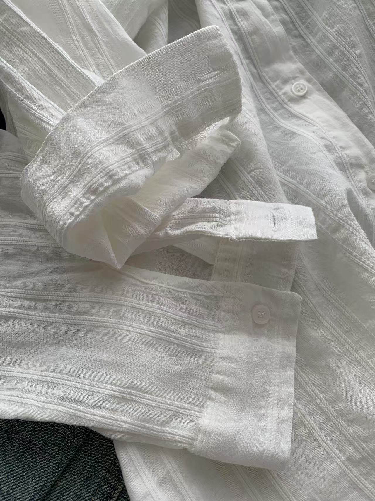 Camisa blanca de algodón puro de alta calidad para mujer, ligera, transpirable, textura de rayas verticales, cárdigan protector solar, temperamento de verano, estilo literario