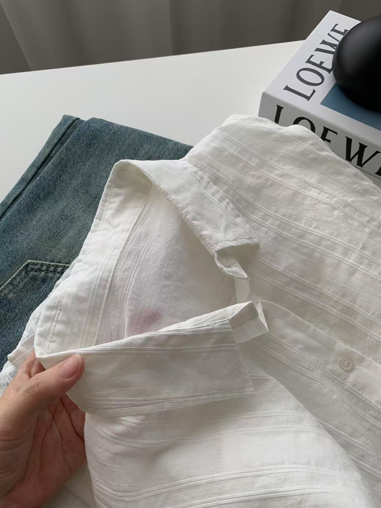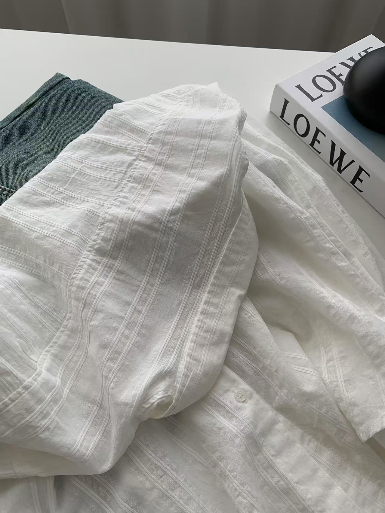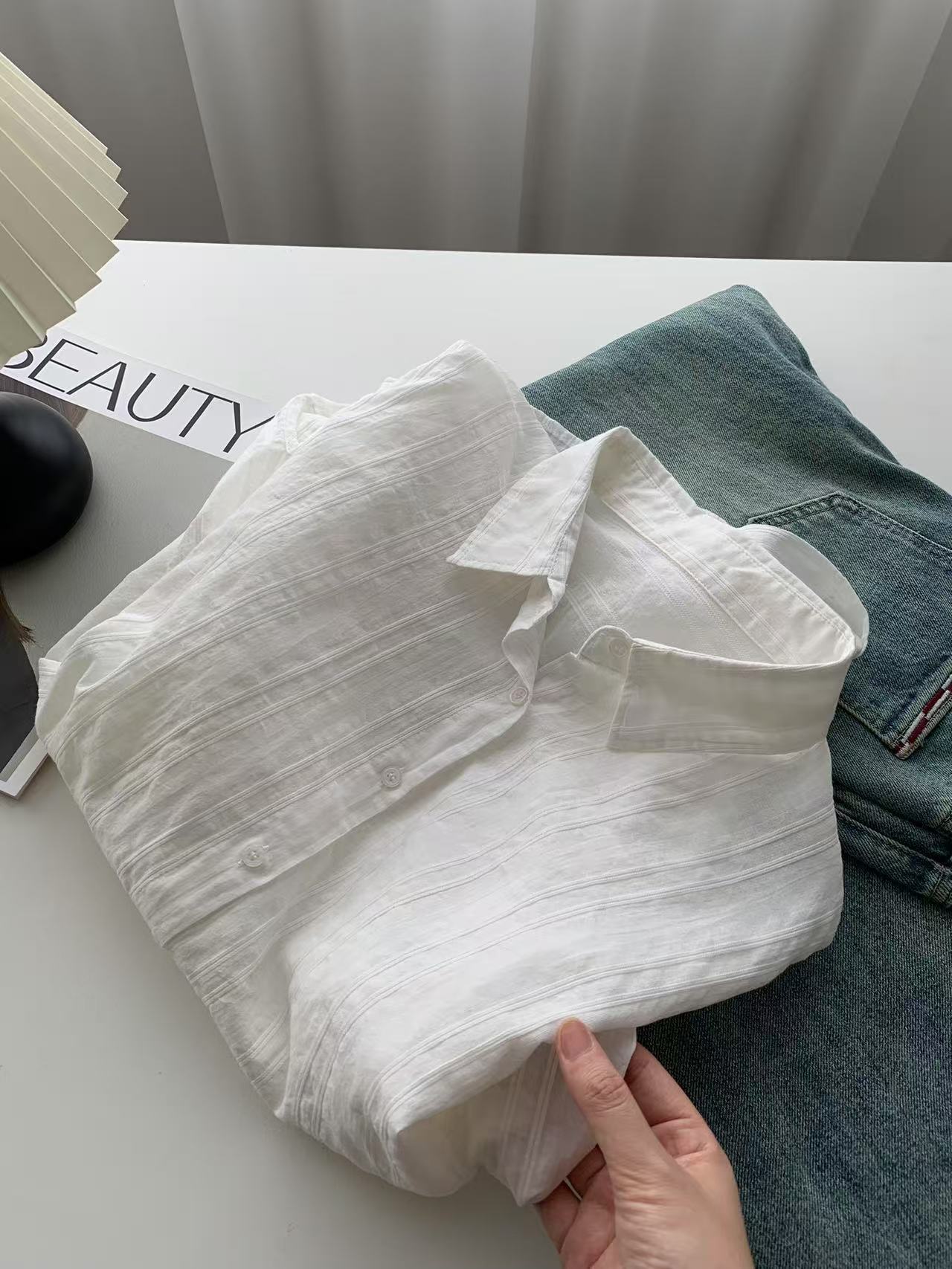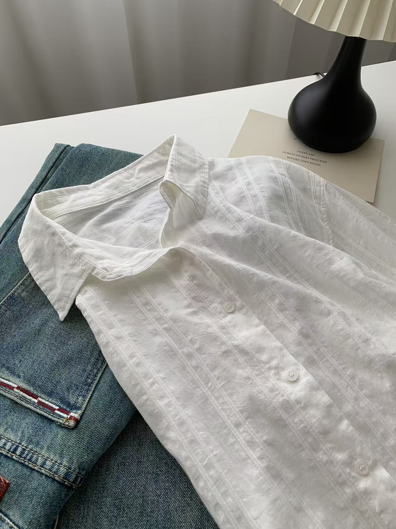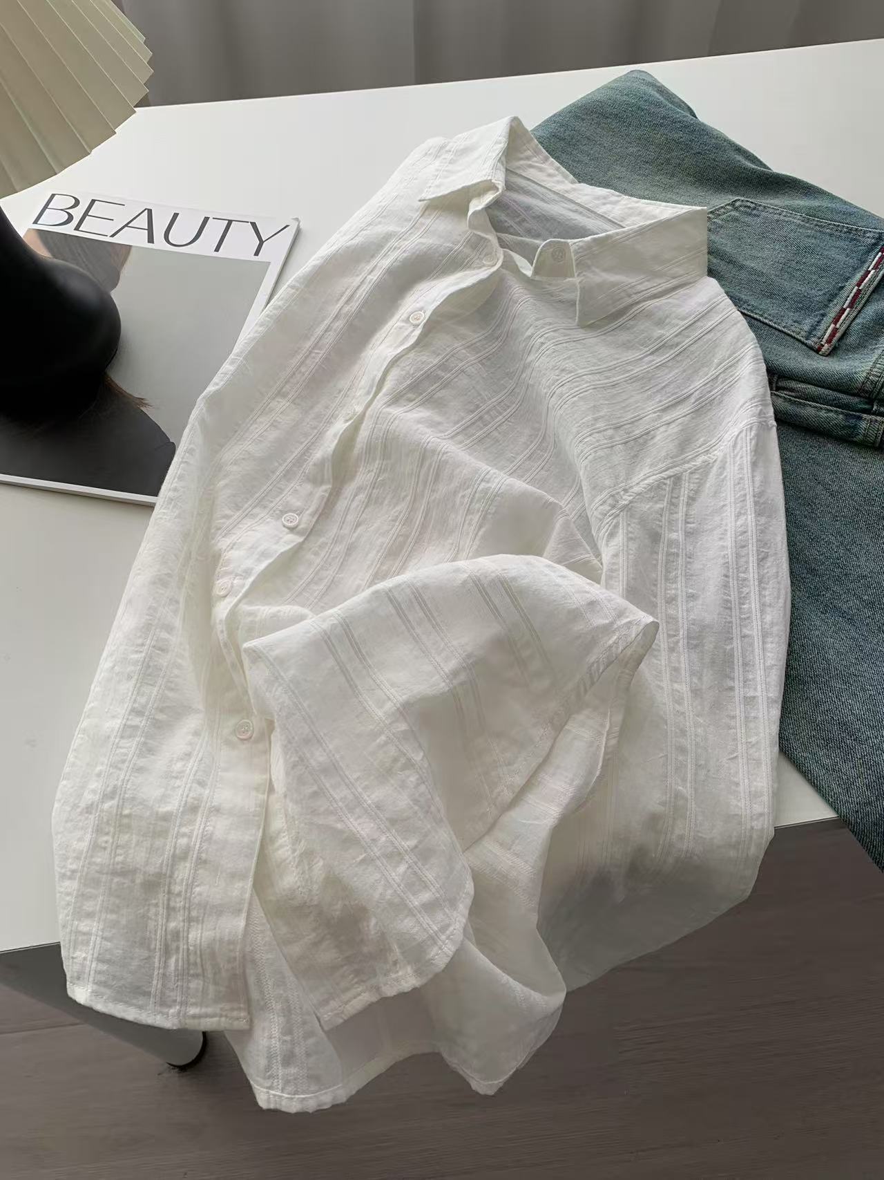 Camisa blanca de algodón puro de alta calidad para mujer, ligera, transpirable, textura de rayas verticales, cárdigan protector solar, temperamento de verano, estilo literario