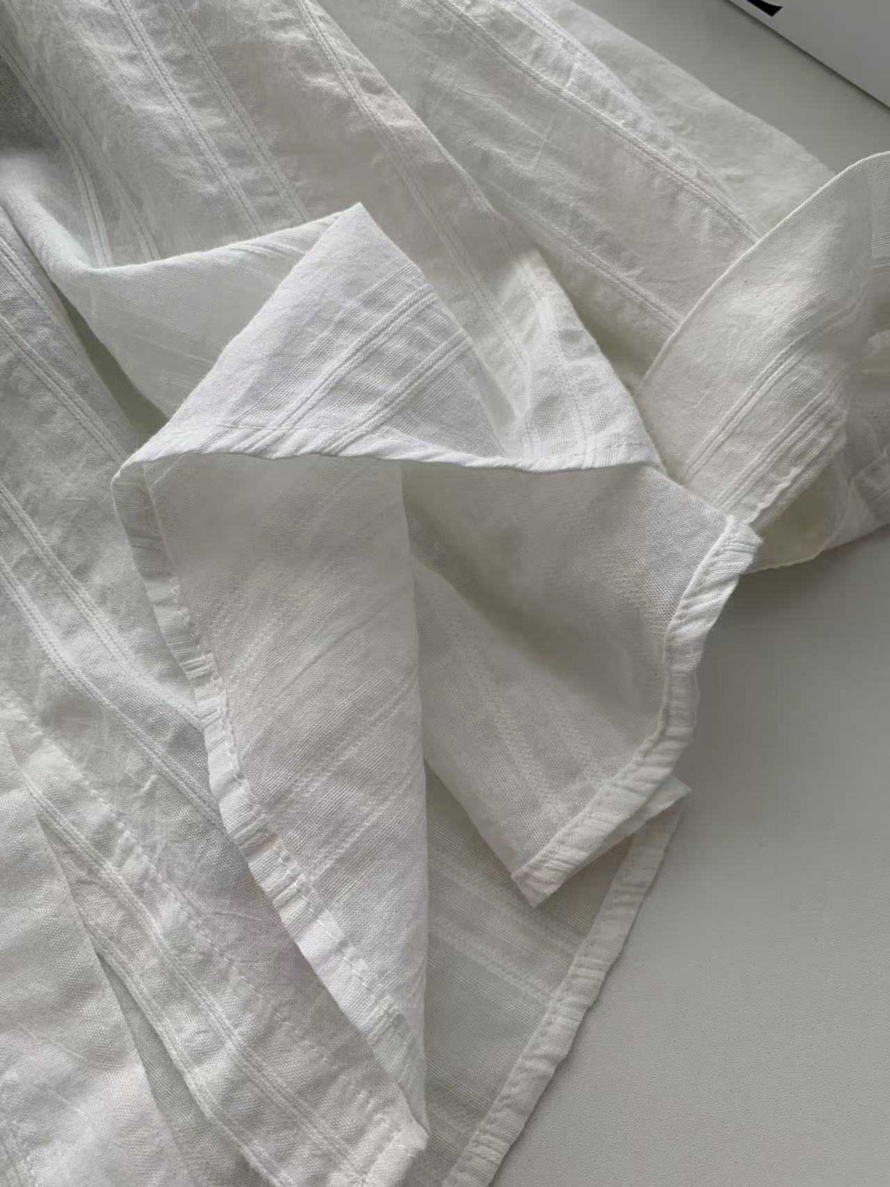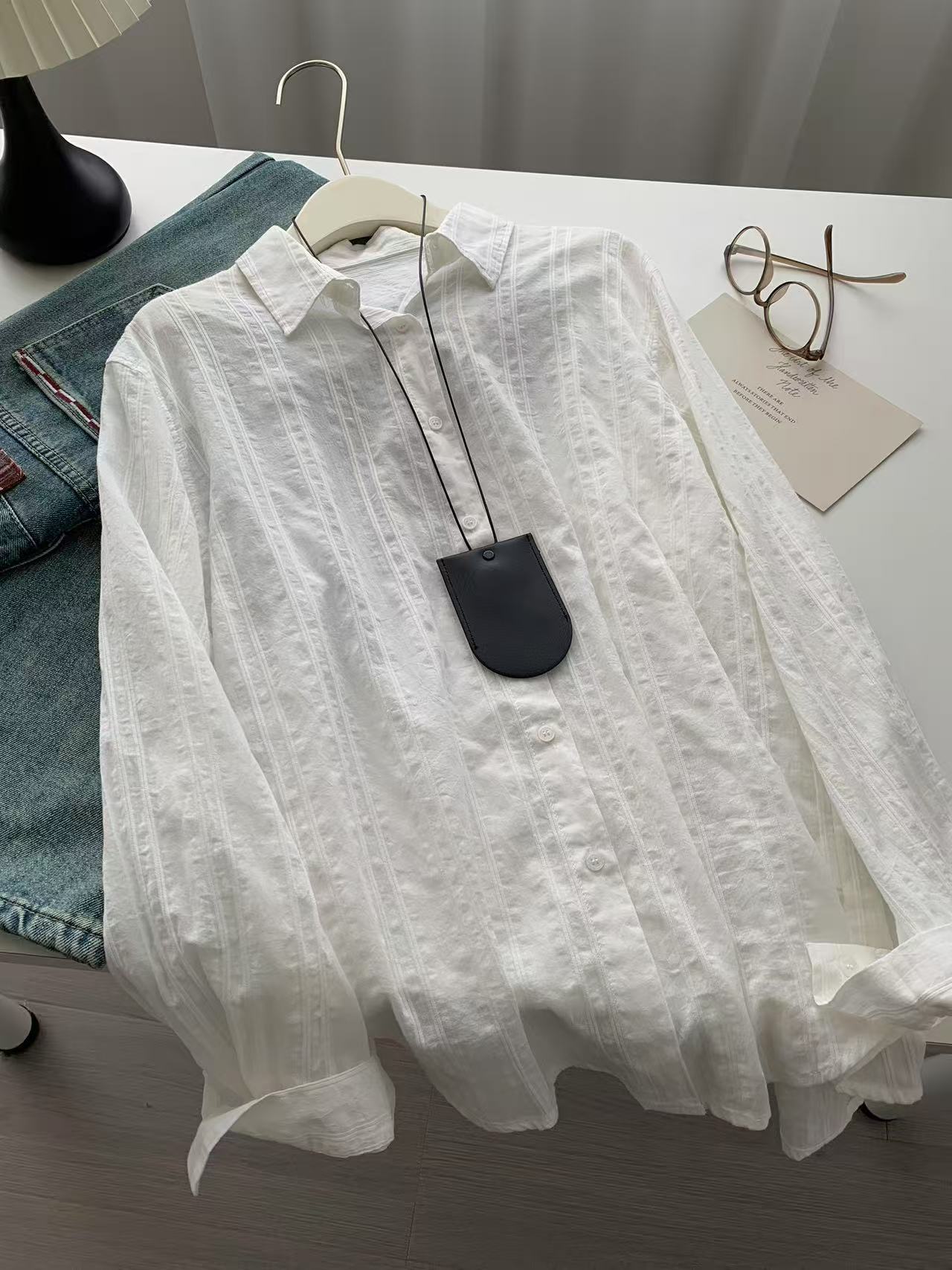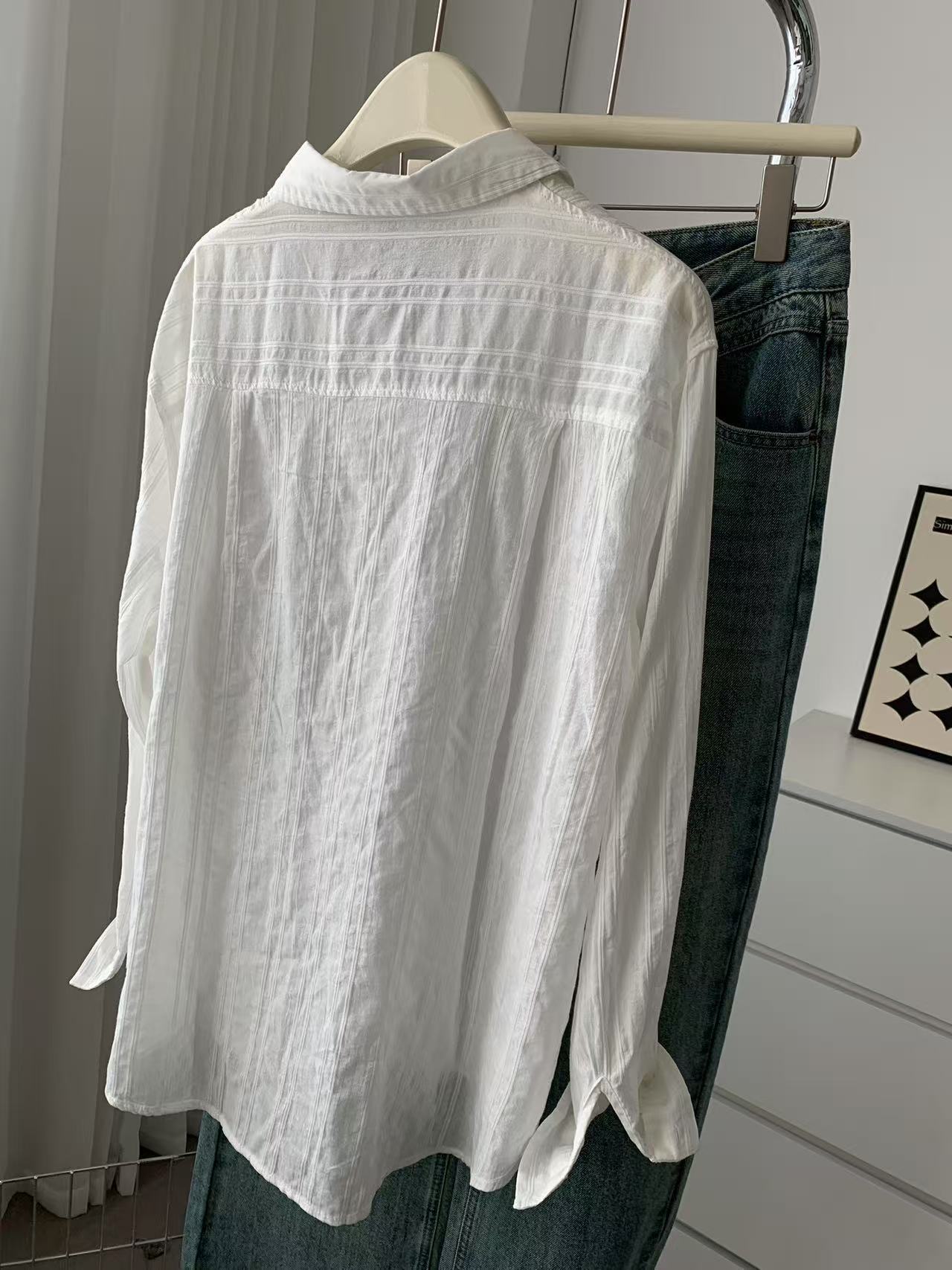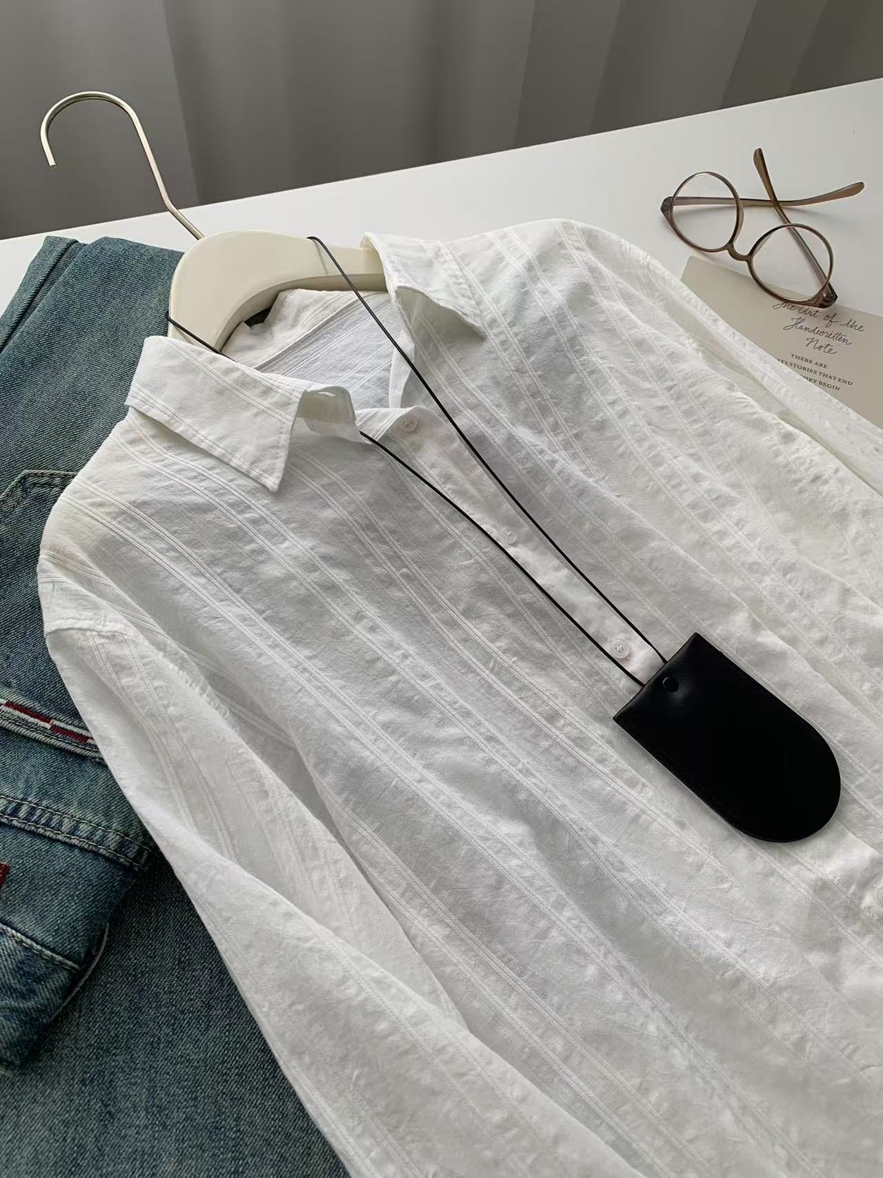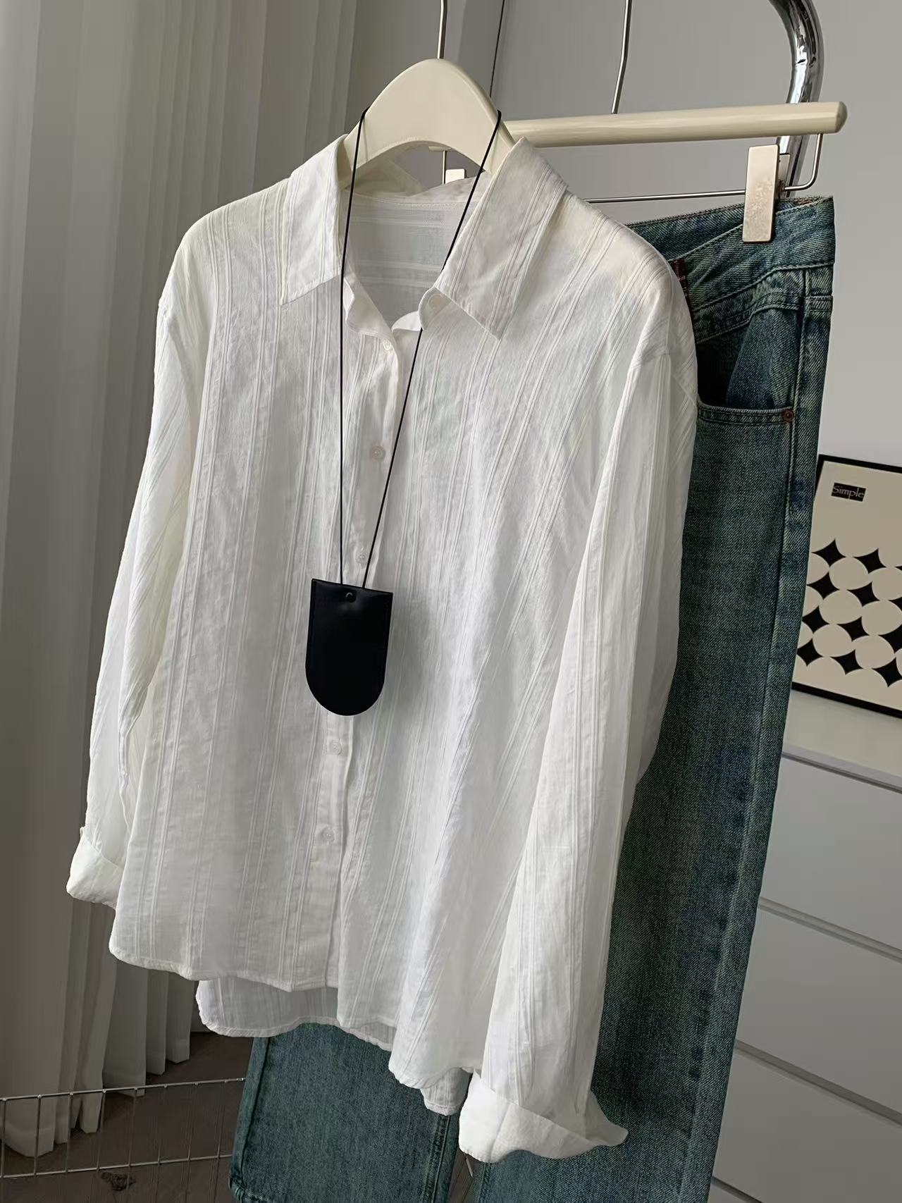 Camisa blanca de algodón puro de alta calidad para mujer, ligera, transpirable, textura de rayas verticales, cárdigan protector solar, temperamento de verano, estilo literario
